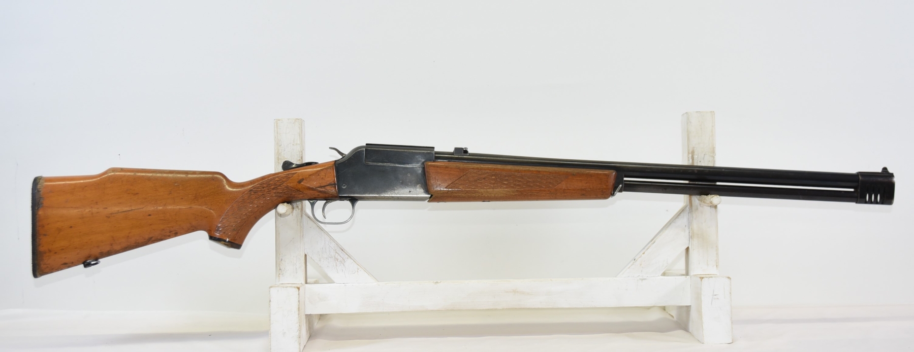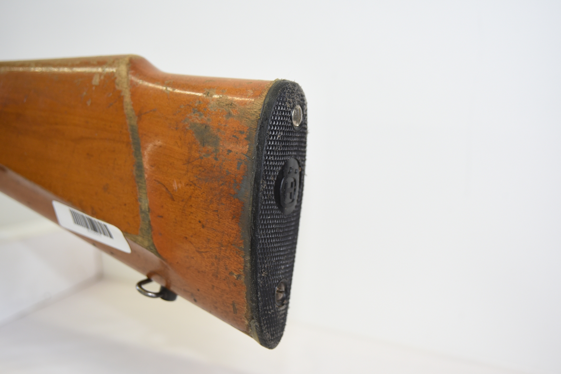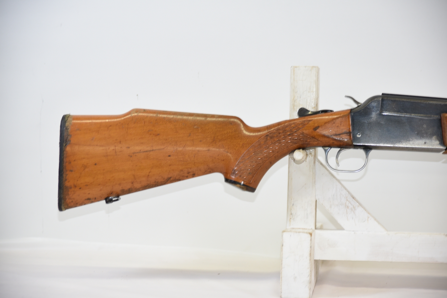 Wood stock shows scratches, finish wear, shows chips and repair work done by butt plate, cracks in the grip area, scuffs, light dents, finish wear in various areas throughout; condition is less than fair.