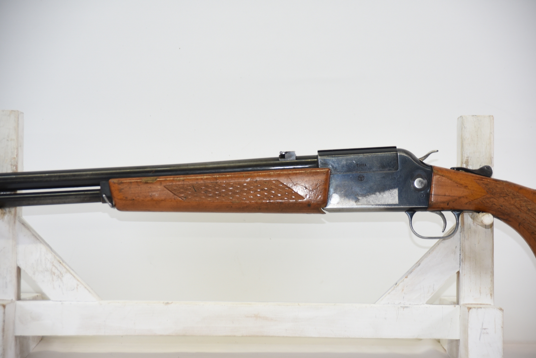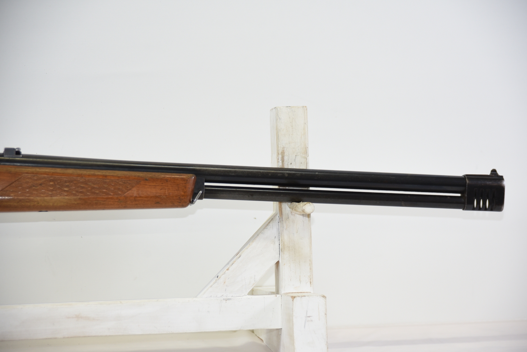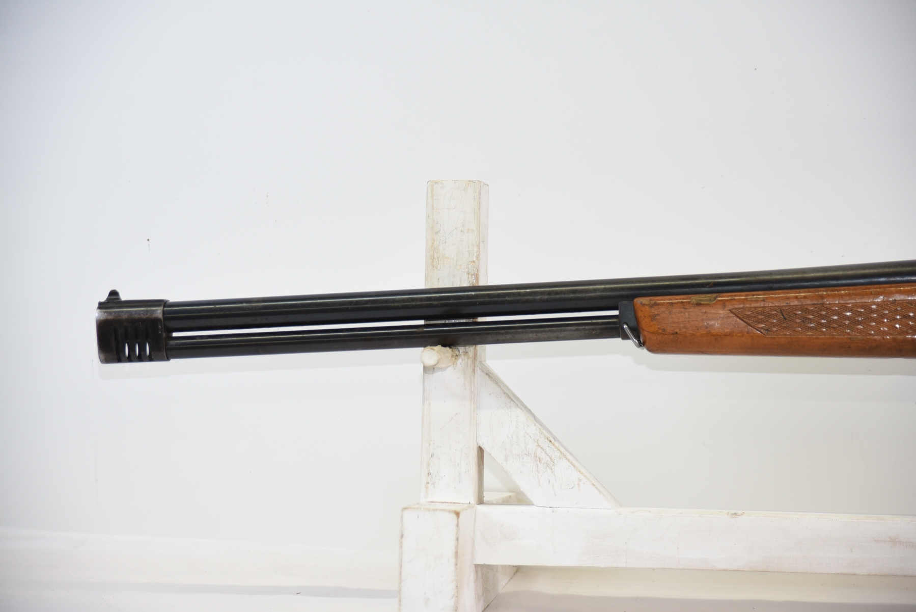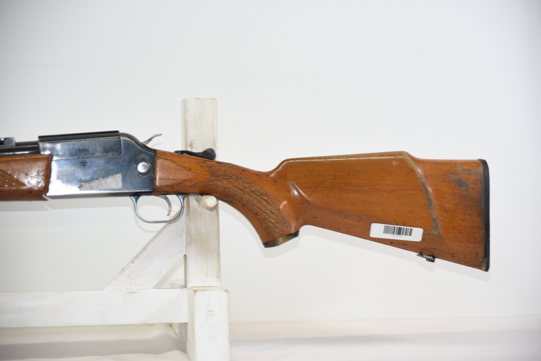 Wood stock shows scratches, finish wear, shows chips and repair work done by butt plate, cracks in the grip area, scuffs, light dents, finish wear in various areas throughout; condition is less than fair.