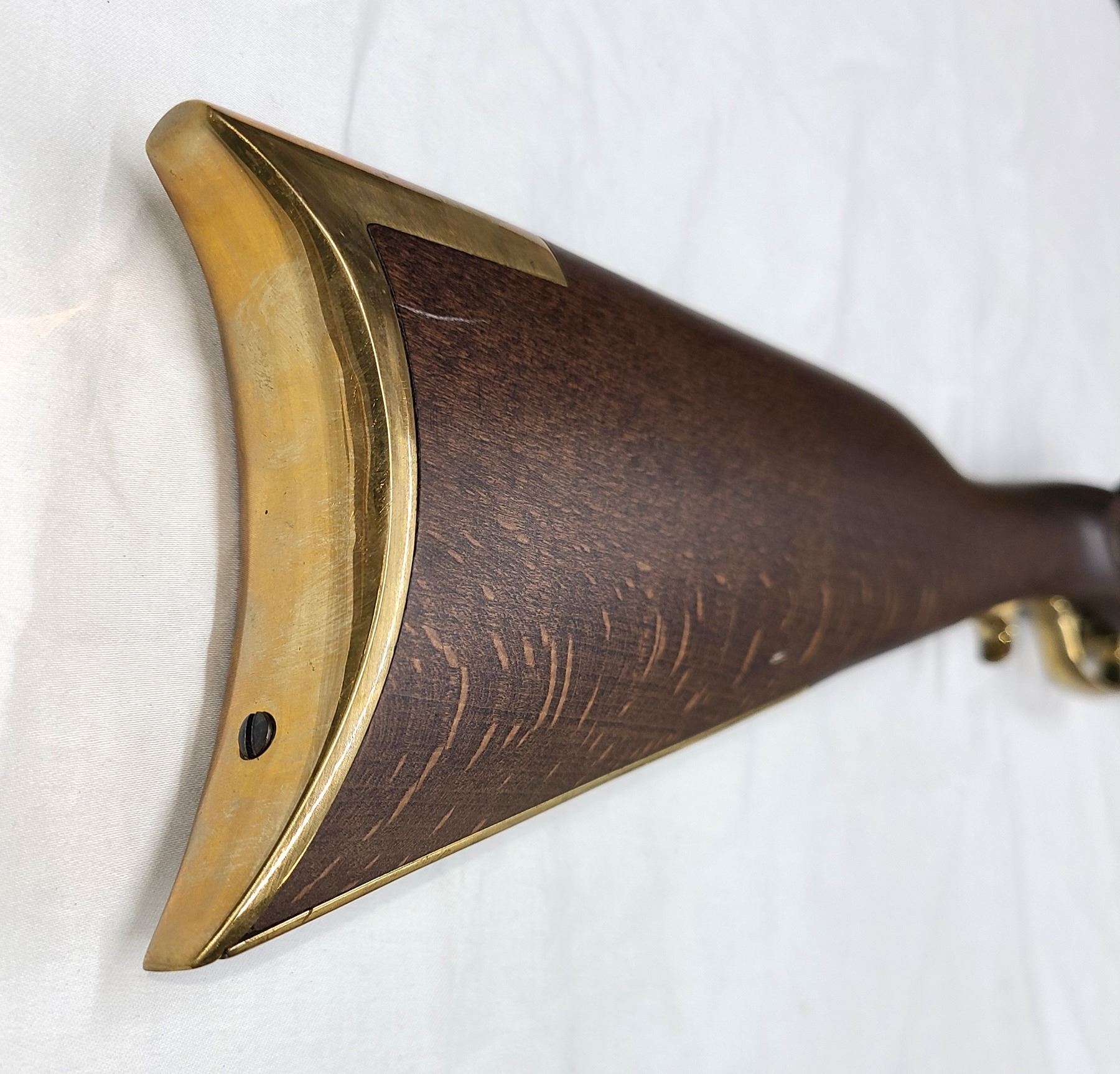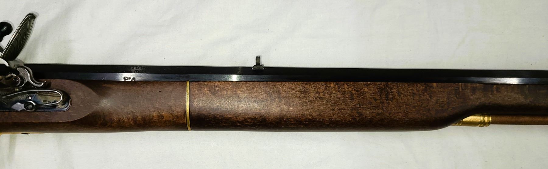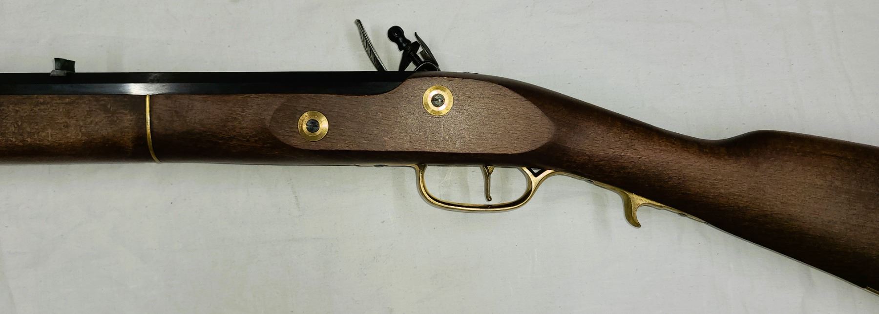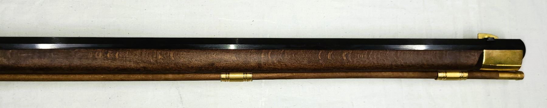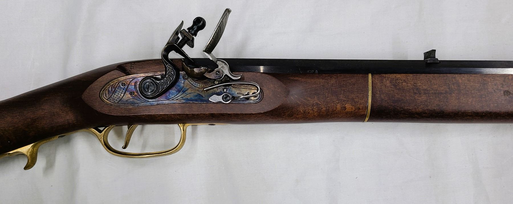 The 33.5 inch blued octagonal barrel has a flintlock ignition system and is rifled at