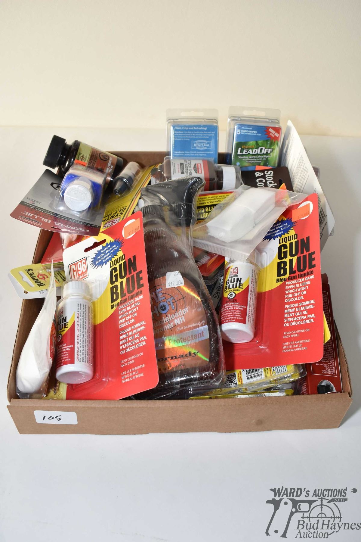 Tray lot of new in package cleaning supplies including oils, grease, assorted barrel caliber brushes