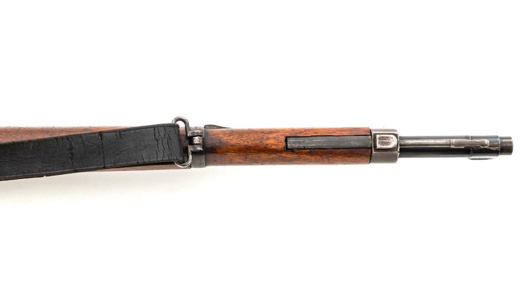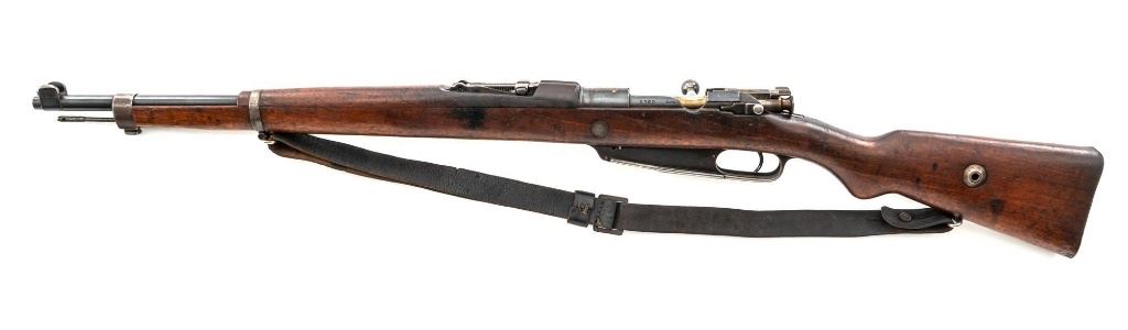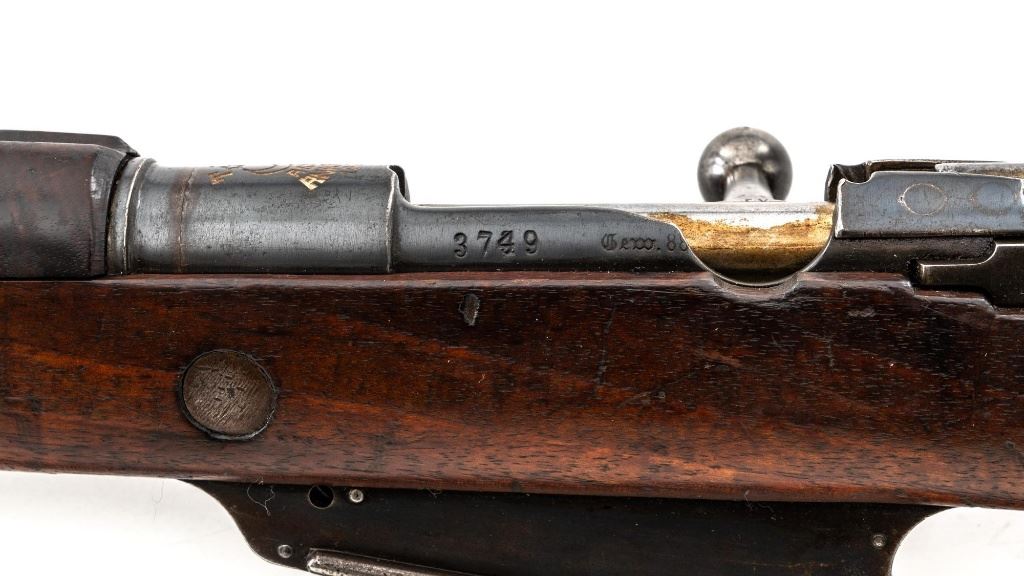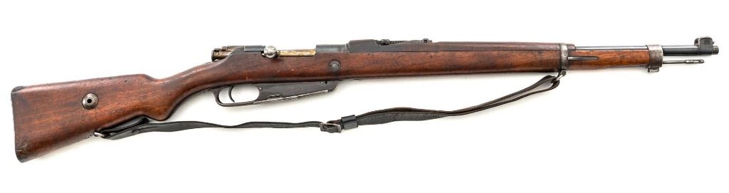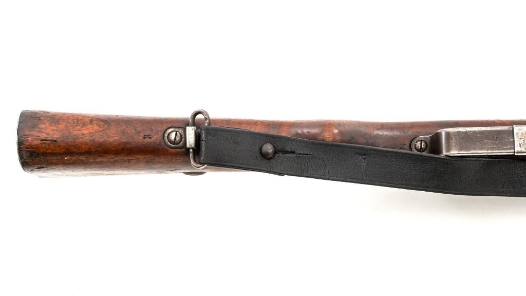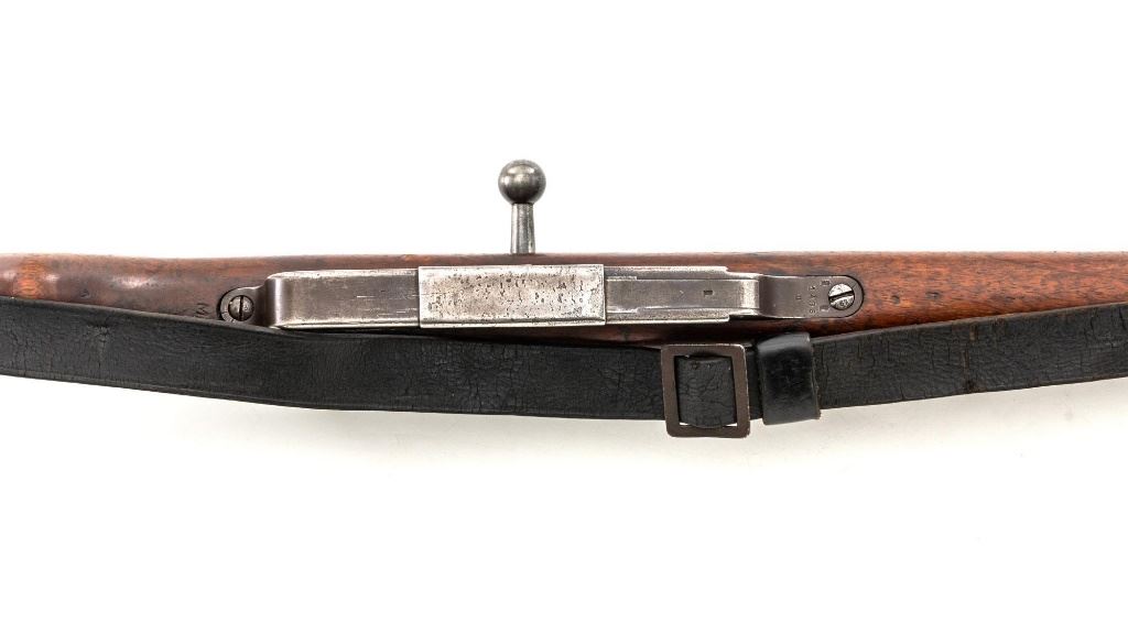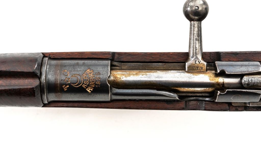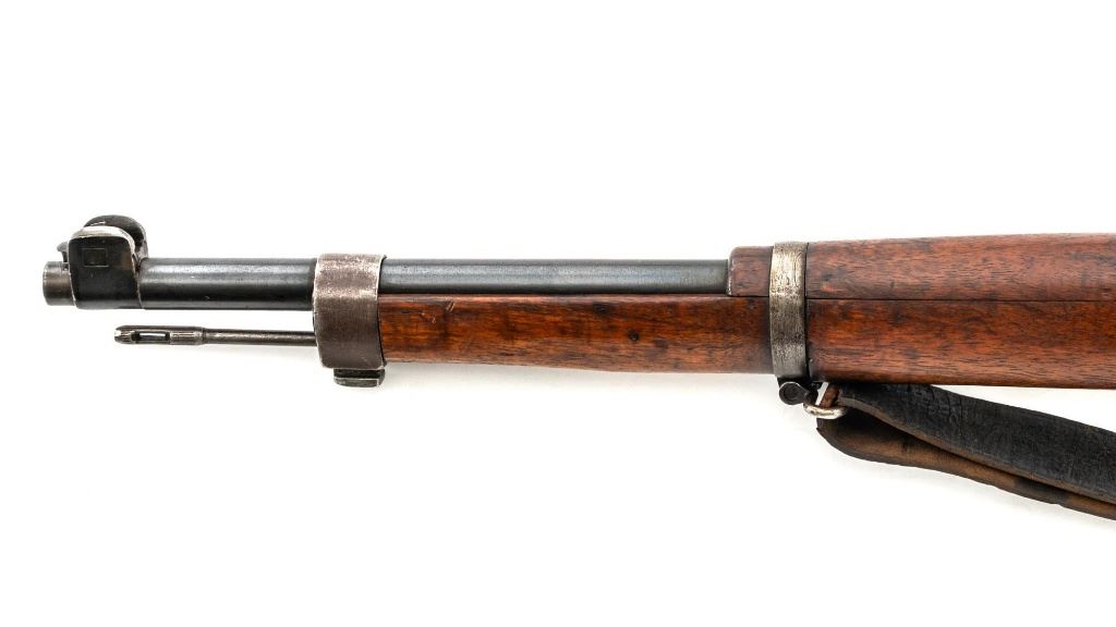 Turkish Model 1935 Mauser Bolt Action Rifle, #3749, 8x57mm cal., 23.75" barrel, blued finish with bright bolt assembly, hardwood stock and handguard, inverted-"V" front sight, and adjustable tangent rear sight with "V"-notched groove, graduated to 2000 meters. Steel cleaning rod is present; screw stem has been removed. Also includes a black leather sling, in fair condition, showing age and wear. Rifle has been modified from a German GEW 88 Commission rifle. Top of receiver ring is marked "TC/(Turkish crest)/AS.FA/ANKARA/1935". Left side of the receiver rail with partially visible "GEW.88". Rear barrel band stamped with German regimental markings. Matching numbers on rear sight assembly. Trigger guard is numbered but does not match. Turkish numbers stamped on bolt assembly. No visible import marks. Condition overall is very good, retaining approx. 80% thinning and toning blue. Most of the wear occurs on the barrel bands, magazine, and buttplate. There are small cracks to the top of the stock wrist, behind the receiver tang. Wood is otherwise very good, showing handling marks and a few bruises. Action operates smoothly. Bore with good rifling. Est.: $300-$450. (Antique)