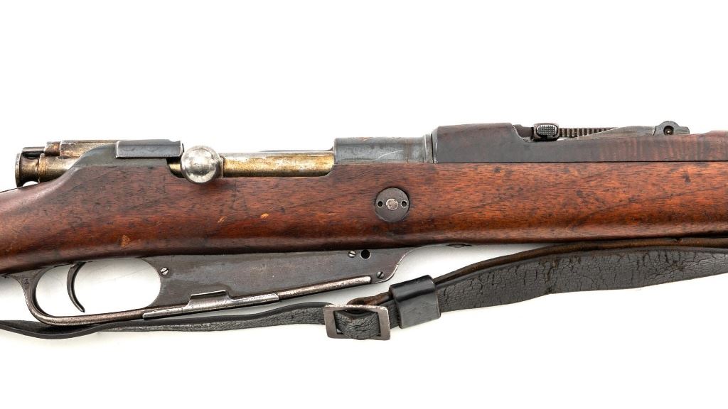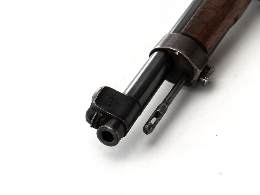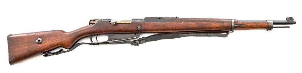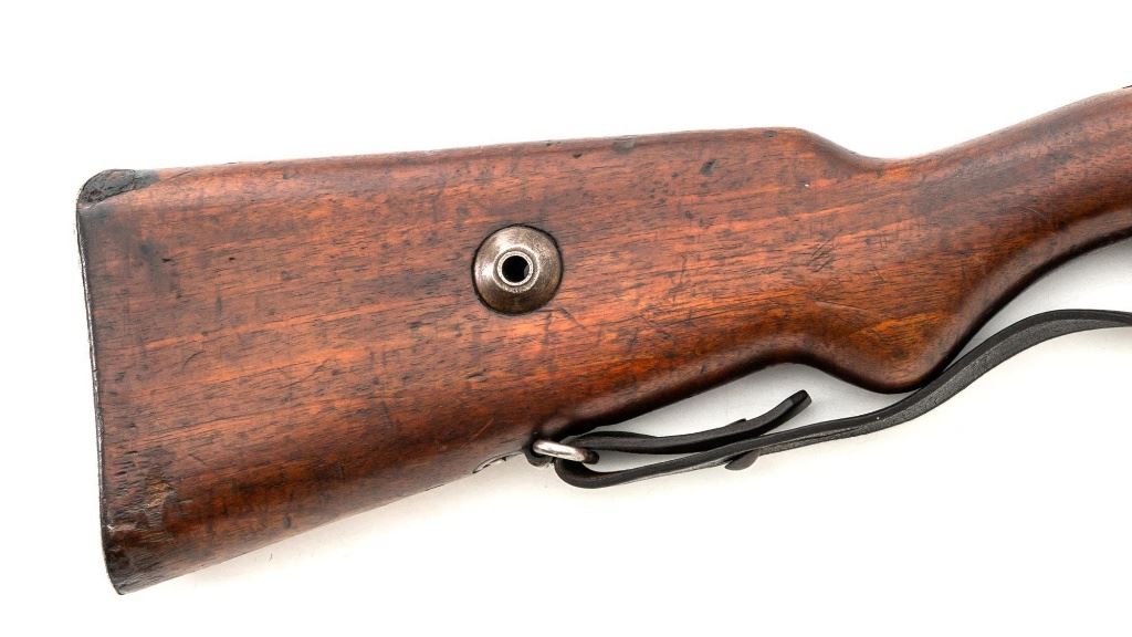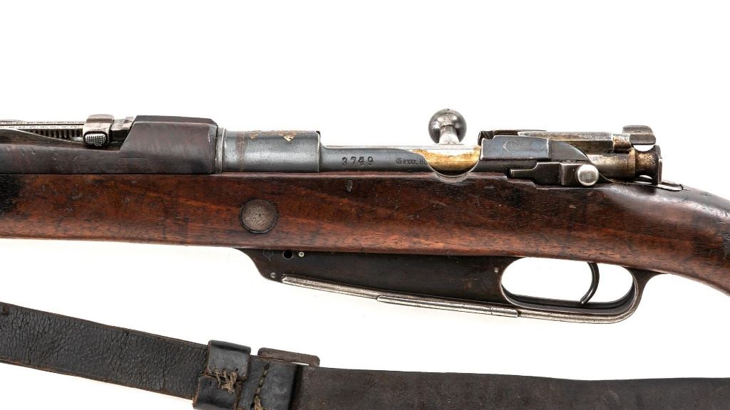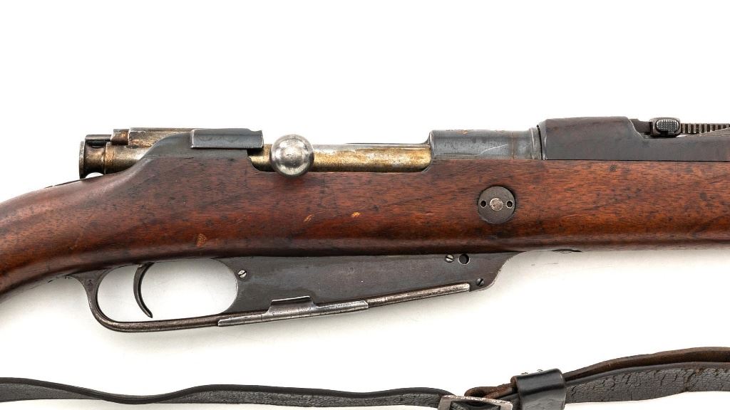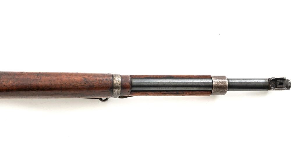 Turkish Model 1935 Mauser Bolt Action Rifle, #3749, 8x57mm cal., 23.75" barrel, blued finish with bright bolt assembly, hardwood stock and handguard, inverted-"V" front sight, and adjustable tangent rear sight with "V"-notched groove, graduated to 2000 meters. Steel cleaning rod is present; screw stem has been removed. Also includes a black leather sling, in fair condition, showing age and wear. Rifle has been modified from a German GEW 88 Commission rifle. Top of receiver ring is marked "TC/(Turkish crest)/AS.FA/ANKARA/1935". Left side of the receiver rail with partially visible "GEW.88". Rear barrel band stamped with German regimental markings. Matching numbers on rear sight assembly. Trigger guard is numbered but does not match. Turkish numbers stamped on bolt assembly. No visible import marks. Condition overall is very good, retaining approx. 80% thinning and toning blue. Most of the wear occurs on the barrel bands, magazine, and buttplate. There are small cracks to the top of the stock wrist, behind the receiver tang. Wood is otherwise very good, showing handling marks and a few bruises. Action operates smoothly. Bore with good rifling. Est.: $300-$450. (Antique)