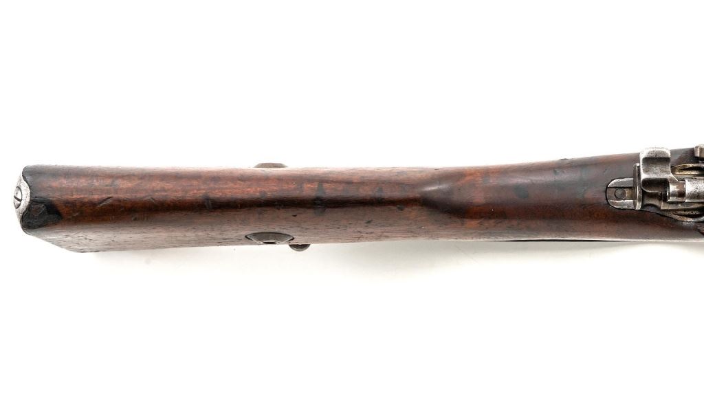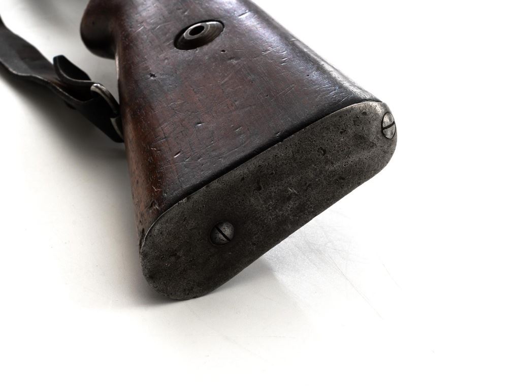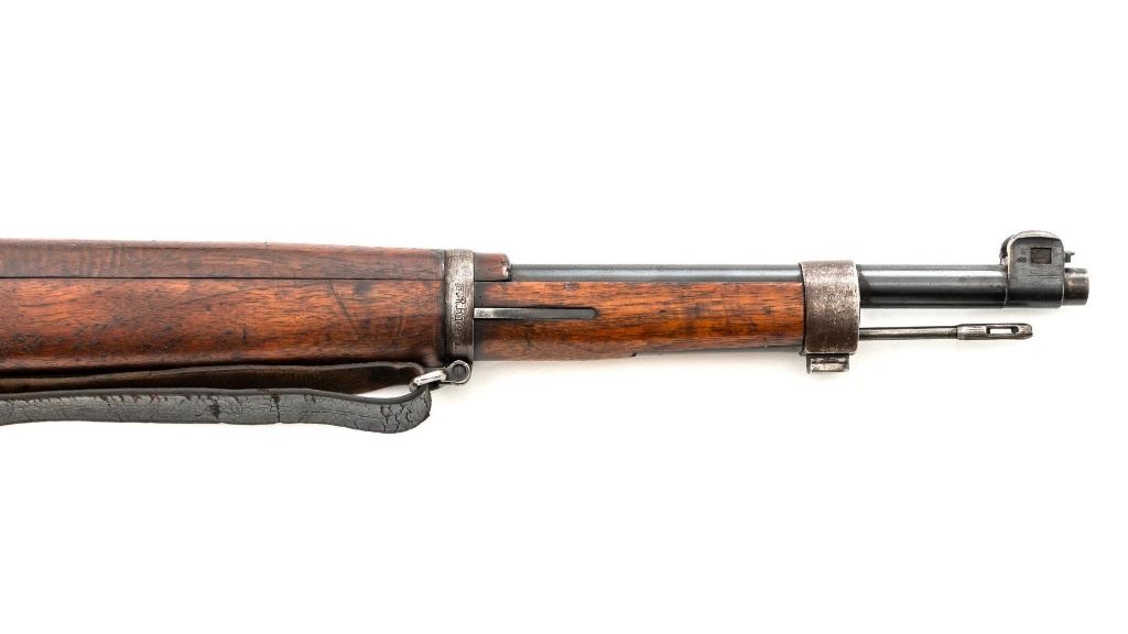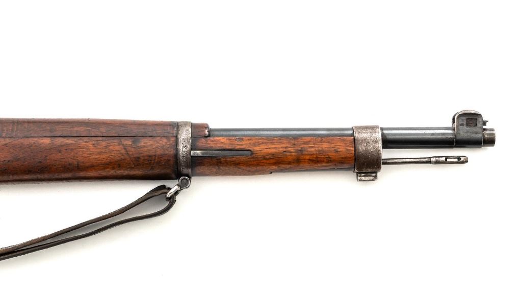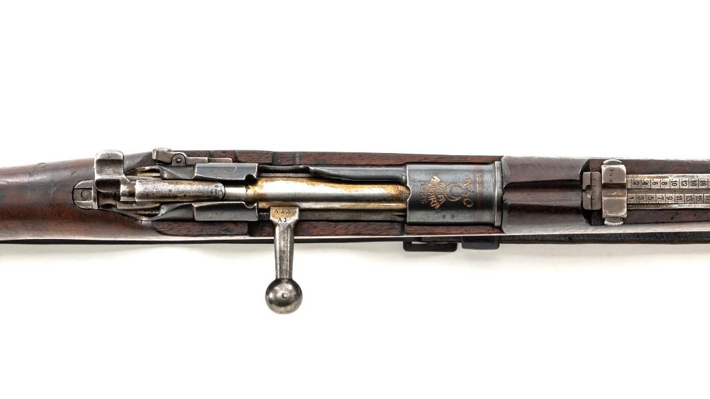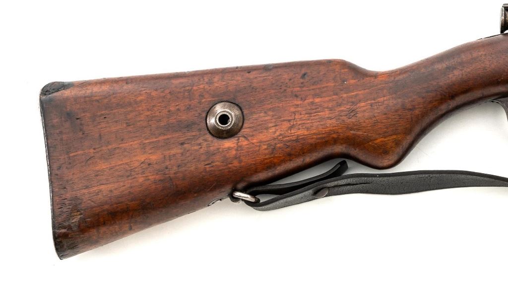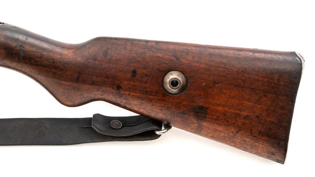 Turkish Model 1935 Mauser Bolt Action Rifle, #3749, 8x57mm cal., 23.75" barrel, blued finish with bright bolt assembly, hardwood stock and handguard, inverted-"V" front sight, and adjustable tangent rear sight with "V"-notched groove, graduated to 2000 meters. Steel cleaning rod is present; screw stem has been removed. Also includes a black leather sling, in fair condition, showing age and wear. Rifle has been modified from a German GEW 88 Commission rifle. Top of receiver ring is marked "TC/(Turkish crest)/AS.FA/ANKARA/1935". Left side of the receiver rail with partially visible "GEW.88". Rear barrel band stamped with German regimental markings. Matching numbers on rear sight assembly. Trigger guard is numbered but does not match. Turkish numbers stamped on bolt assembly. No visible import marks. Condition overall is very good, retaining approx. 80% thinning and toning blue. Most of the wear occurs on the barrel bands, magazine, and buttplate. There are small cracks to the top of the stock wrist, behind the receiver tang. Wood is otherwise very good, showing handling marks and a few bruises. Action operates smoothly. Bore with good rifling. Est.: $300-$450. (Antique)