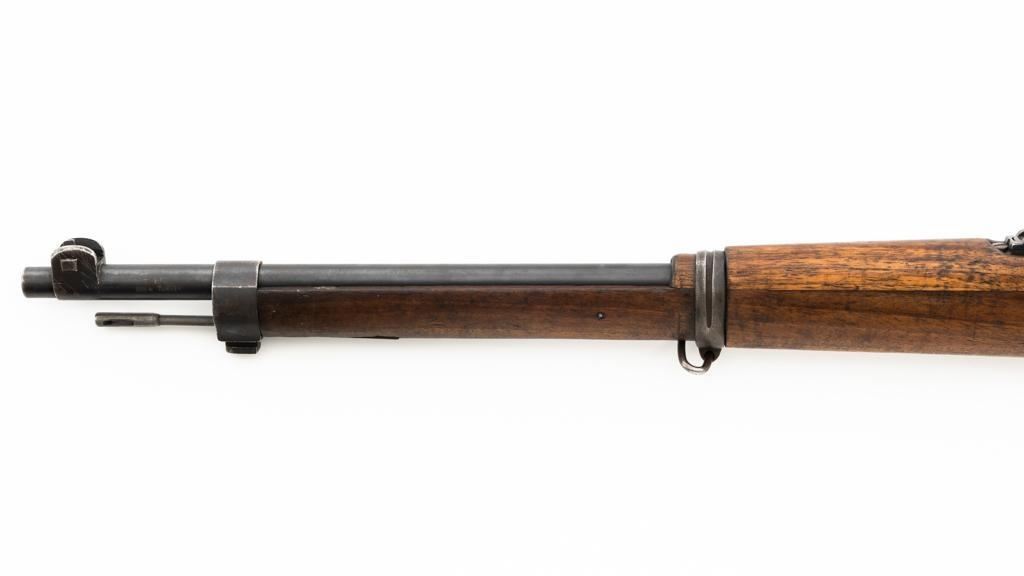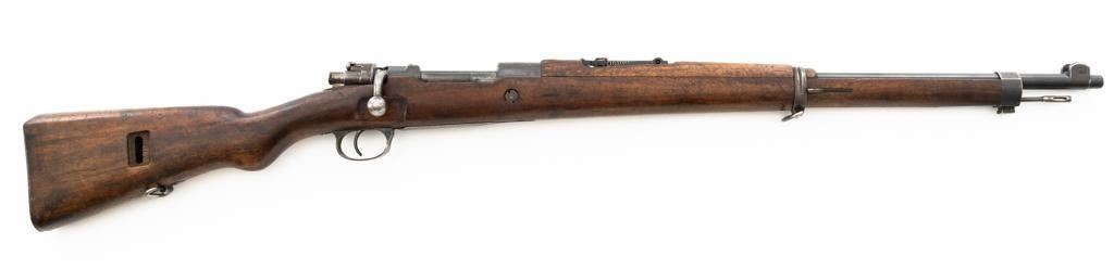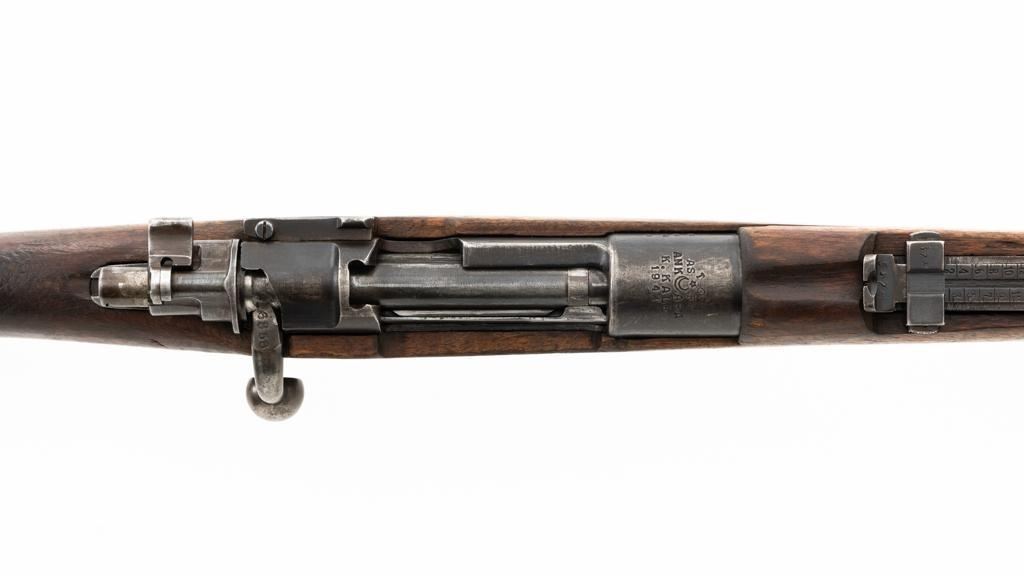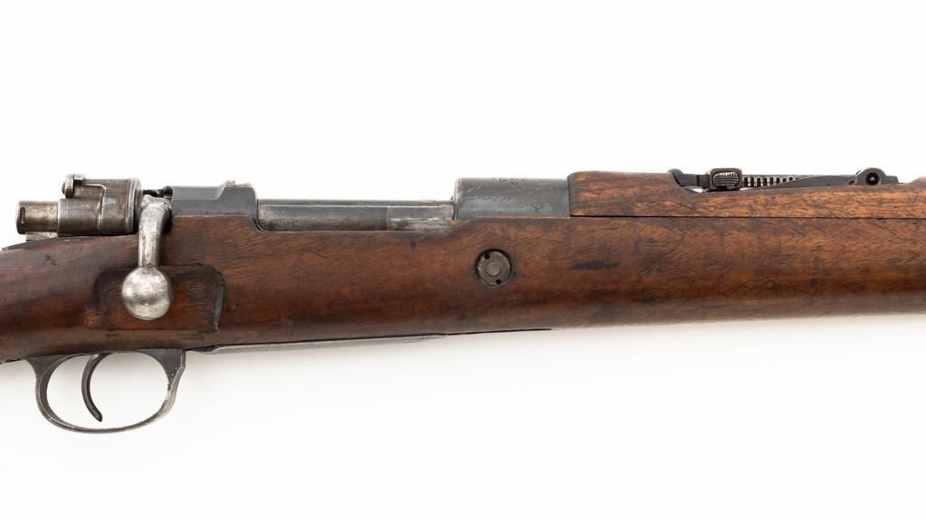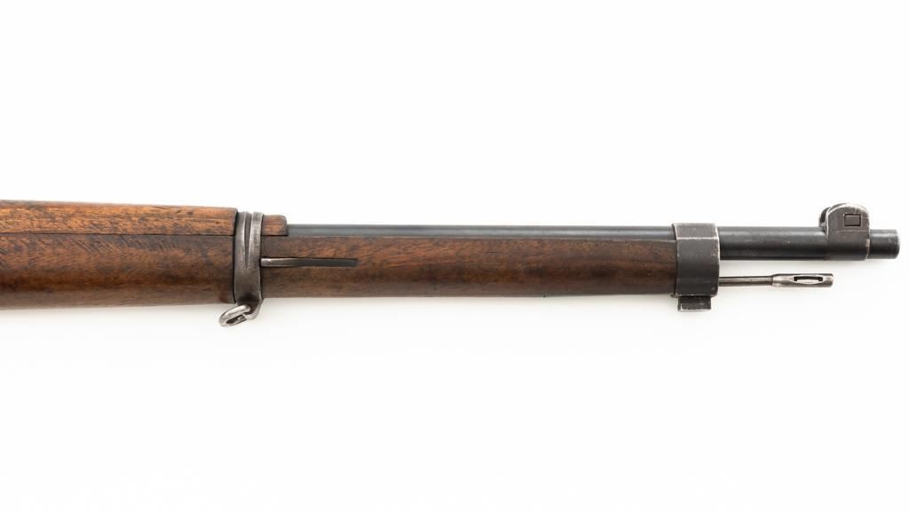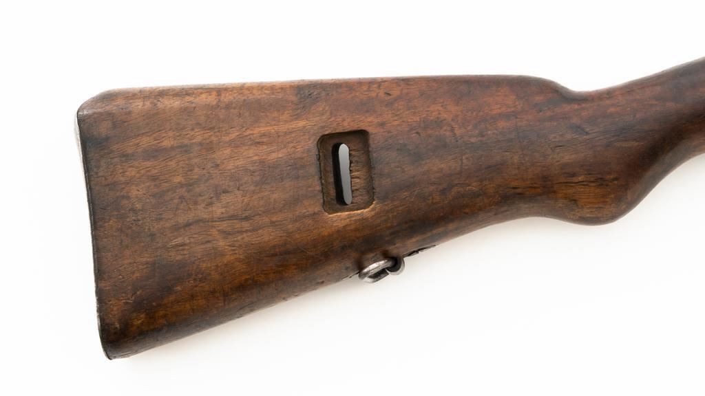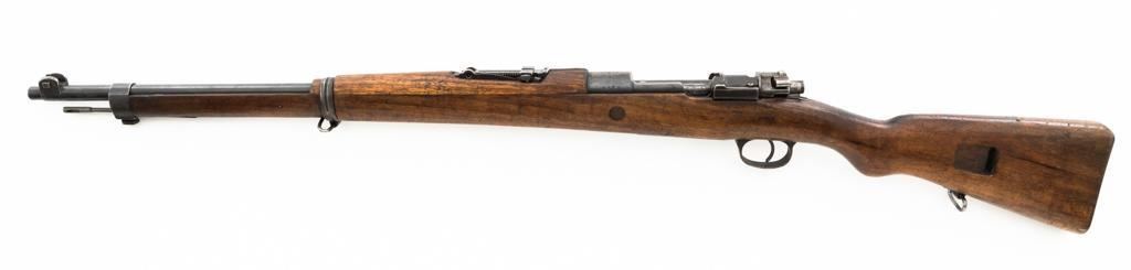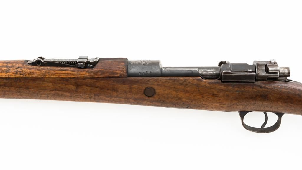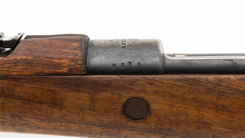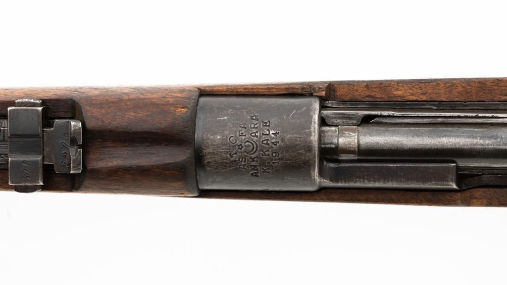 Turkish Model 38 Mauser Bolt Action Rifle, #5378, 8x57mm cal., 24" barrel, blued finish, hardwood stock and handguard, inverted-"V" front sight with protectors, and adjustable tangent rear sight with "V"-notched groove, graduated to 2000 meters. Includes a steel cleaning rod. Turned down bolt handle has flat knob on underside. Top of the receiver ring is marked "TC/ASFA(Turkish crest)ANKARA/K.KALE/1944". Matching numbers on rear sight and trigger guard, other numbers do not match. Barrel is import marked. Condition overall is good, retaining approx. 70% thinning and toning blue. Wood is very good with a few small surface chips and general handling marks. Action moves smoothly and the safety lever will engage, but the bolt will not lock closed. Bore is bright with near excellent, well-defined rifling. Est.: $300-$500. (C&R)