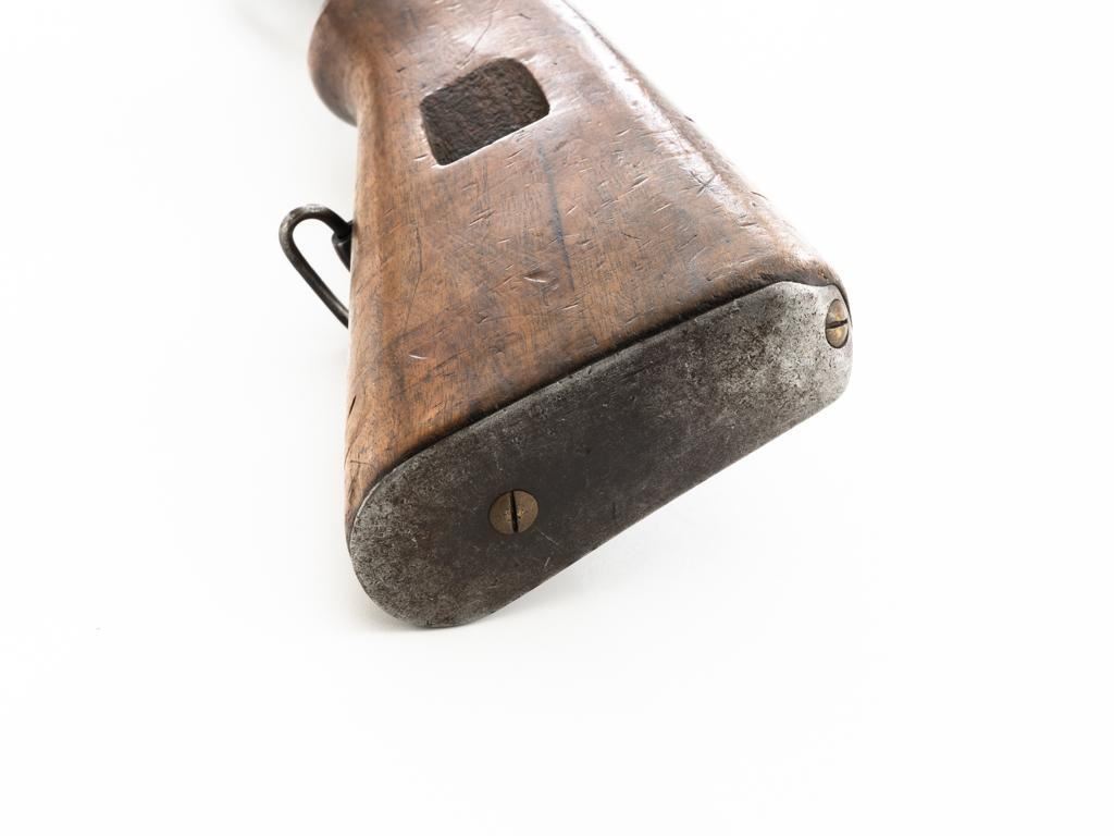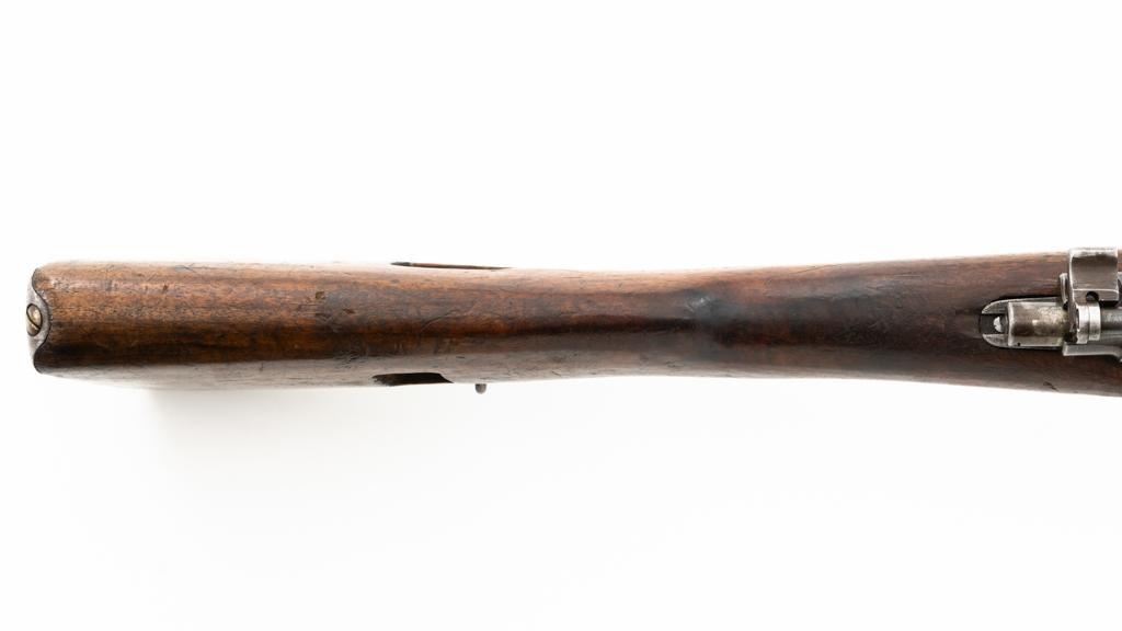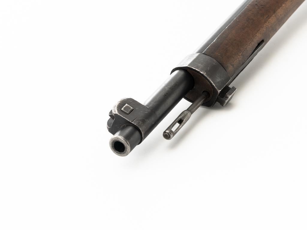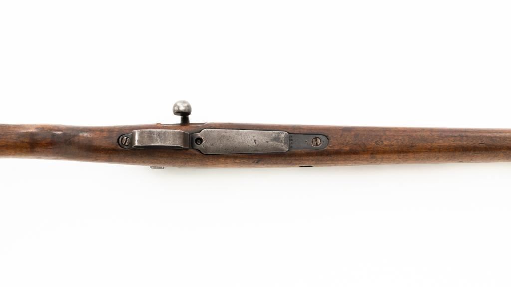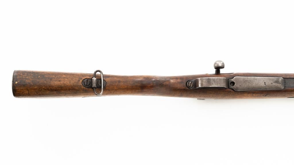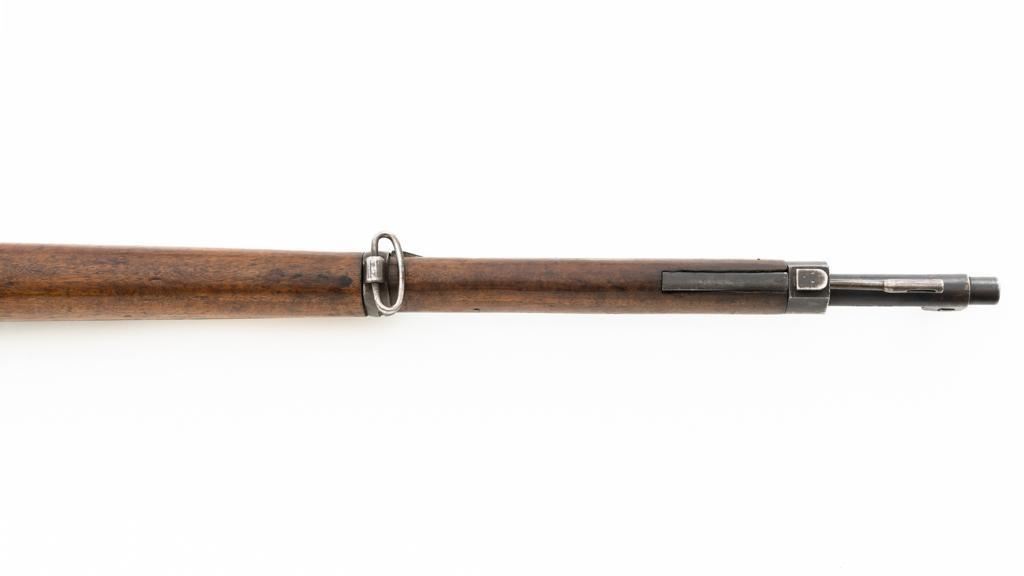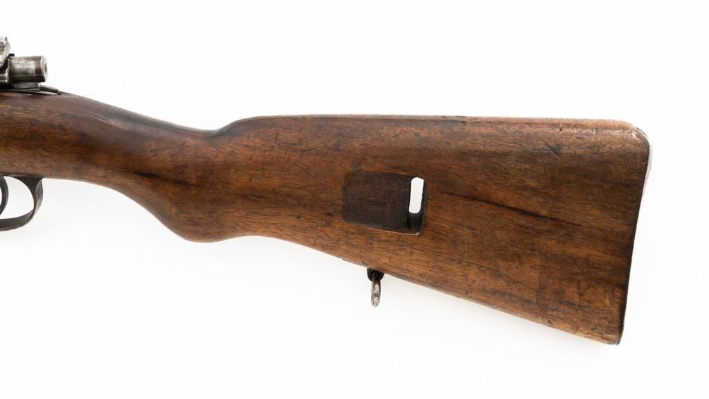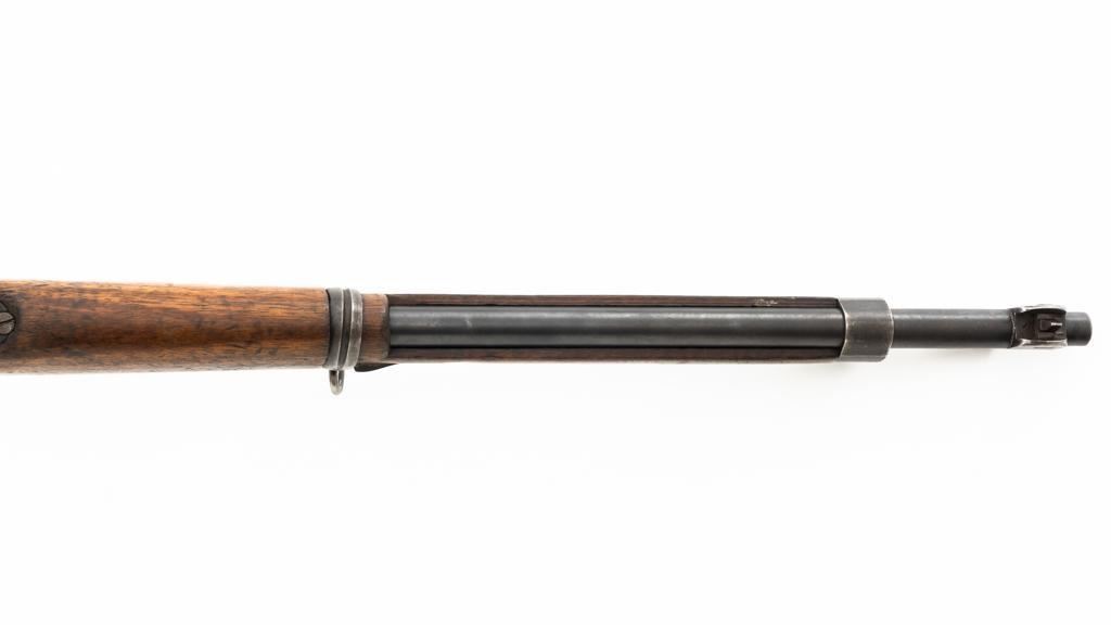 Turkish Model 38 Mauser Bolt Action Rifle, #5378, 8x57mm cal., 24" barrel, blued finish, hardwood stock and handguard, inverted-"V" front sight with protectors, and adjustable tangent rear sight with "V"-notched groove, graduated to 2000 meters. Includes a steel cleaning rod. Turned down bolt handle has flat knob on underside. Top of the receiver ring is marked "TC/ASFA(Turkish crest)ANKARA/K.KALE/1944". Matching numbers on rear sight and trigger guard, other numbers do not match. Barrel is import marked. Condition overall is good, retaining approx. 70% thinning and toning blue. Wood is very good with a few small surface chips and general handling marks. Action moves smoothly and the safety lever will engage, but the bolt will not lock closed. Bore is bright with near excellent, well-defined rifling. Est.: $300-$500. (C&R)