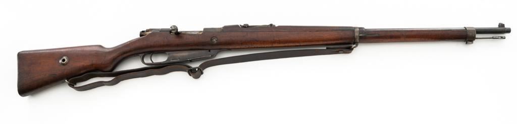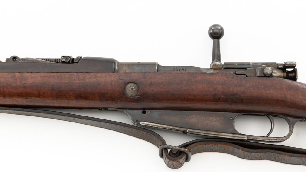Turkish Modified Model 1888 Bolt Action Rifle, #12989, 8x57mm cal., 29.5" barrel, blued finish, hardwood stock, inverted-"V" front sight, and adjustable tangent rear sight. Includes a steel cleaning rod. Marked on top of the receiver ring "TC/ASFA(Turkish crest)ANKARA/1938". Bolt is numbered but does not match. No visible import marks. Rifle was modified in Turkish service by replacing the barrel and stock and modifying the magazine for Mauser type stripper clips. Condition overall is very good, retaining approx. 60%-70% blue, showing general thinning and toning, browning across the receiver ring. Wood with scattered moderate dents and scratches, with an even colored finish. Action functions well. Bright bore rates good, with defined rifling. Est.: $200-$400. (C&R)