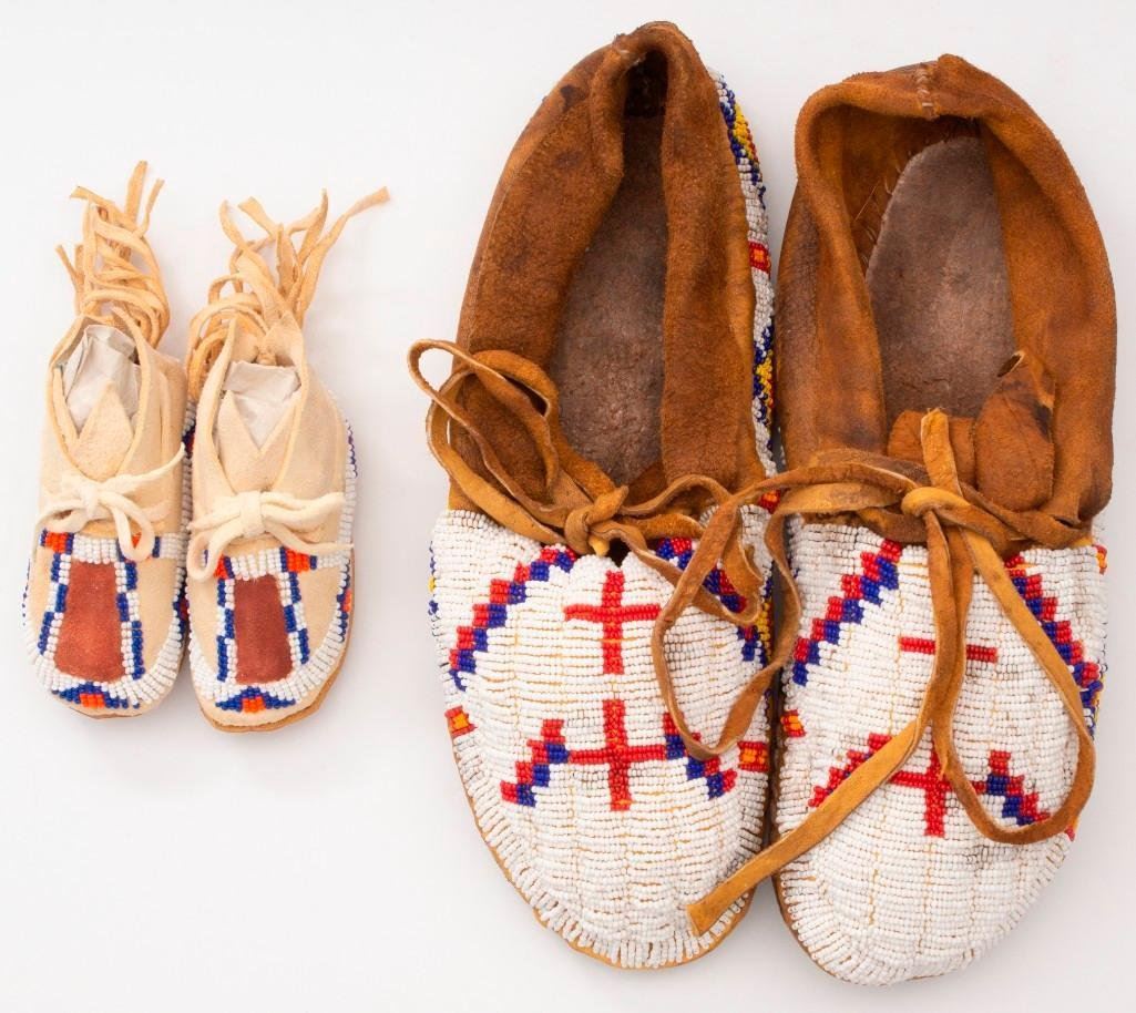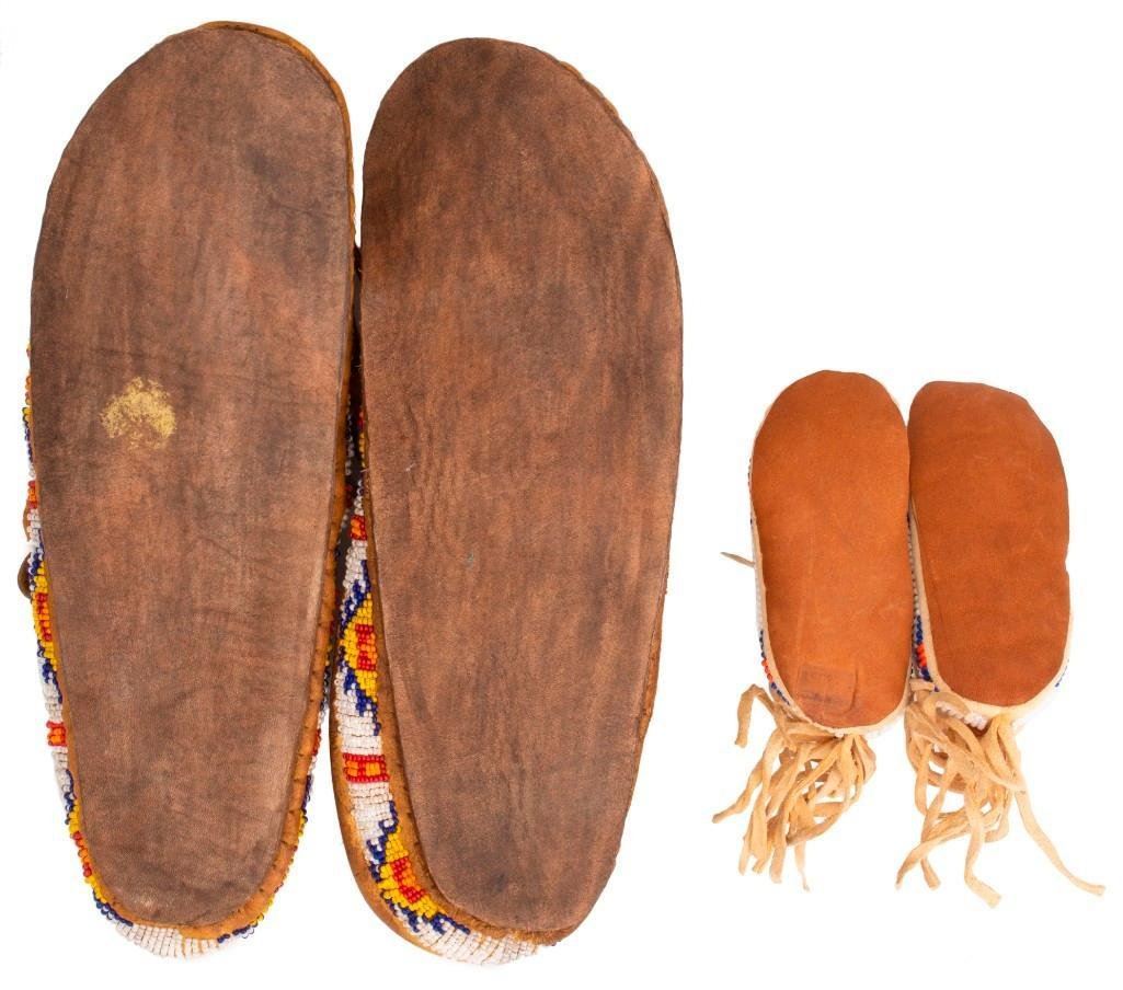 Lot includes two pairs of 20th century beaded moccasins, the largest measuring 11.25" x 3.75". One paid beaded throughout with white, orange, red, yellow, and blued beads on a white background, the other with orange and blue on a white background. **Good condition overall. Some wear to edges of leather with beadwork in very good condition.** $200-$300