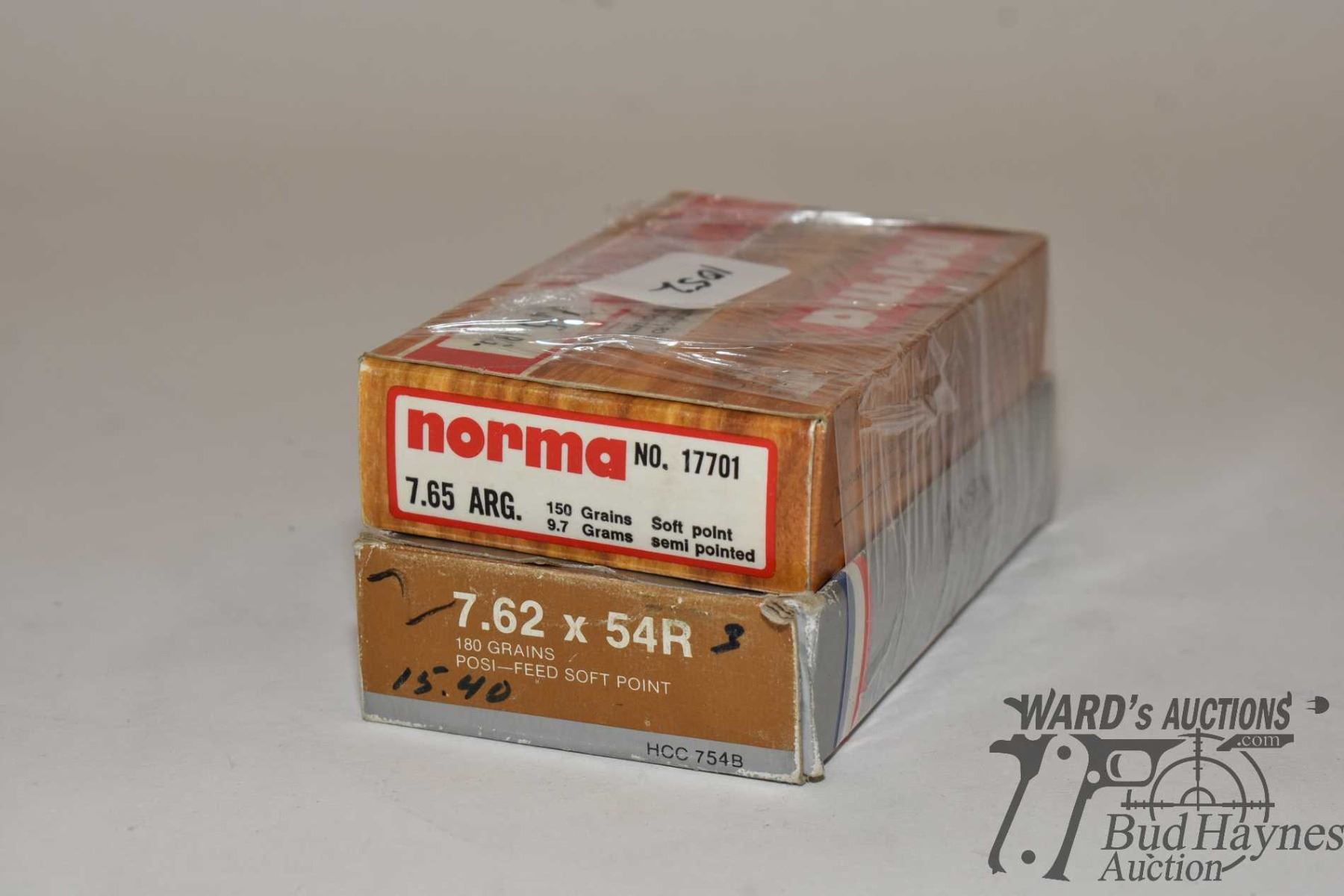 Two boxes of ammo including one 19 count box of Hansen POSI-Feed 7.62 x 54R 180 gr soft point and a 20 count box of 7.65 arg. Reloads