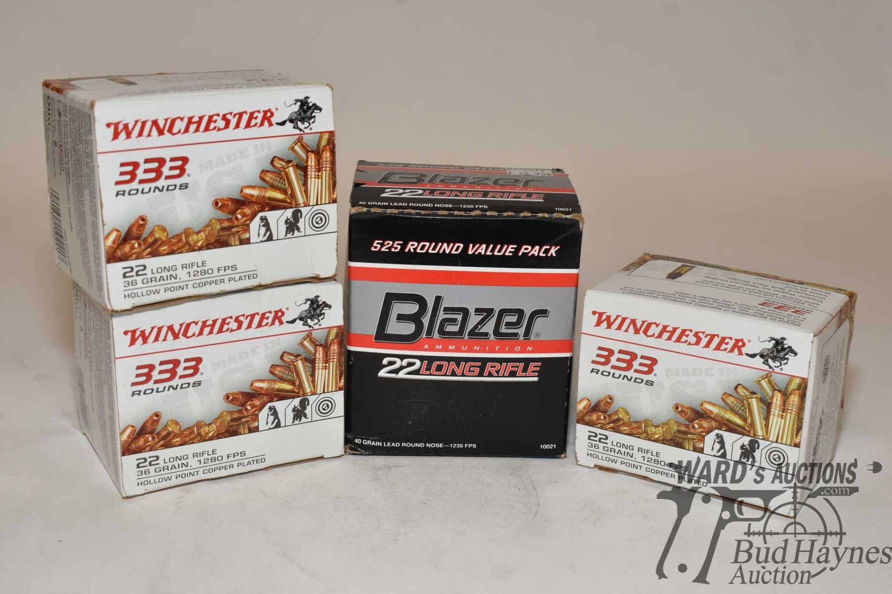 Two full 333 count boxes of Winchester .22 LR 36 gr HP, one full 525 count box of Blazer .22 LR 40 gr lead round nose and a box w/ 80 .22 LR mixed rounds