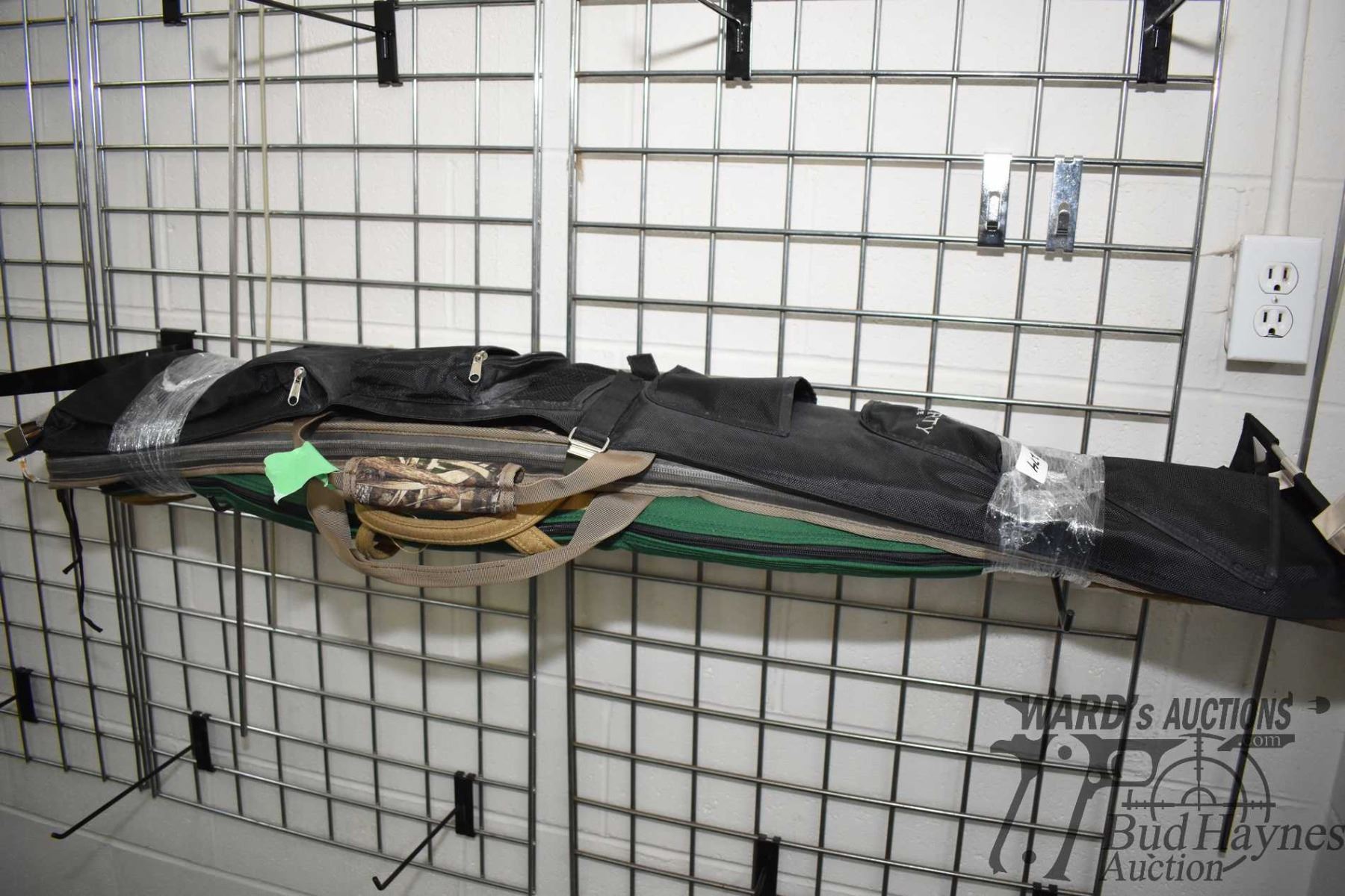 Two soft rifle cases, one rifle sock and a hanging storage bin