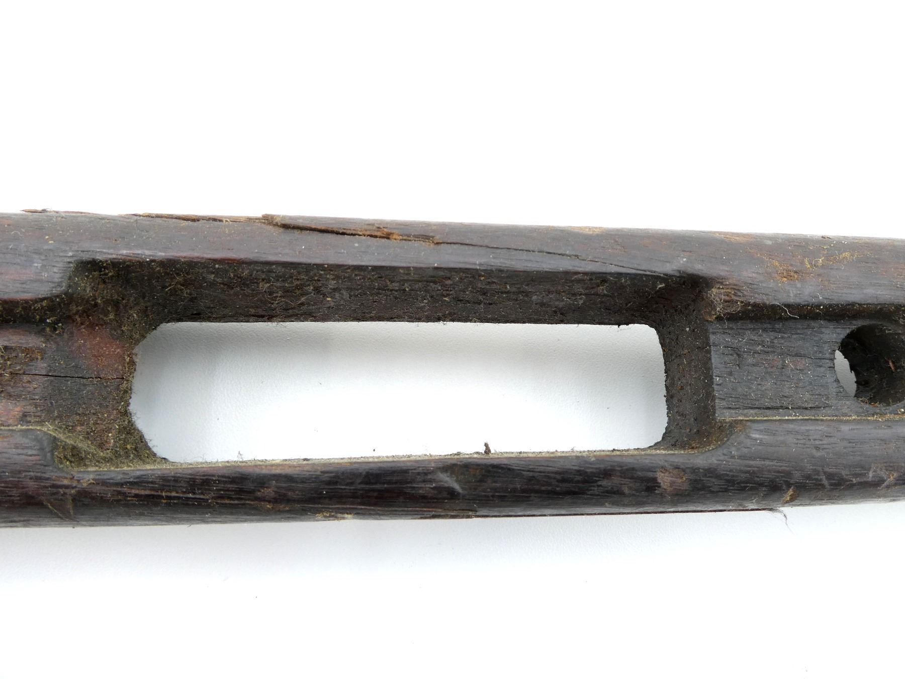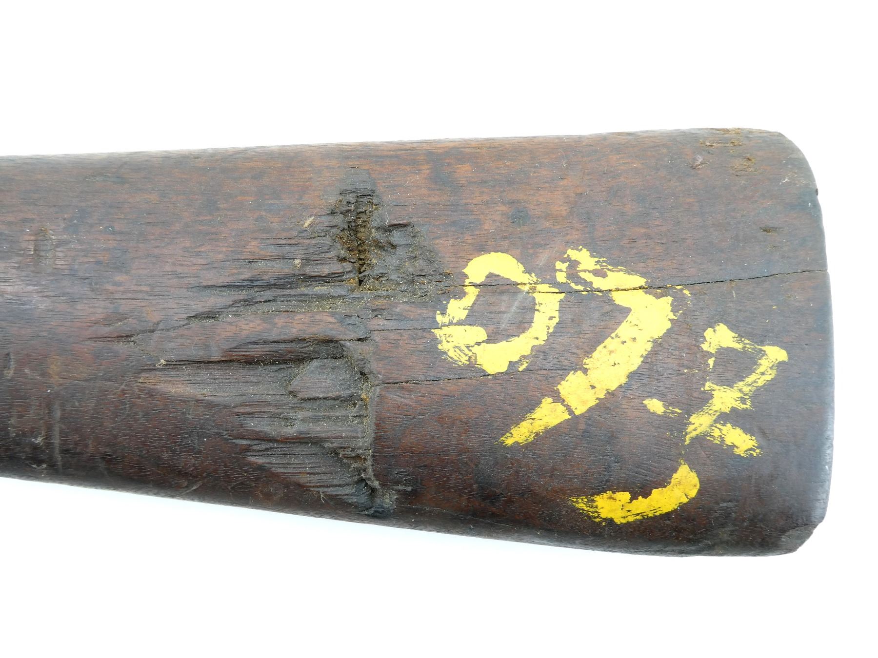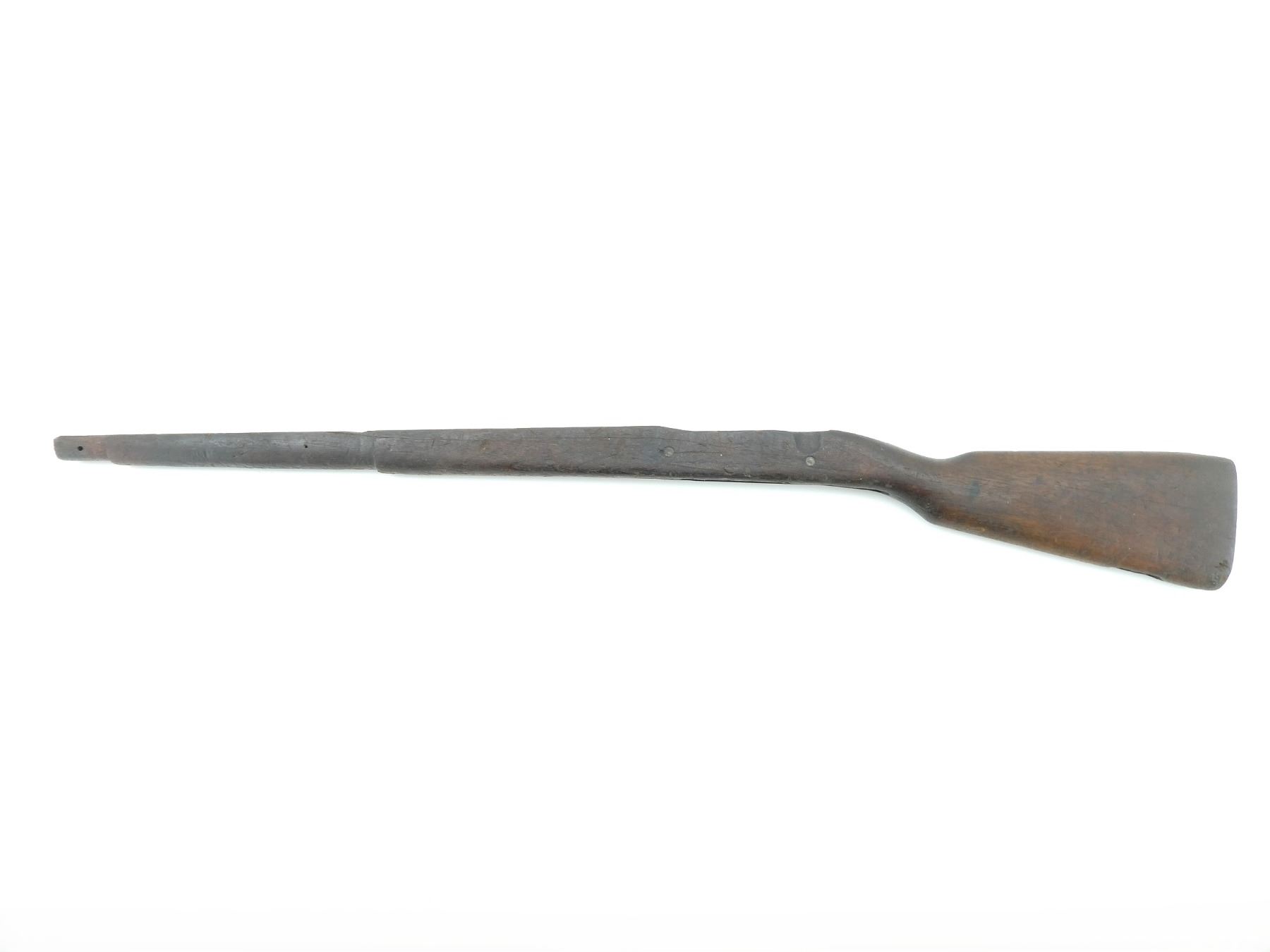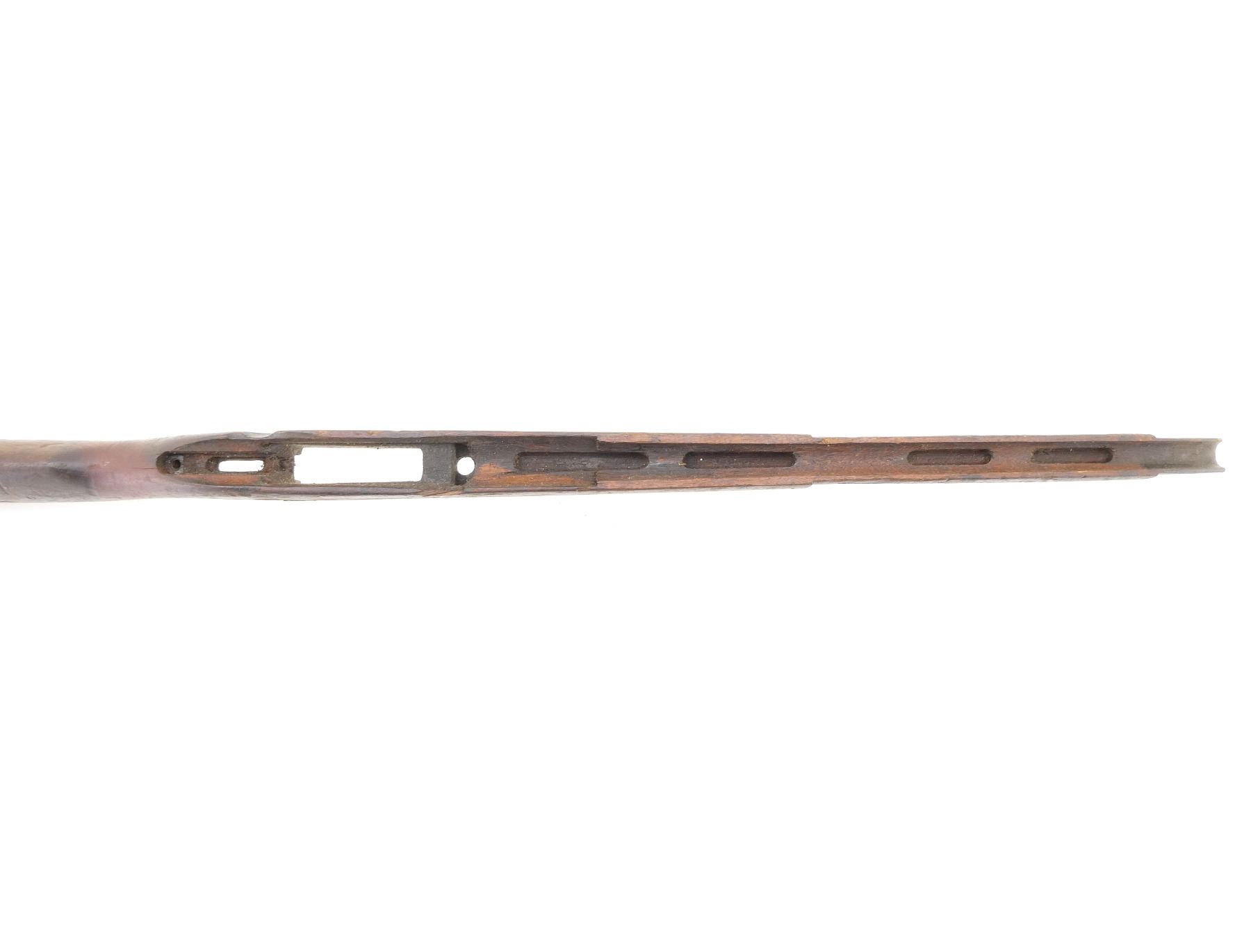 (1) WOODEN CONSTRUCTION, SMOOTH, UNMARKED, SHOWS WEAR & TEAR, HAS CRACKS & CHIPS, MISSING BUTT PLATE, OVERALL LENGTH APPROX. 40 1/8". MAY REQUIRE FITTING. SEE PHOTOS.