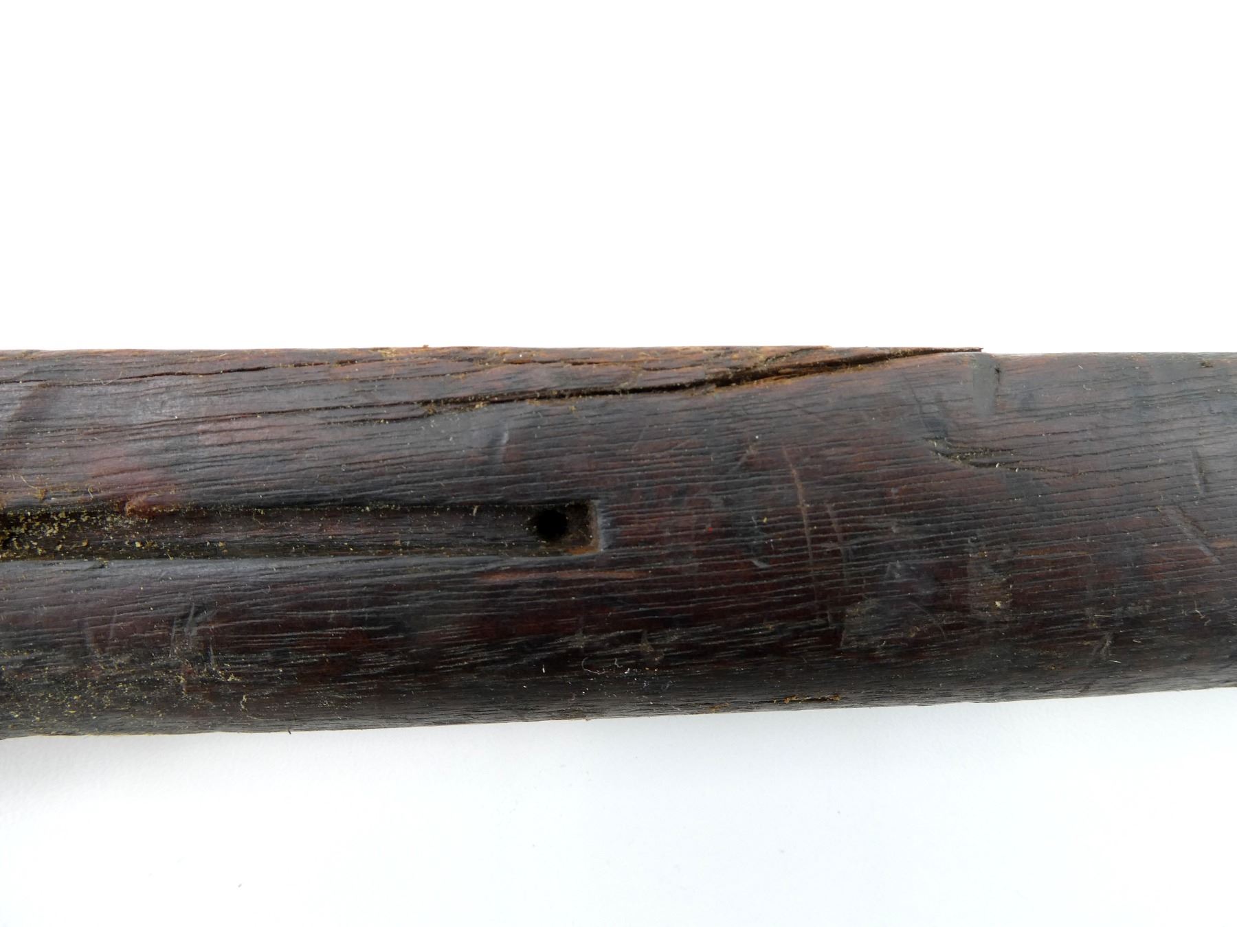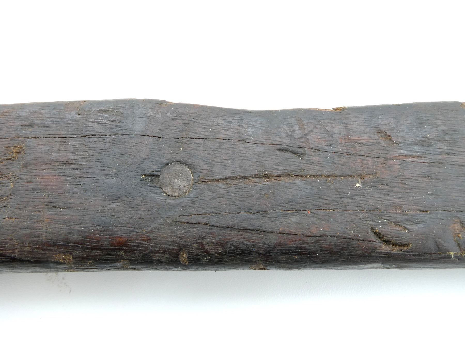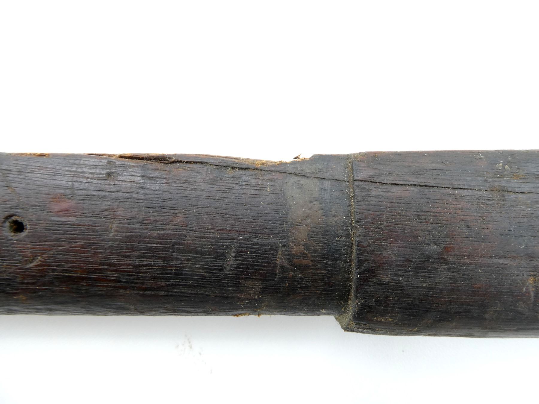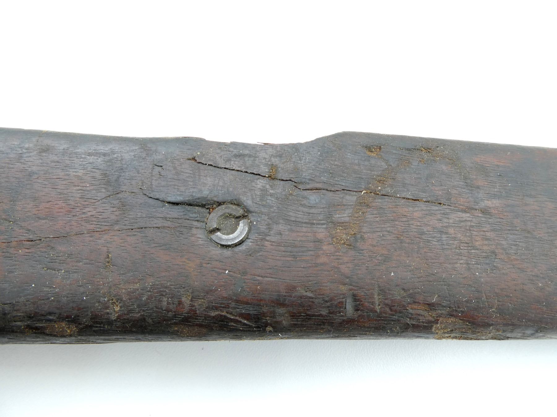 (1) WOODEN CONSTRUCTION, SMOOTH, UNMARKED, SHOWS WEAR & TEAR, HAS CRACKS & CHIPS, MISSING BUTT PLATE, OVERALL LENGTH APPROX. 40 1/8". MAY REQUIRE FITTING. SEE PHOTOS.