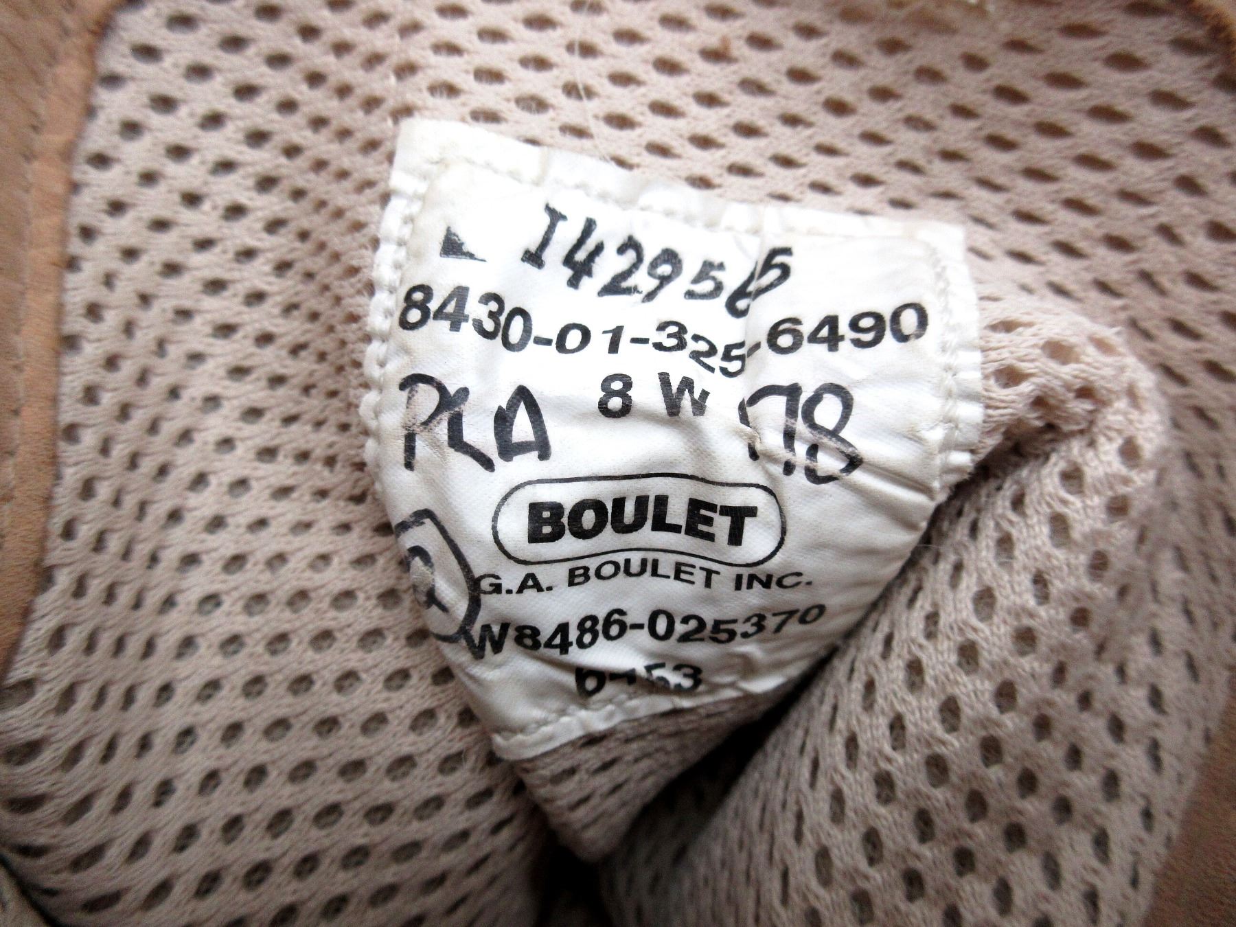 LOT INCLUDES; (1) PAIR OF TAN DESERT BOOTS, SIZE 8W, MARKED: "1429565, 8430-01-325-6490, 8W, G.A. BOULET INC." ETC., BOTTOM MARKED: "VIBRAM", WITH LACES, SHOWS AGE / WEAR & (1) PAIR OF TAN DESERT BOOTS, SIZE 8 1/2R, MARKED: "WELLCO, 8 1/2R, 170104", BOTTOM MARKED: "WELLCO 8 1/2R" ETC., WITH LACES, SHOWS AGE / WEAR. SEE PHOTOS.