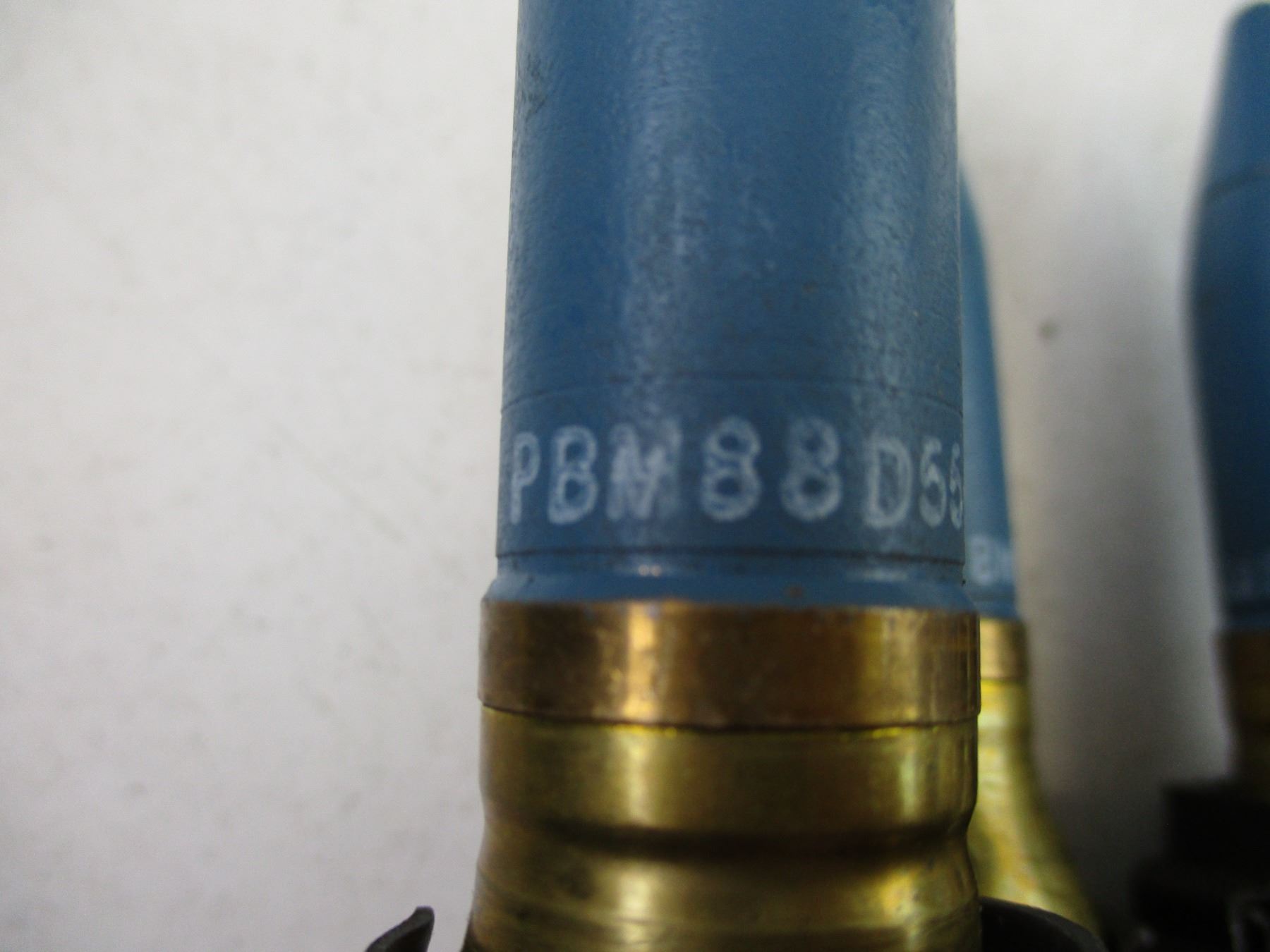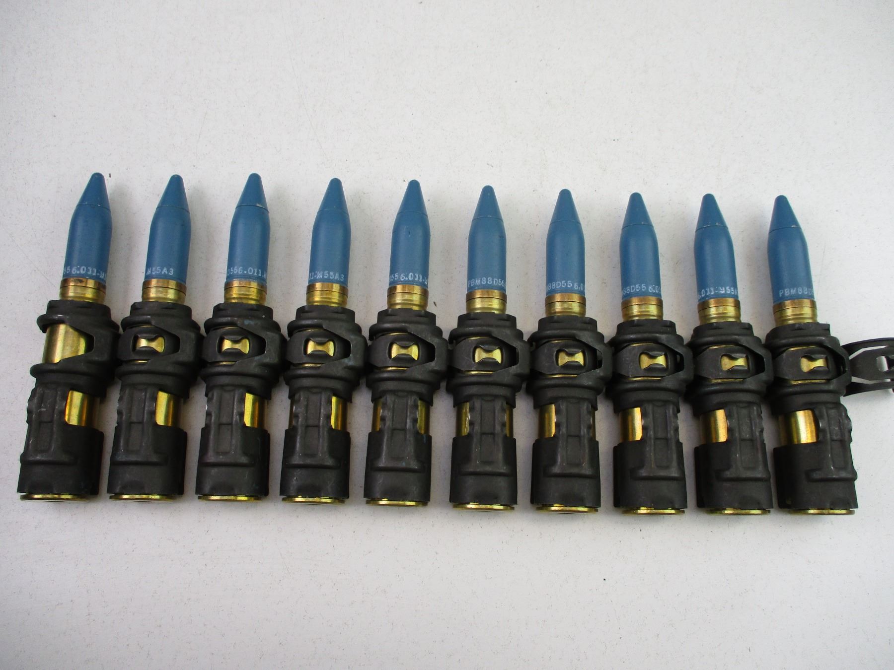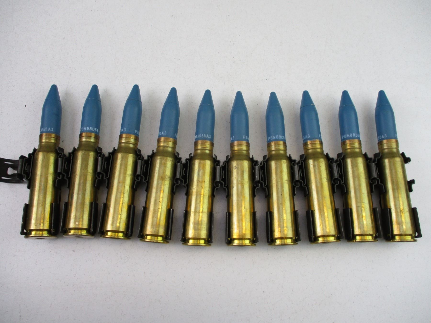 U.S. INERT 20MM M55AI CANNON ROUNDS , (10) ROUNDS BRASS CASES, NO PRIMERS, BLUE PRACTICE PROJECTILE, 10 STEEL LINKS.