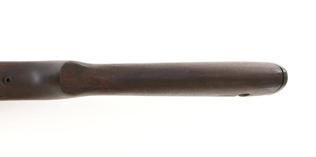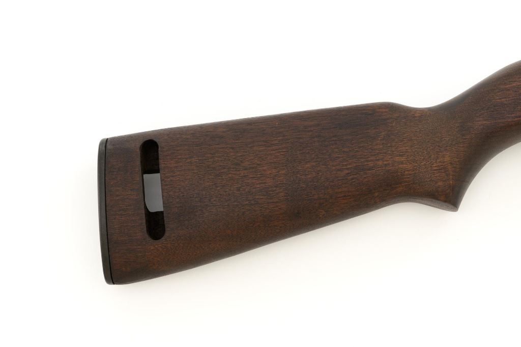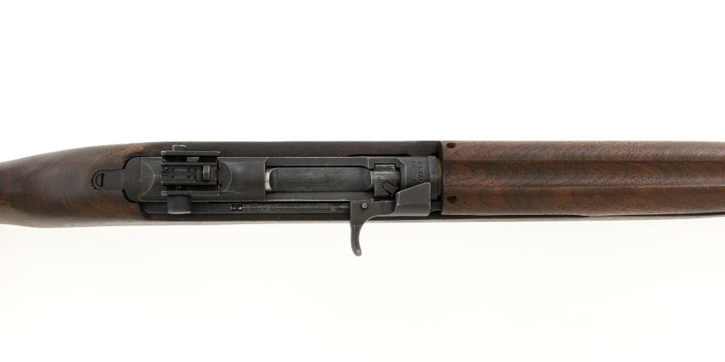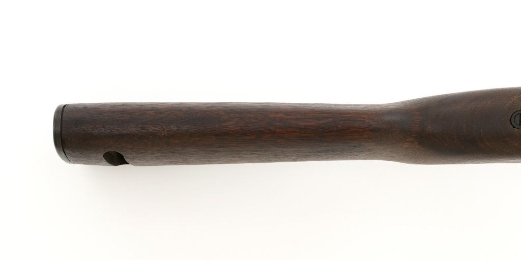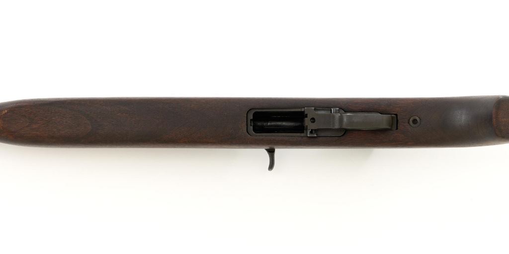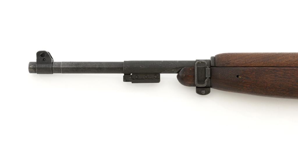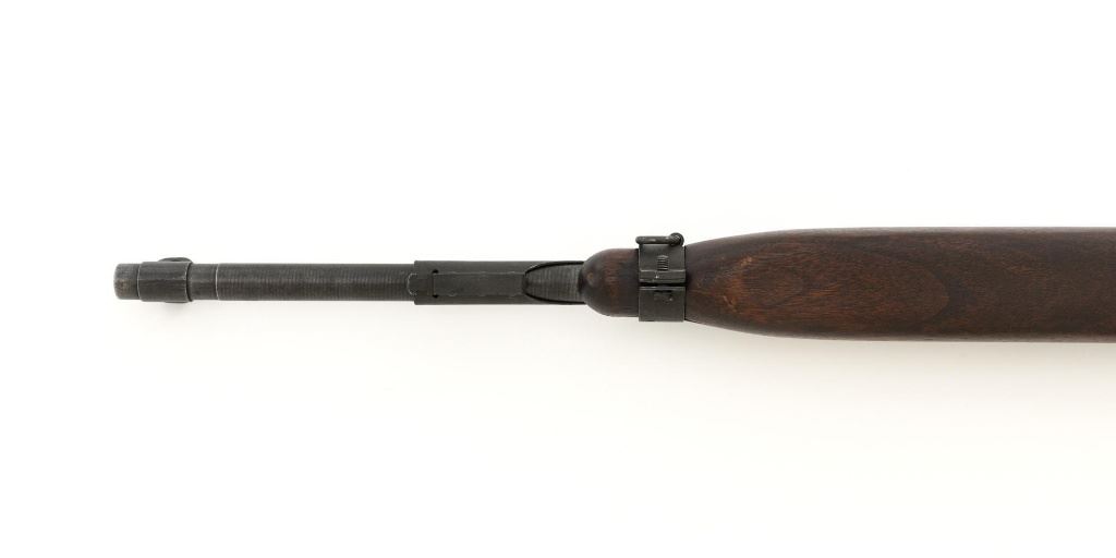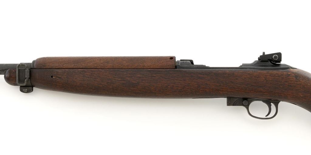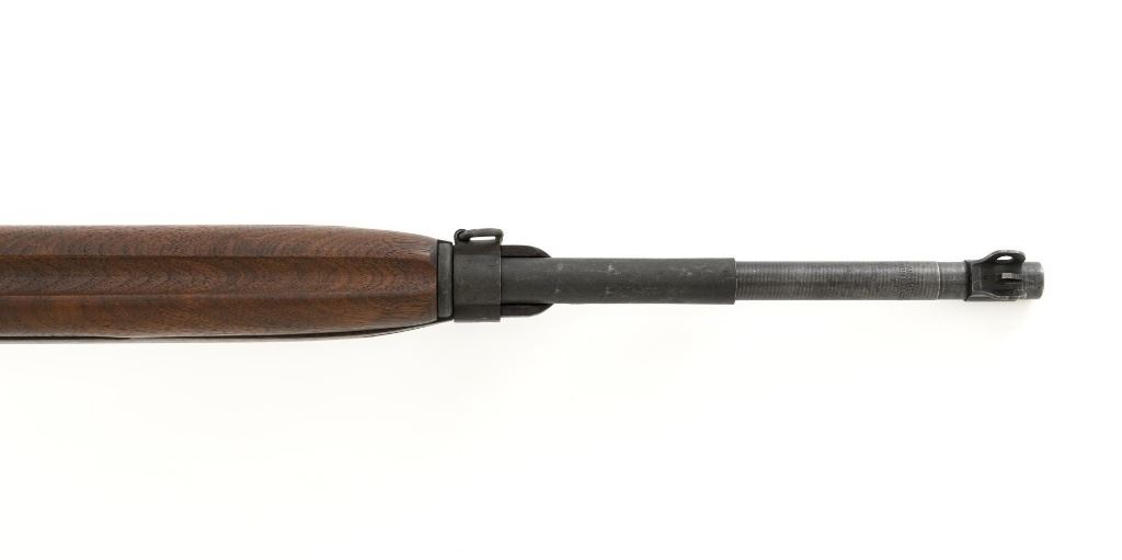 U.S. Inland Division Semi-Automatic M1 Carbine, #179005, .30 carbine cal., 18" barrel, parkerized finish, walnut stock, bayonet lug, blade front sight with ears, and adjustable rear peep sight. Carbine was arsenal rebuilt after WWII and the receiver is marked "INLAND DIV./179005". Barrel is marked "INLAND MFG. DIV./GENERAL MOTORS/1-43". No visible import marks. Carbine is in near excellent overall condition and retains approx. 90% arsenal reparkerized finish, with light wear on the receiver and front of barrel. Replacement potbelly M2 stock and handguard are in excellent condition. Action works properly. Bore is very good bore with sharp rifling. Est.: $1,000-$1,500. (C&R)