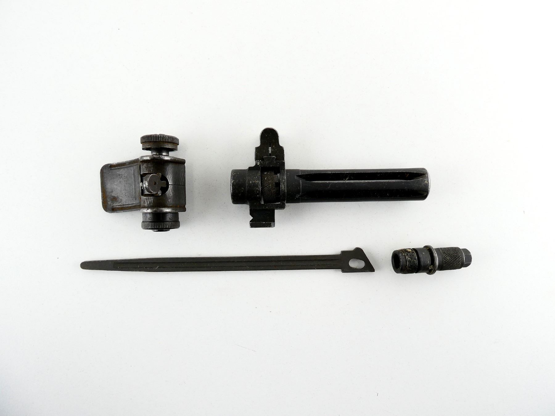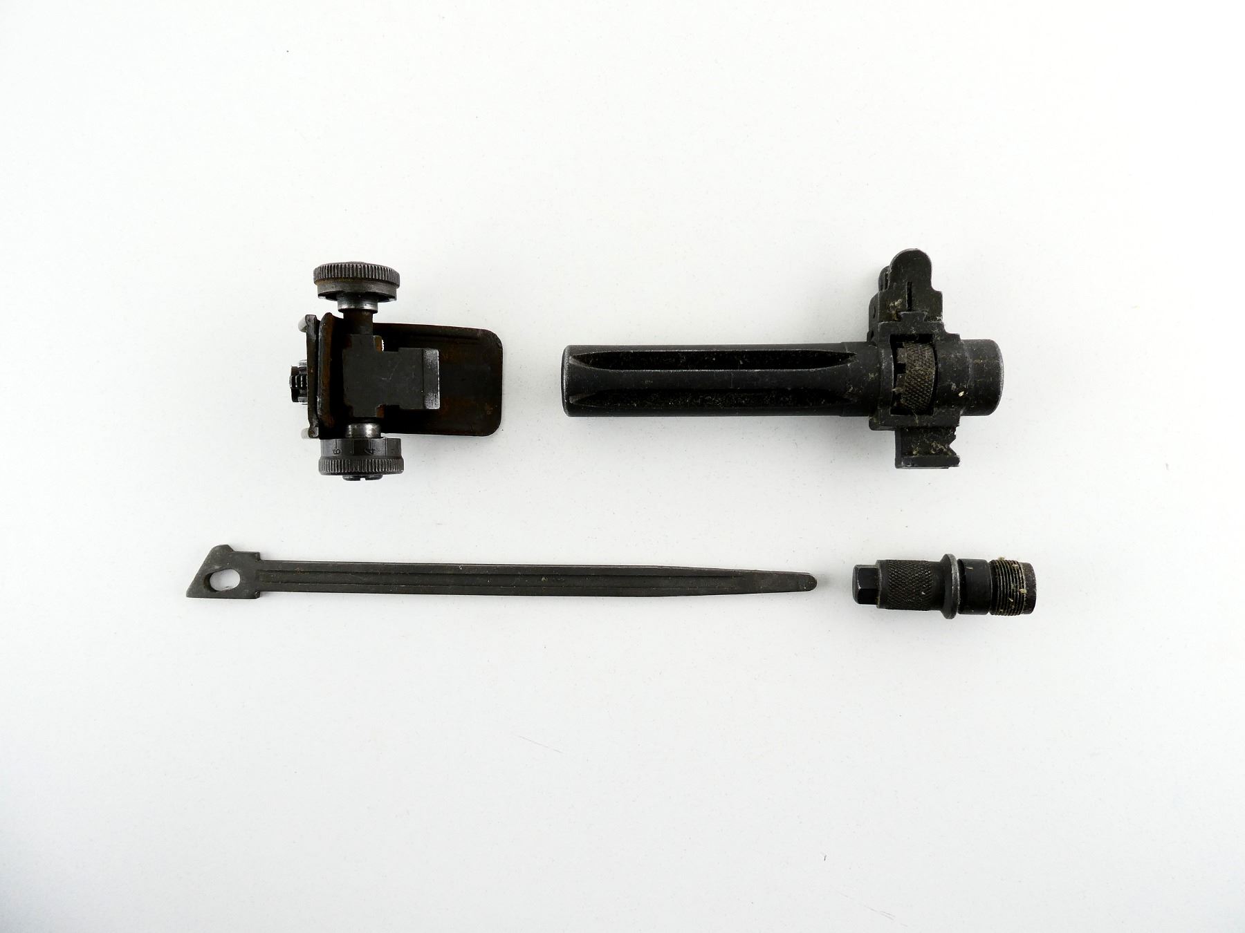 PARKERIZED STEEL CONSTRUCTION, VARIOUS MARKINGS, LOT INCLUDES; (1) FLASH HIDER ASSEMBLY, GAS CYLINDER PLUG, RETURN SPRING ROD, REAR SIGHT ASSEMBLY, ETC. MAY REQUIRE FITTING. SEE PHOTOS.