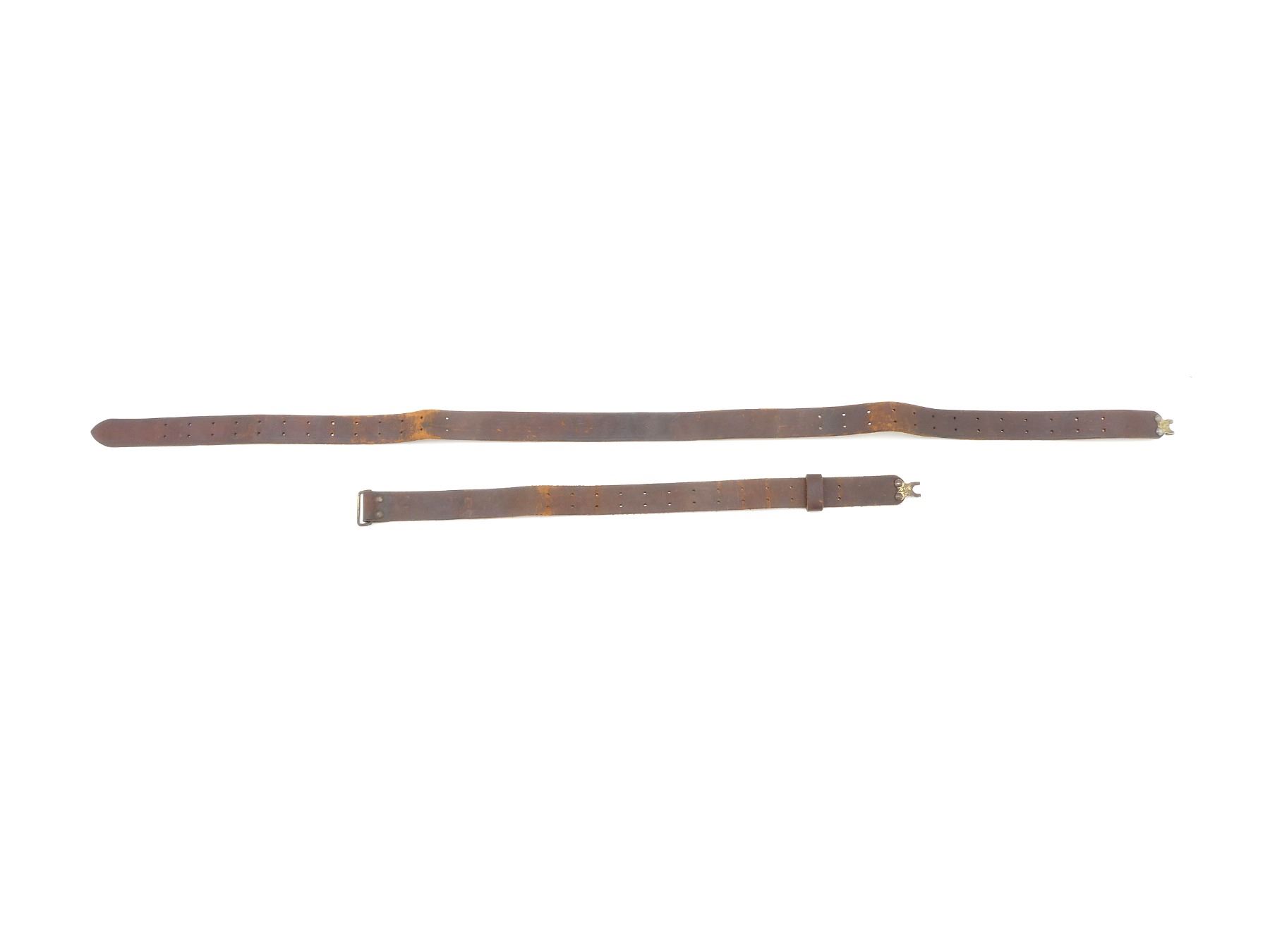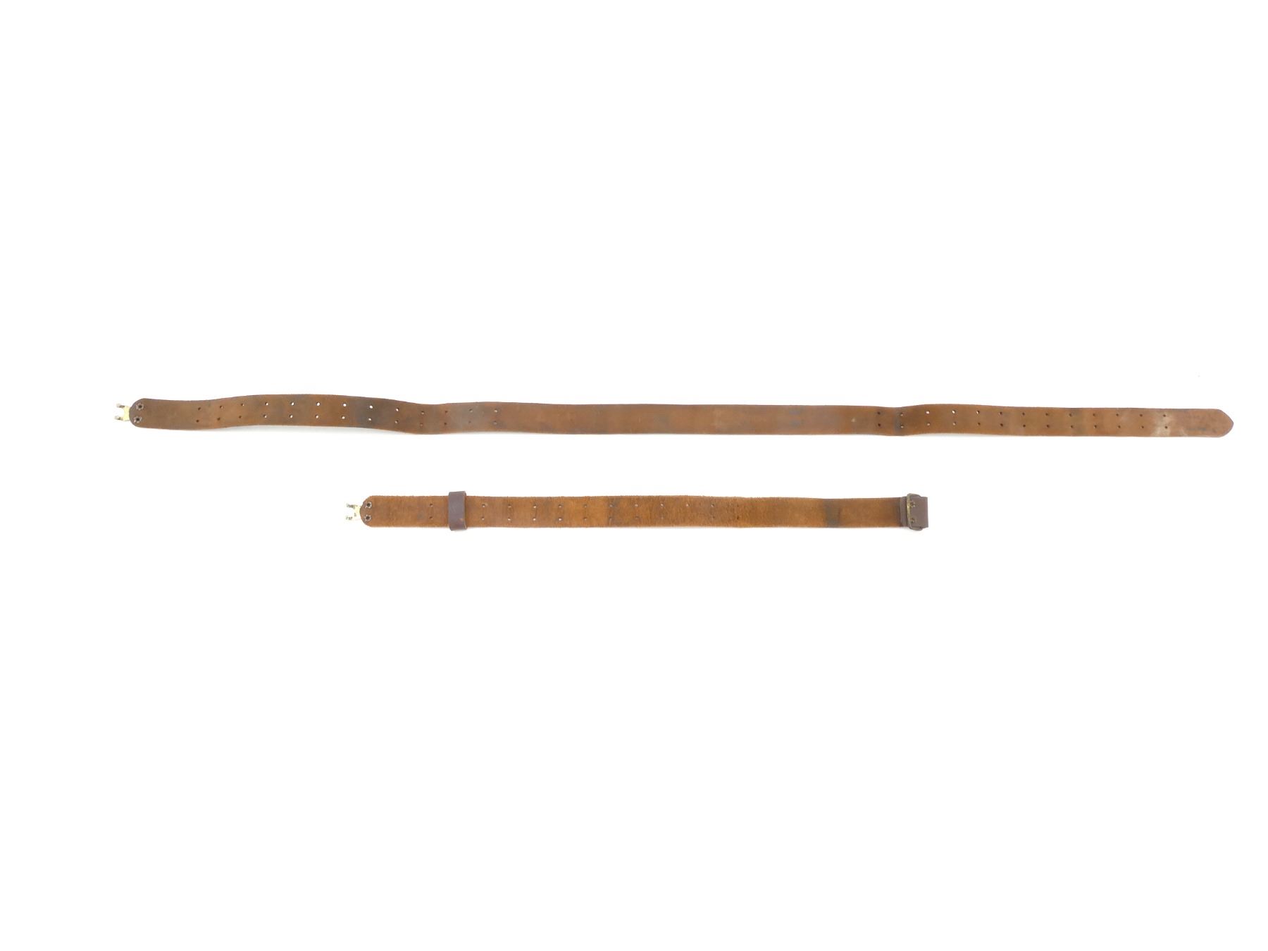 (1) FITS 1903 SPRINGFIELD & M1 GARAND RIFLES, BROWN LEATHER SLING WITH BRASS FITTINGS / HOOKS, NO VISIBLE MARKINGS, SHOWS AGE / WEAR & OVERALL LENGTH APPROX. 69". SEE PHOTOS.