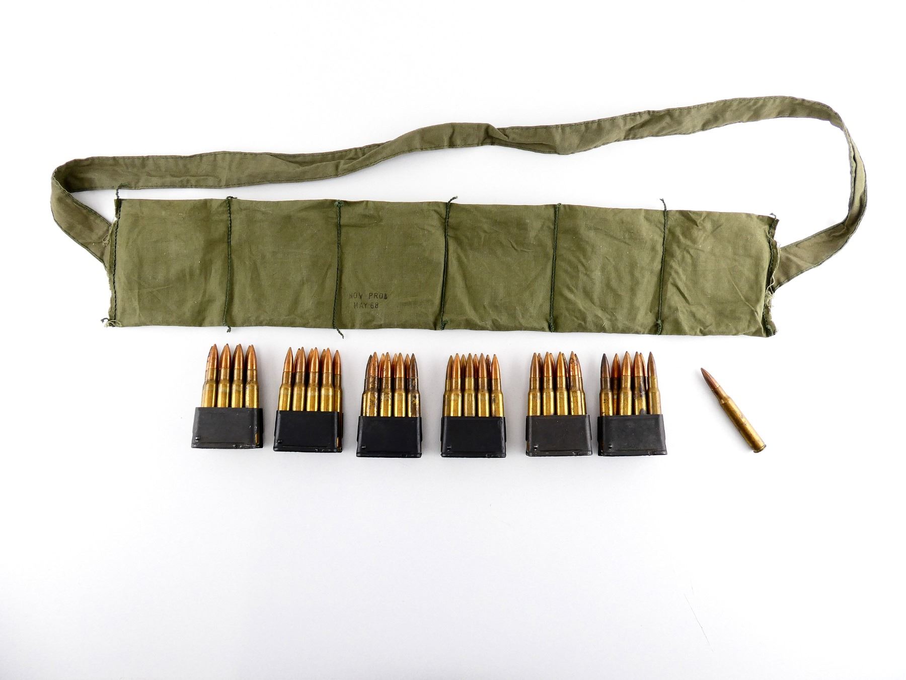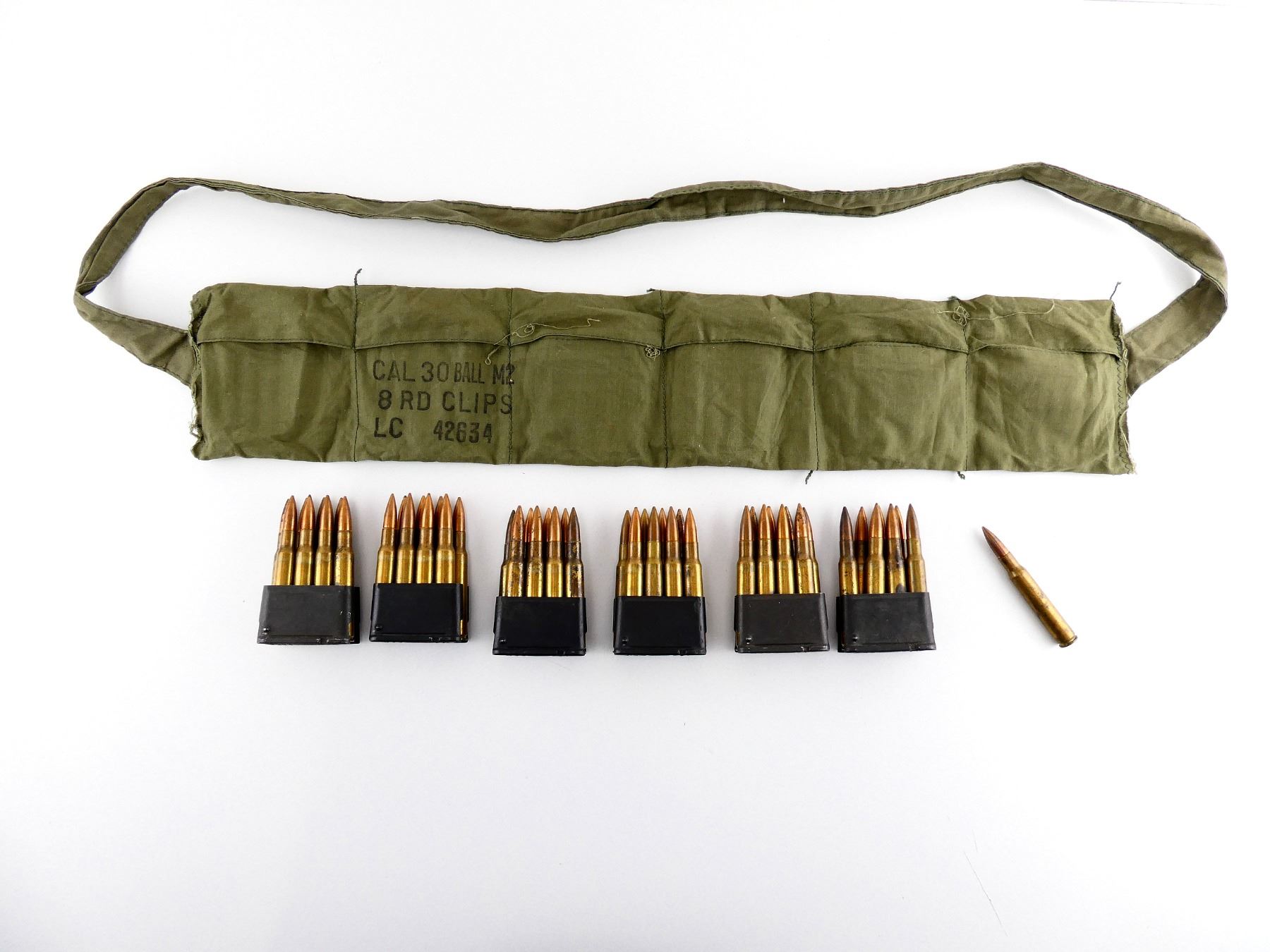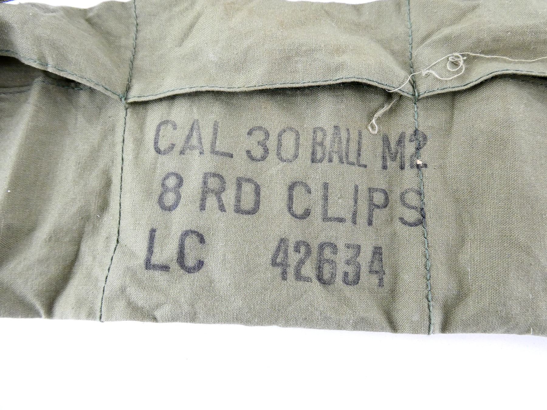 LOT INCLUDES; APPROX. (48) RNDS, BALL, (6) M1 GARAND ENBLOCS, (1) GREEN BANDOLIER.
