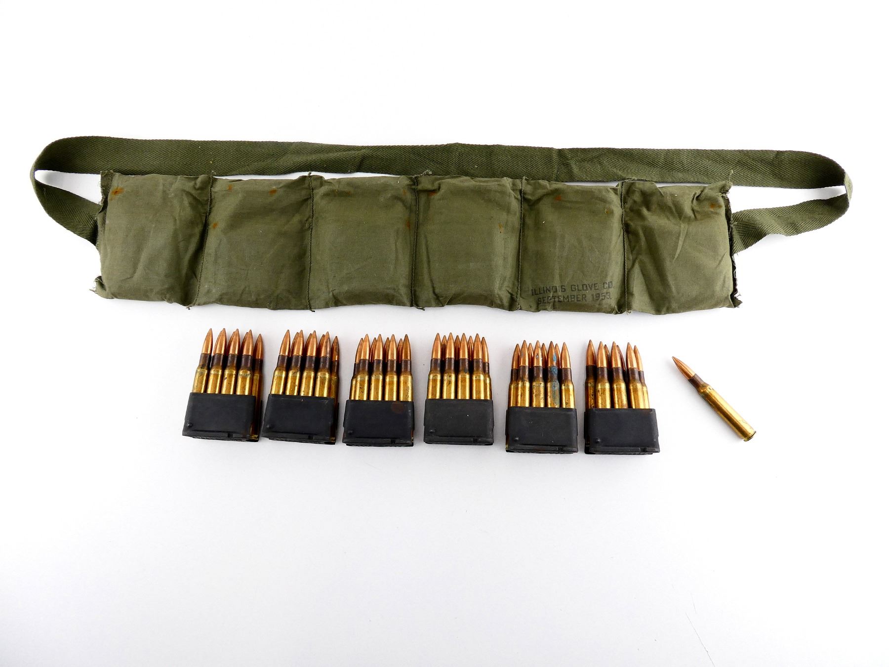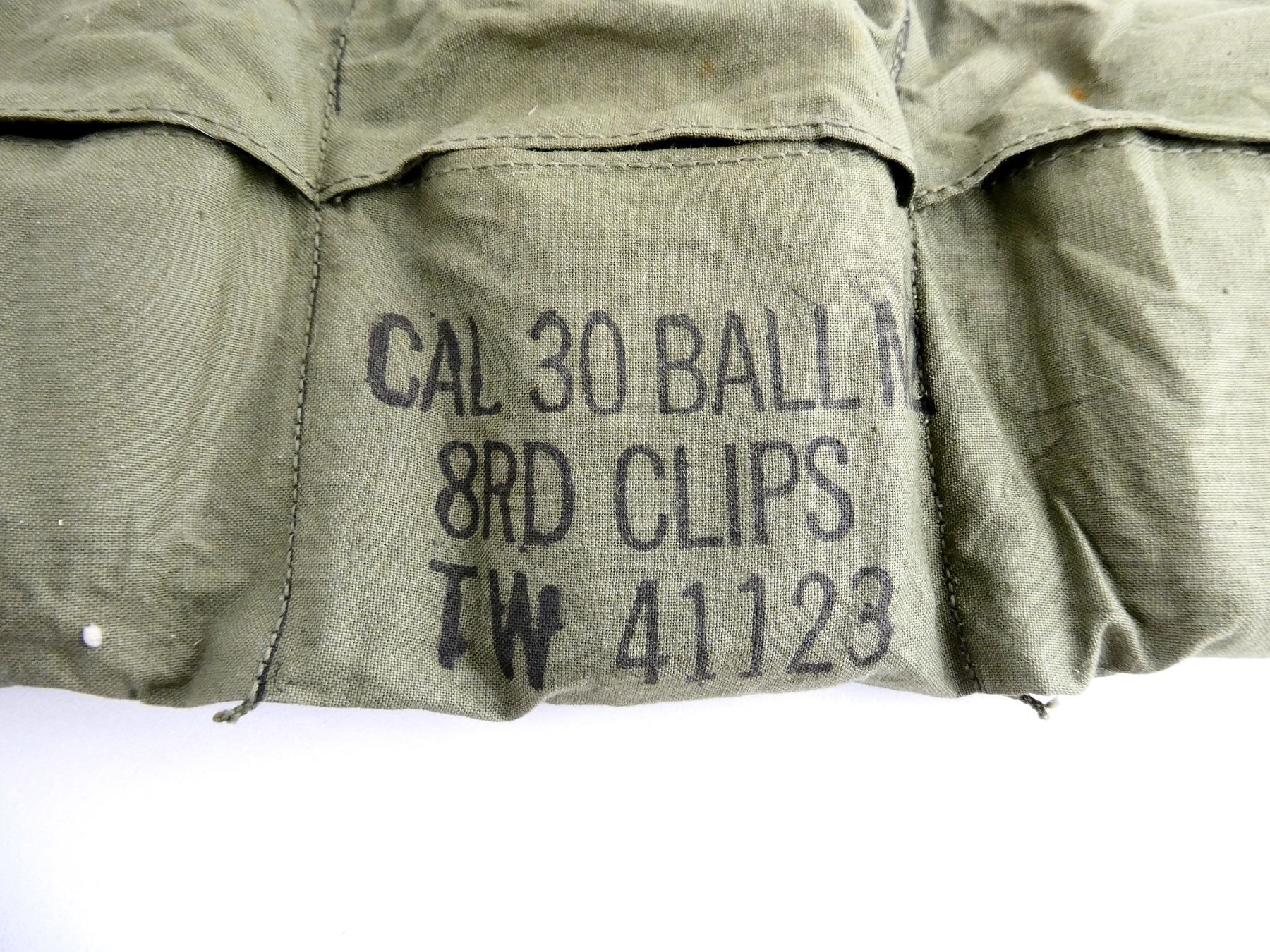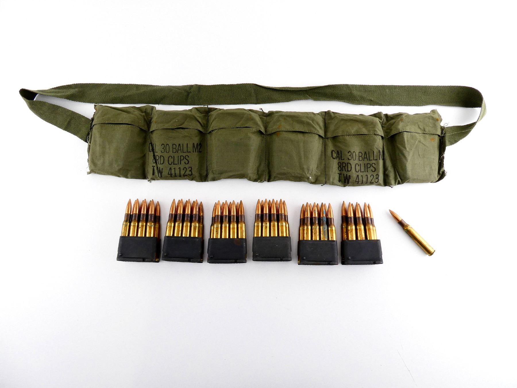 LOT INCLUDES; APPROX. (48) RNDS, BALL, (6) M1 GARAND ENBLOCS, (1) GREEN BANDOLIER.