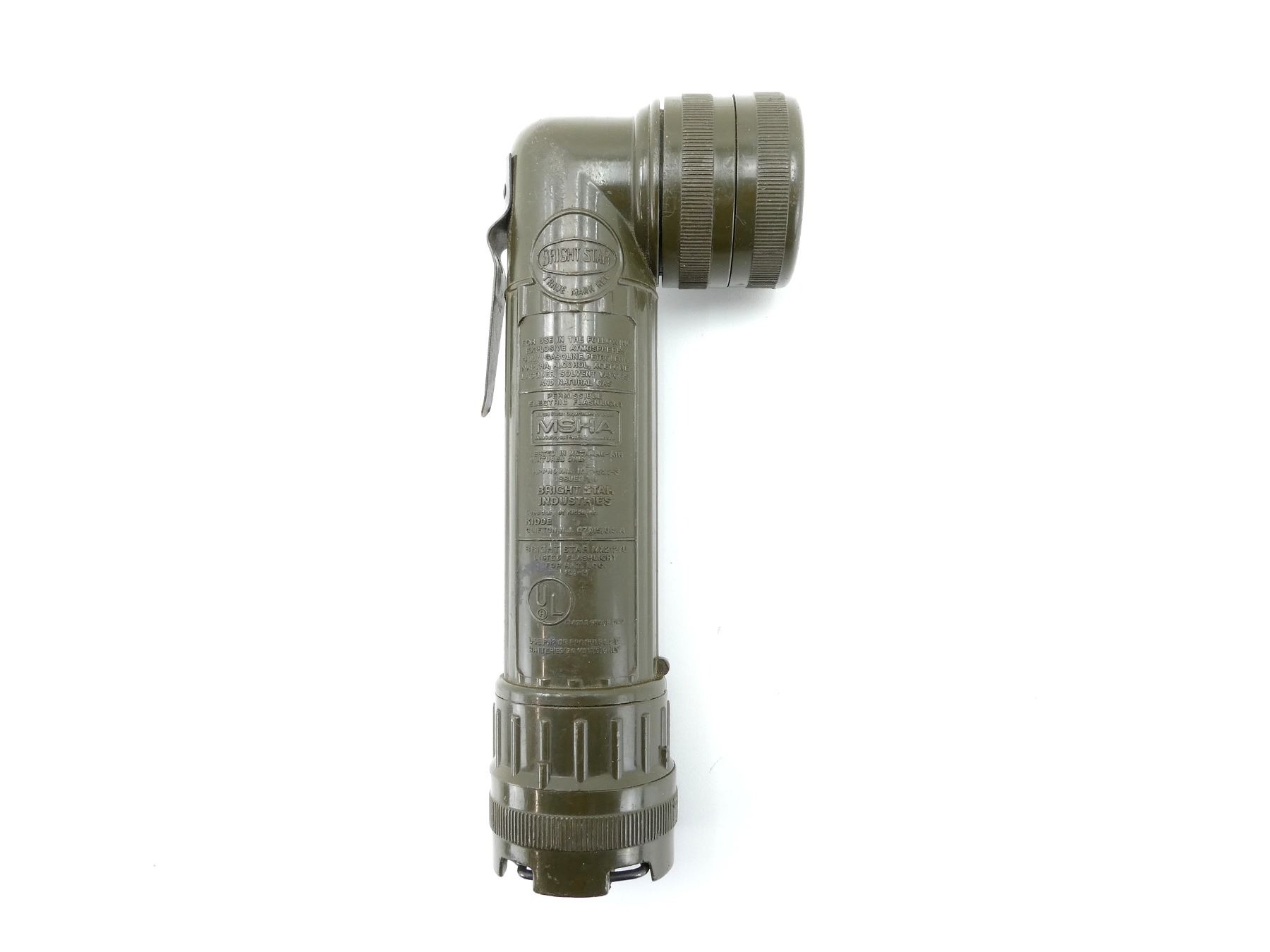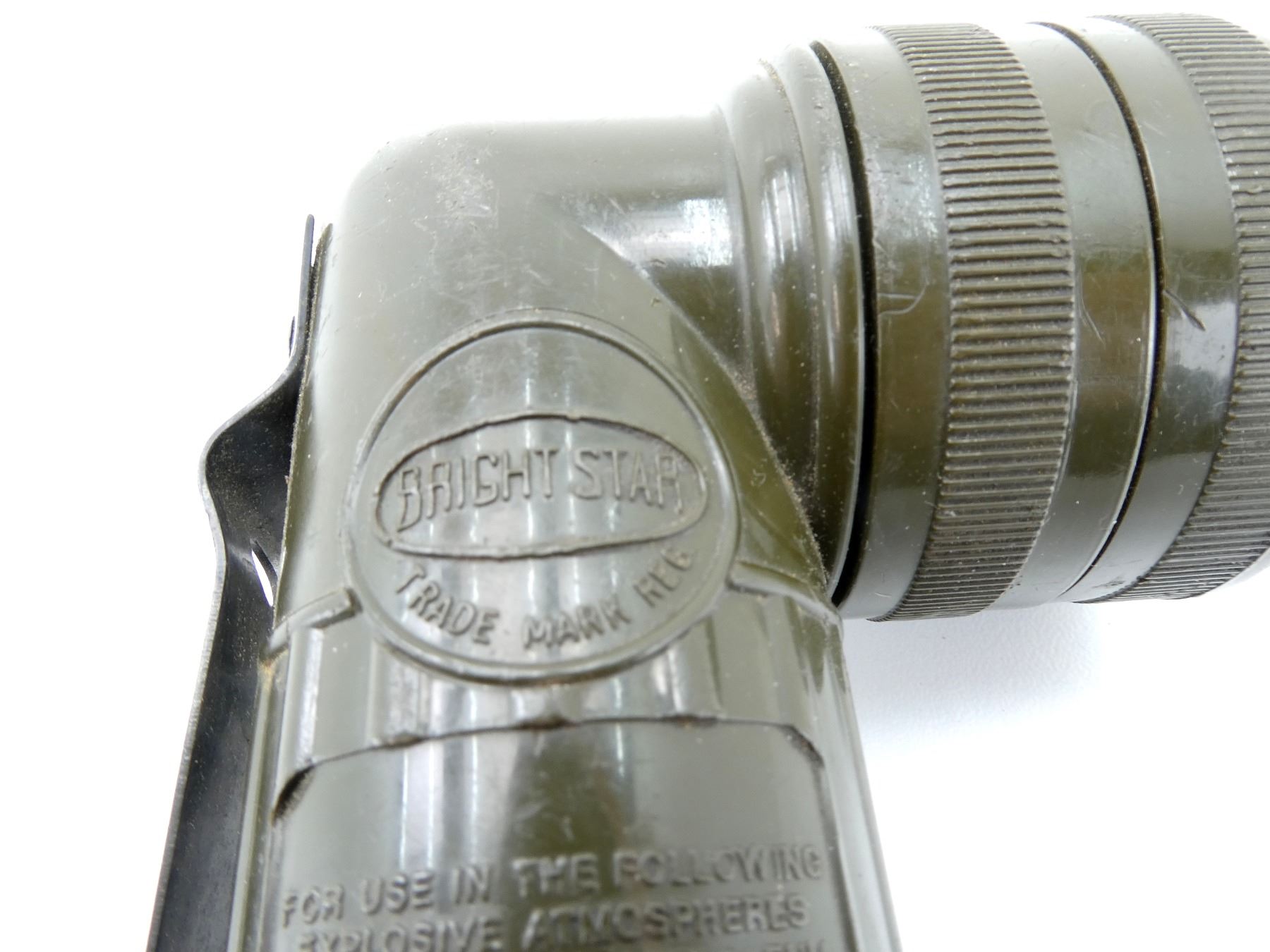 LOT INCLUDES; (1) GREEN POLYMER FLASHLIGHT WITH 90 DEGREE HEAD, TESTED (WORKS), MARKED: "MX-212/U", "BRIGHT STAR", "FOR USE IN HAZ. LOC. CLASS 1 GROUP C& D" ETC., VARIOUS OTHER MARKINGS, WITH WHITE / RED LENSES IN BOTTOM COMPARTMENT & SPARE BULB. SEE PHOTOS.