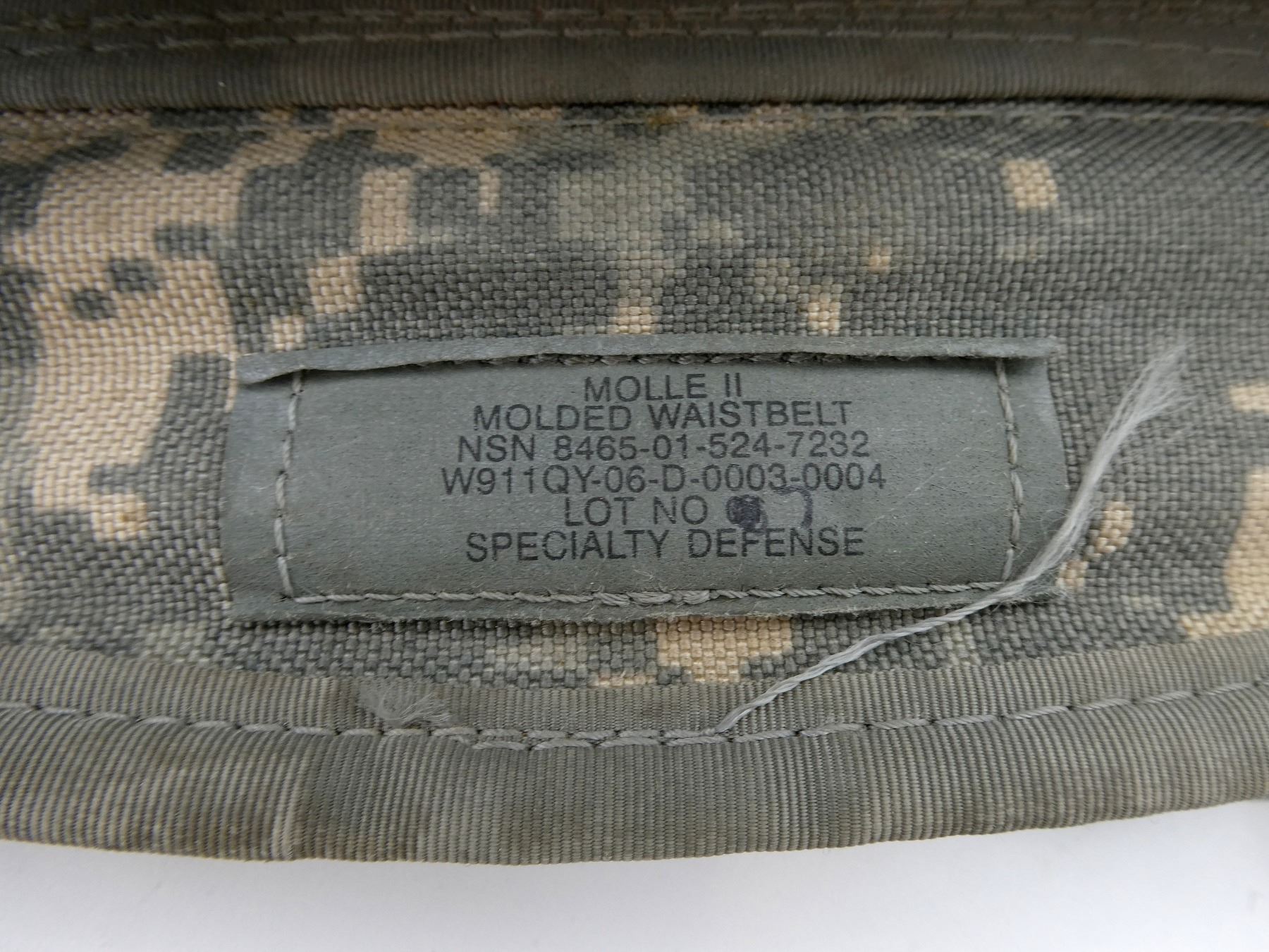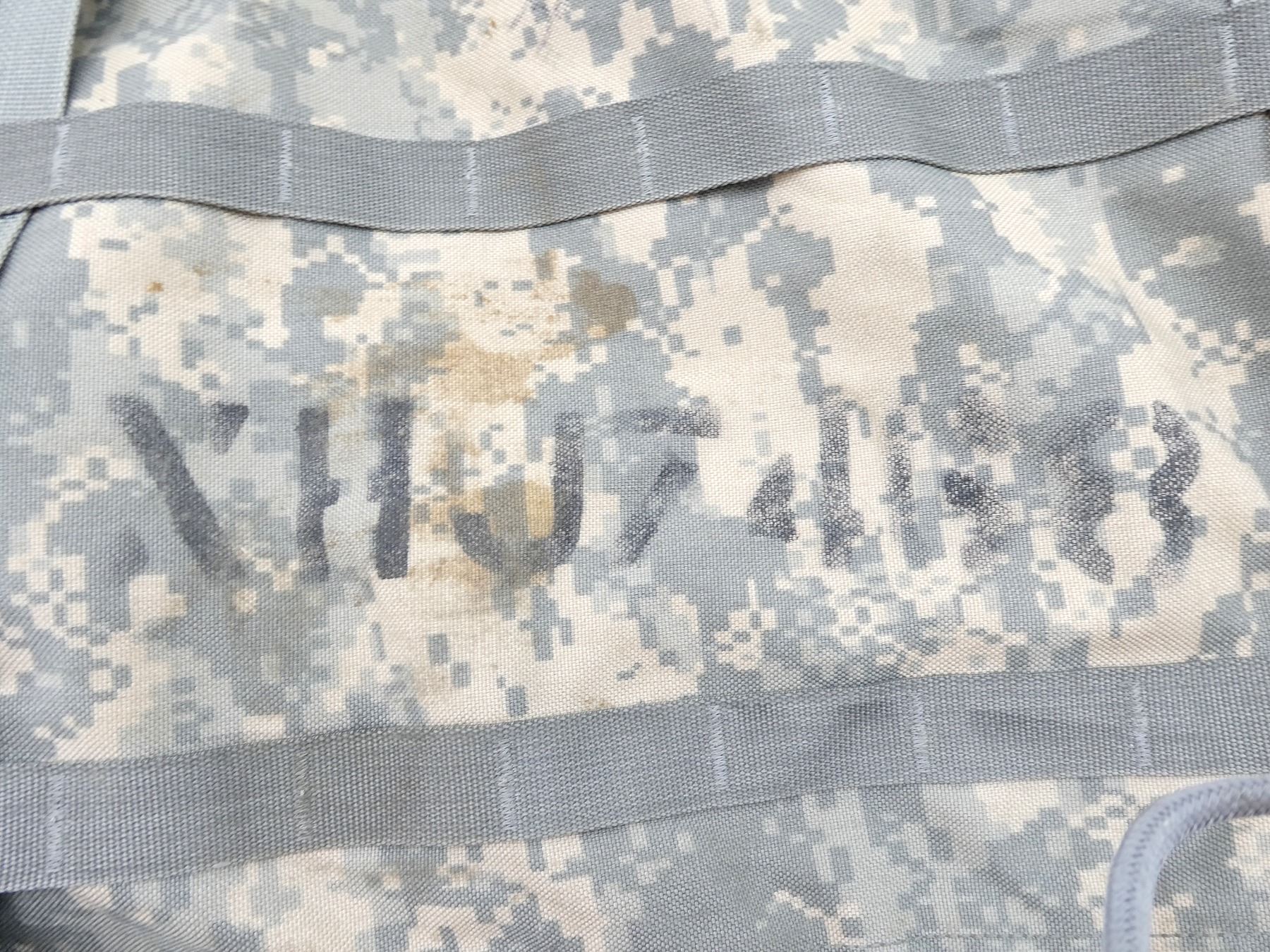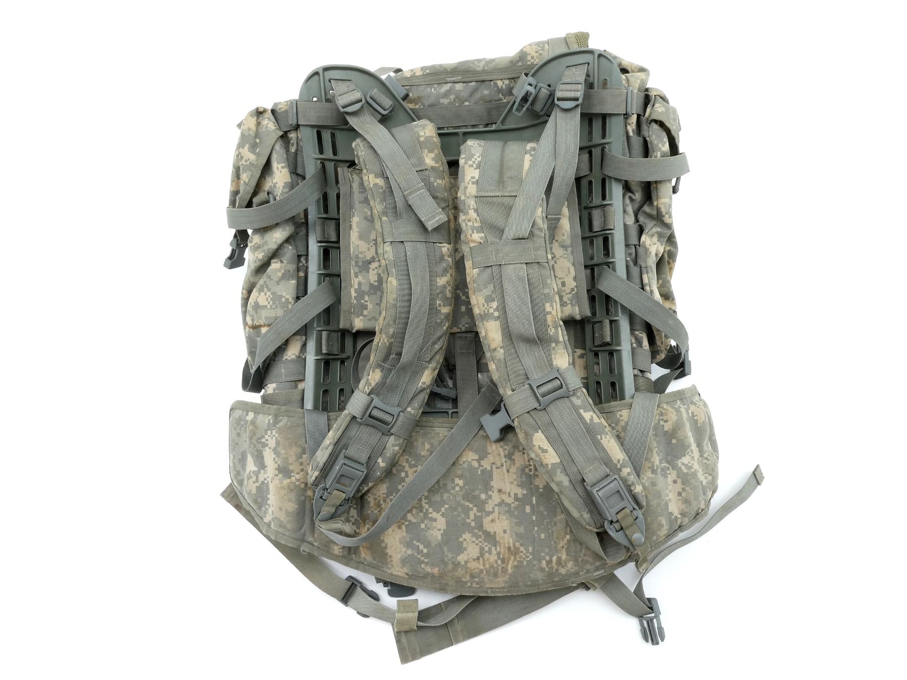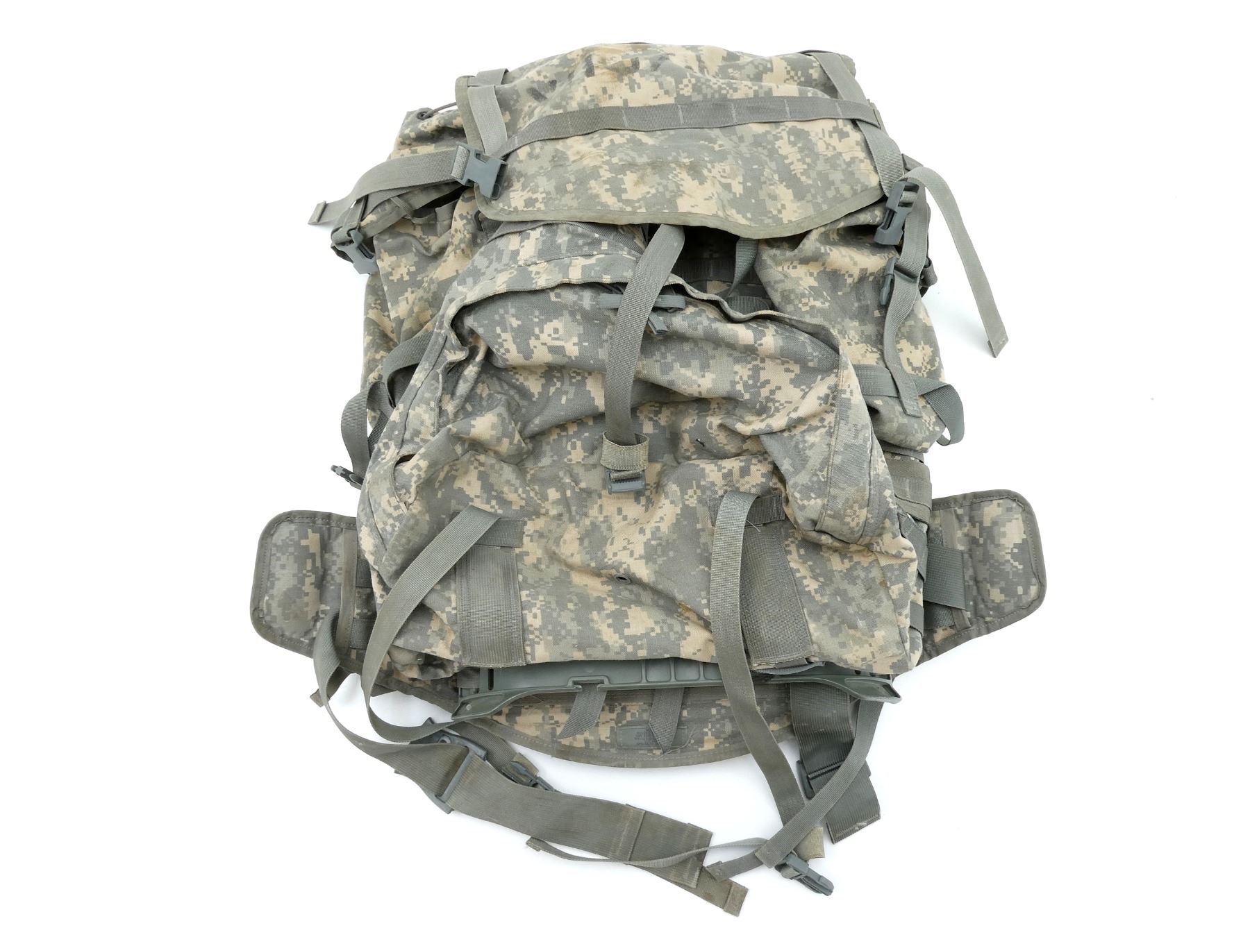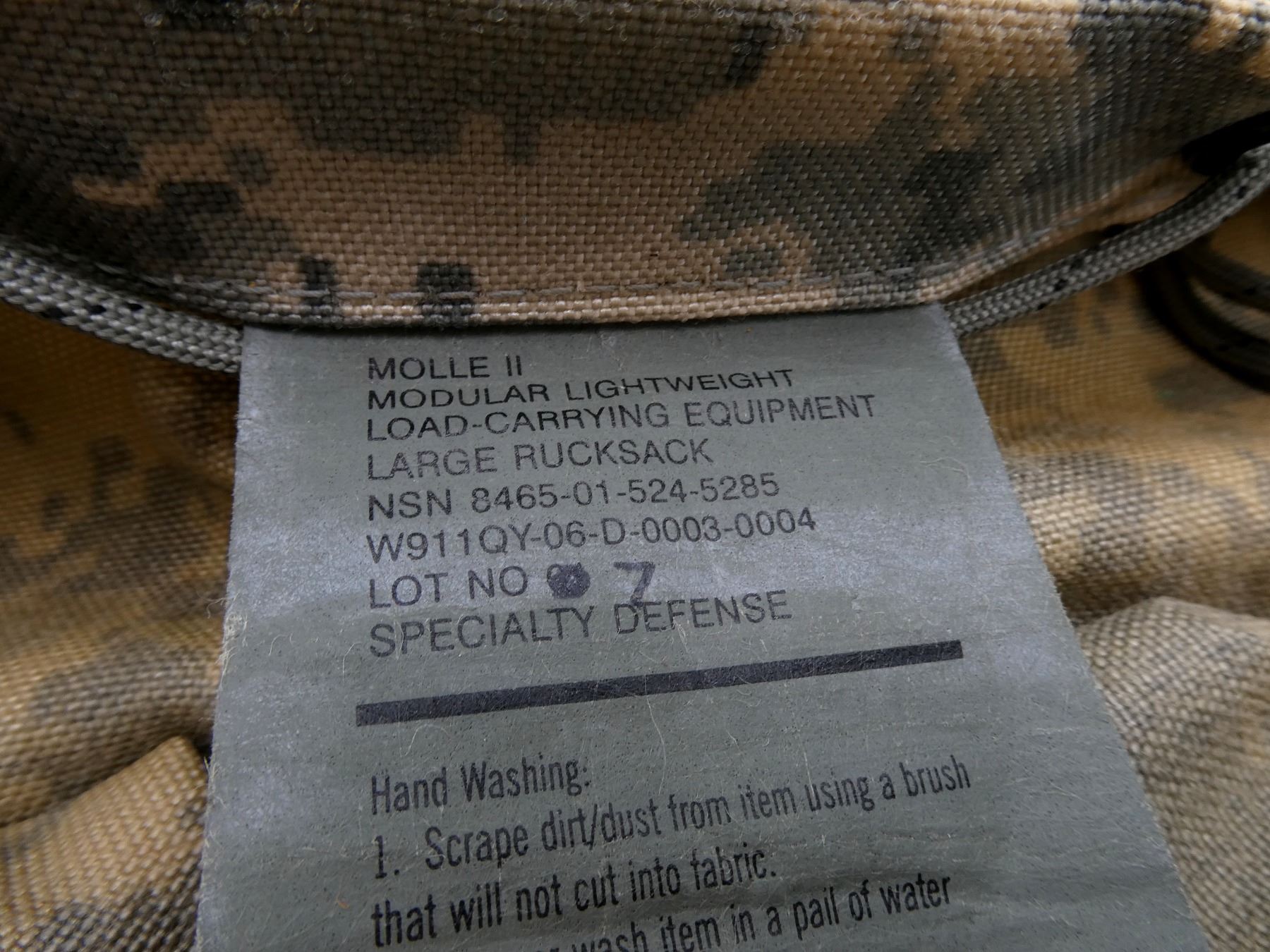LOT INCLUDES; (1) MOLLE II MODULAR LIGHTWEIGHT LOAD-CARRYING EQUIPMENT LARGE RUCKSACK WITH (2) MOLLE II MODULAR LIGHTWEIGHT LOAD-CARRYING EQUIPMENT SUSTAINMENT POUCHES, (1) MOLLE II ADVANCED SHOULDER STRAP (FRAME), (1) MOLLE II MOLDED WAIST BELT, ALL GREY DIGITAL STYLE CAMO, VARIOUS LABELS / MARKINGS WITH NSN'S, VARIOUS NYLON STRAPS, PLASTIC FITTINGS, SHOWS AGE / WEAR, MAIN COMPARTMENT 18" X 8" X 24" & CAN BE EXPANDED TO 22" X 20". SEE PHOTOS.