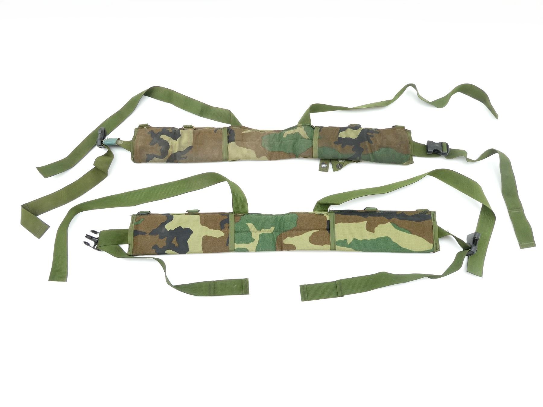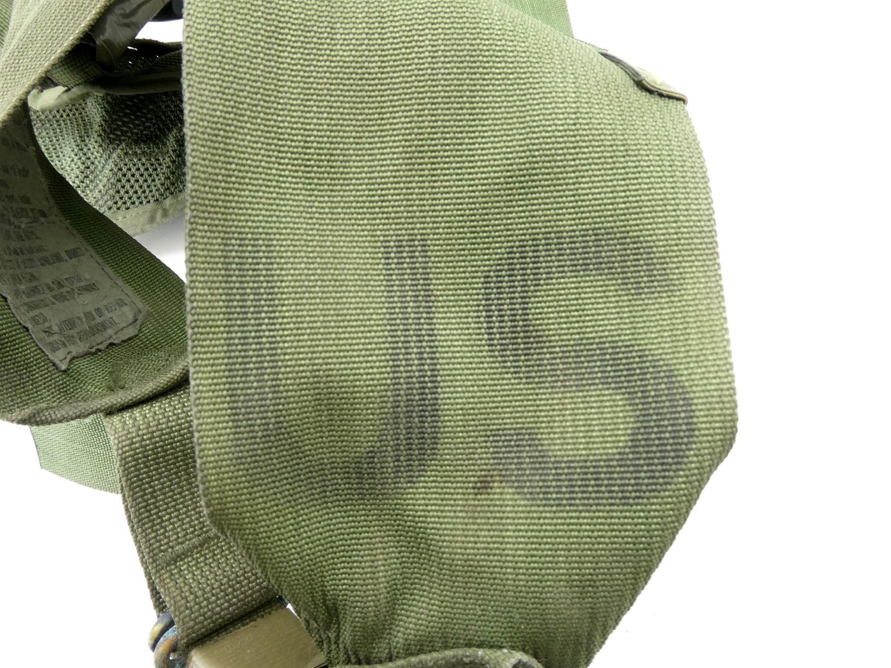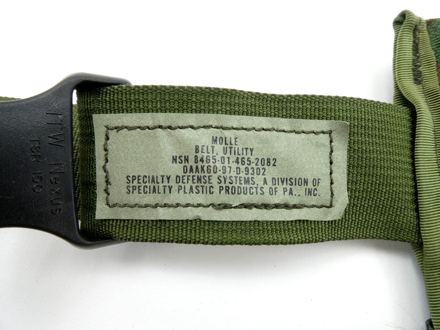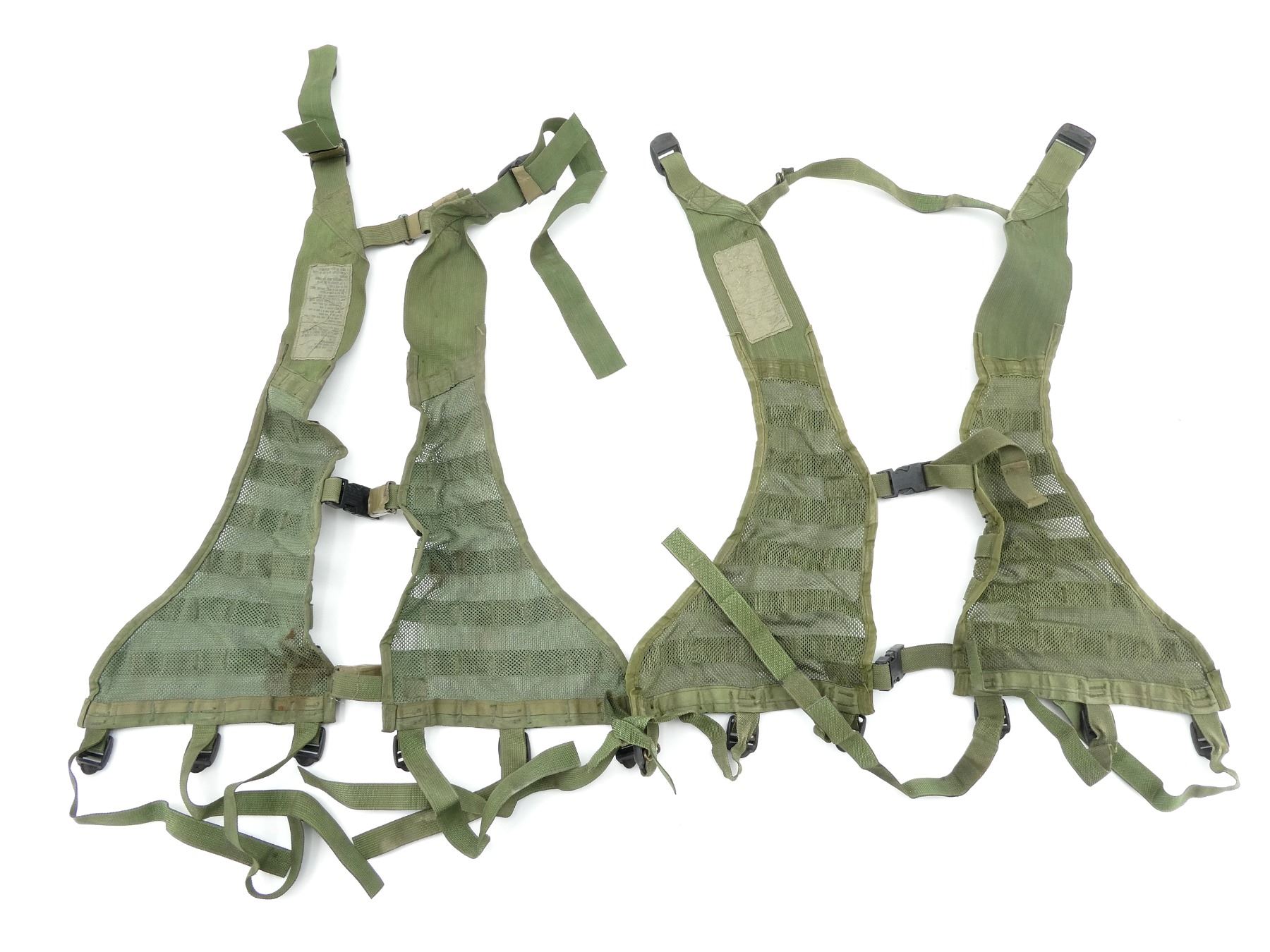 LOT INCLUDES; (2) GREEN / WOODLAND CAMO MOLLE UTILITY BELTS, VARIOUS MARKINGS, VARIOUS GREEN NYLON STRAPS, METAL / PLASTIC FITTINGS, SHOWS AGE / WEAR, OALS APPROX. 37", ADJUSTABLE & (2) GREEN NYLON MESH LOAD BEARING VESTS, VARIOUS MARKINGS, VARIOUS GREEN NYLON STRAPS, PLASTIC / METAL FITTINGS / BUCKLES, SHOWS AGE / WEAR & ADJUSTABLE. SEE PHOTOS.