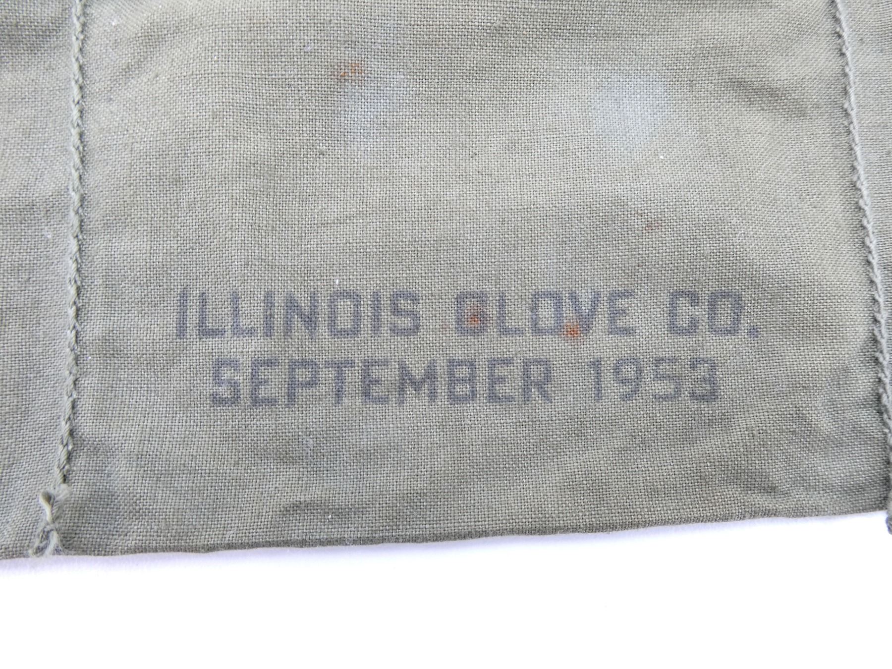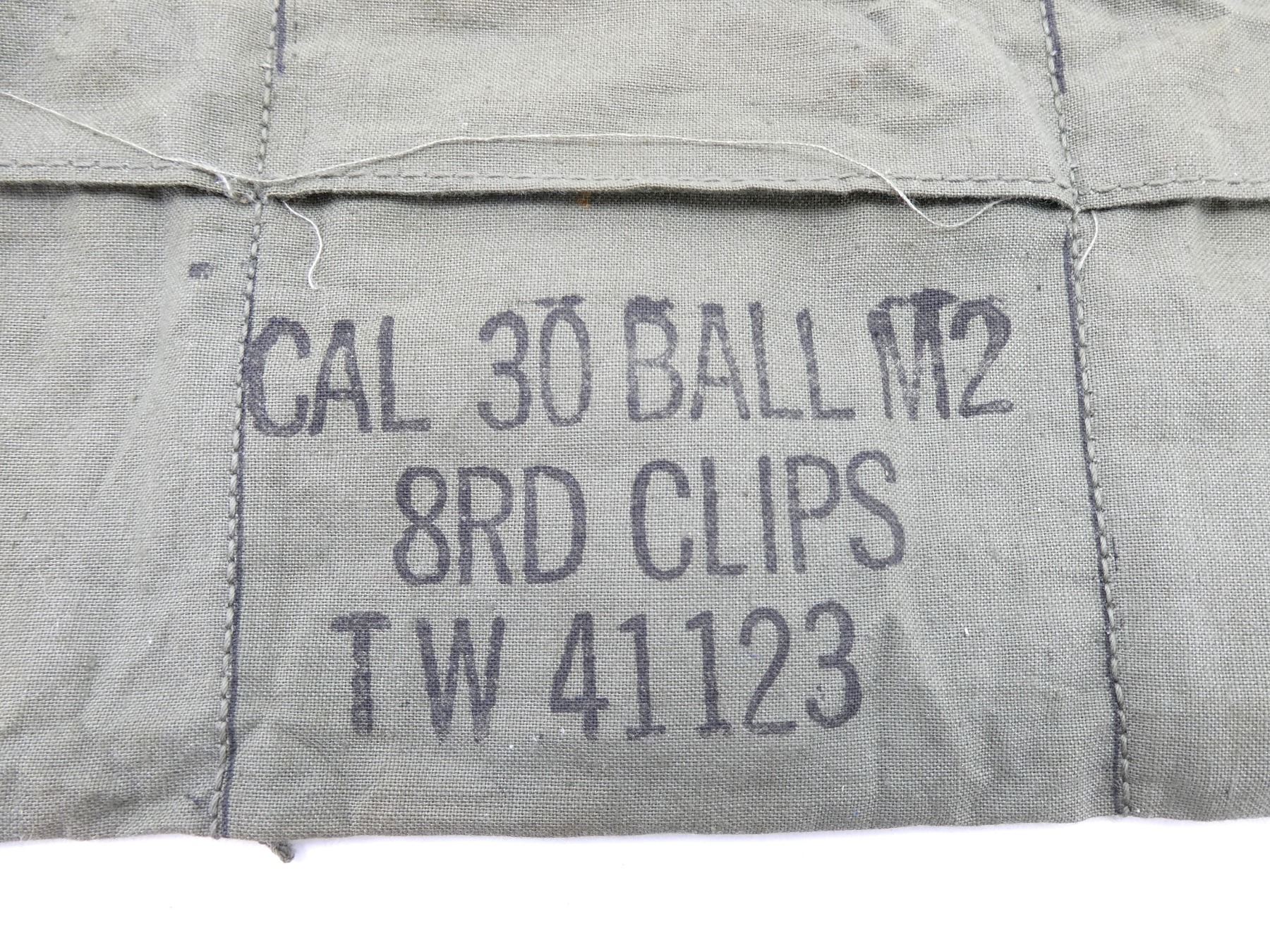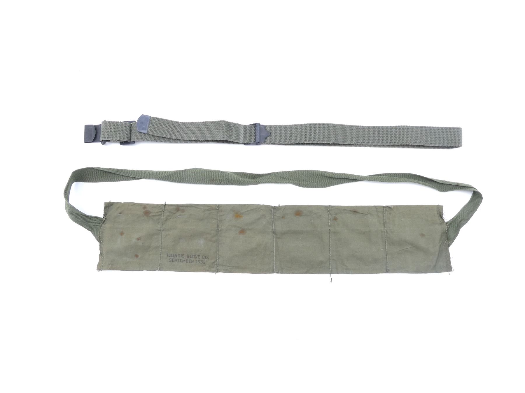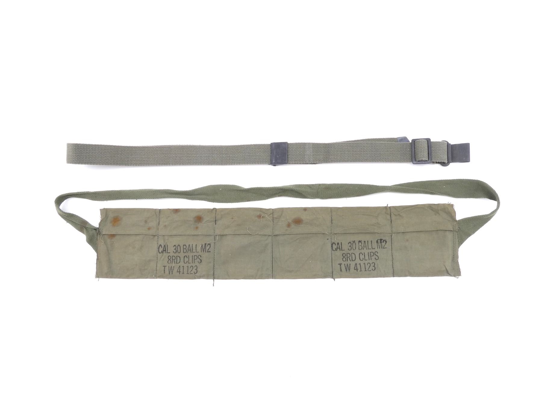 LOT INCLUDES; (1) GREEN CANVAS SLING WITH STEEL FITTINGS, NO VISIBLE MARKINGS, OVERALL LENGTH APPROX. 48", ADJUSTABLE & (1) GREEN CLOTH 6-POCKET BANDOLIER, MARKED: "CAL 30 BALL M2, 8RD CLIPS, TW41123", "ILLINOIS GLOVE CO., SEPTEMBER 1953". SEE PHOTOS.