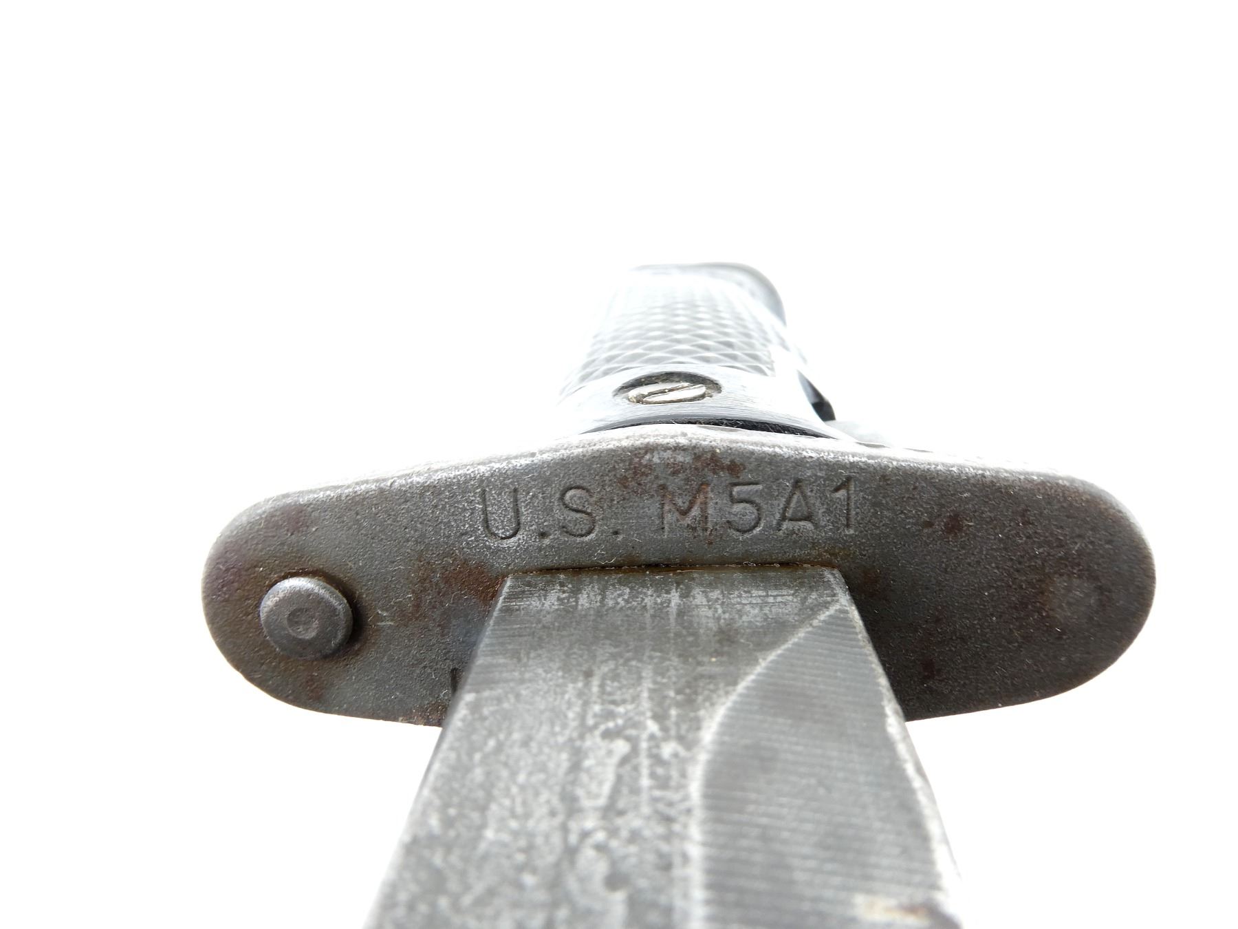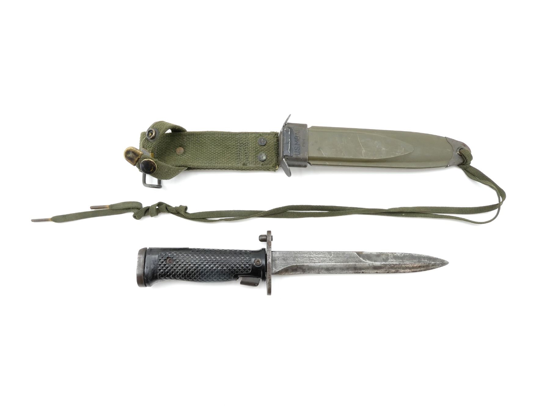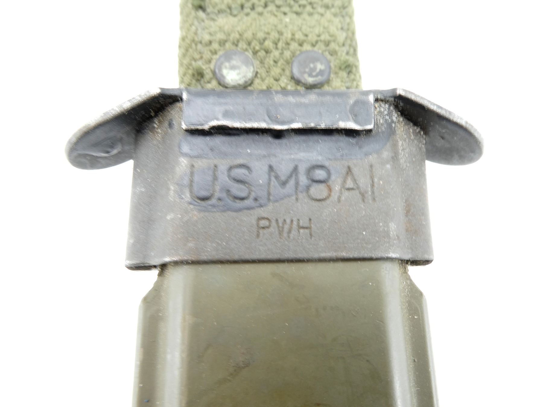 (1) FITS .30-06 M1 GARAND RIFLES, CROSS-PIECE MARKED: "U.S. M5A1, MILPAR COL", 2-PIECE BLACK CHECKERED GRIP, METAL POMMEL, NO VISIBLE MARKINGS, GREEN FIBERGLASS SCABBARD, MARKED: "U.S. M8A1, PWH", GREEN CANVAS FROG WITH METAL BELT HOOK, NO VISIBLE MARKINGS, BLADE APPROX. 6 5/8" & OVERALL LENGTH APPROX. 11.25". SEE PHOTOS.