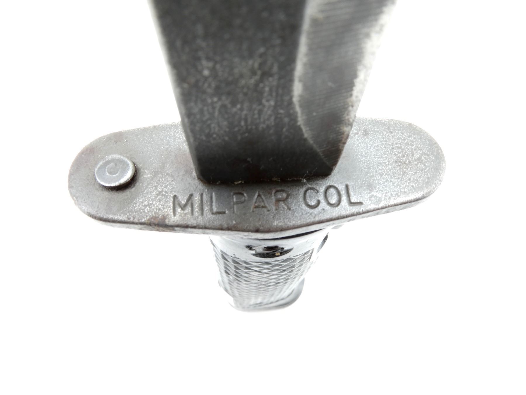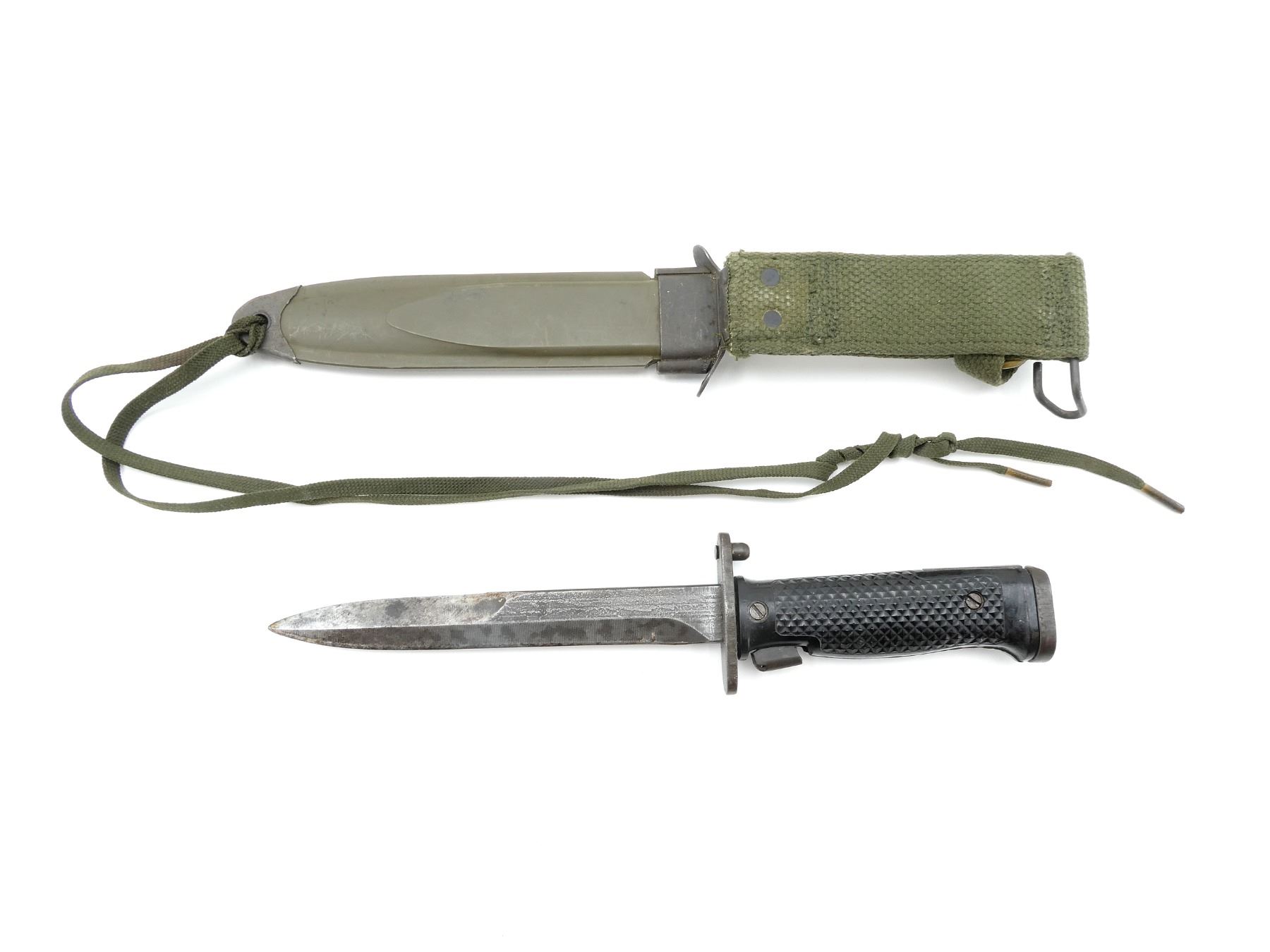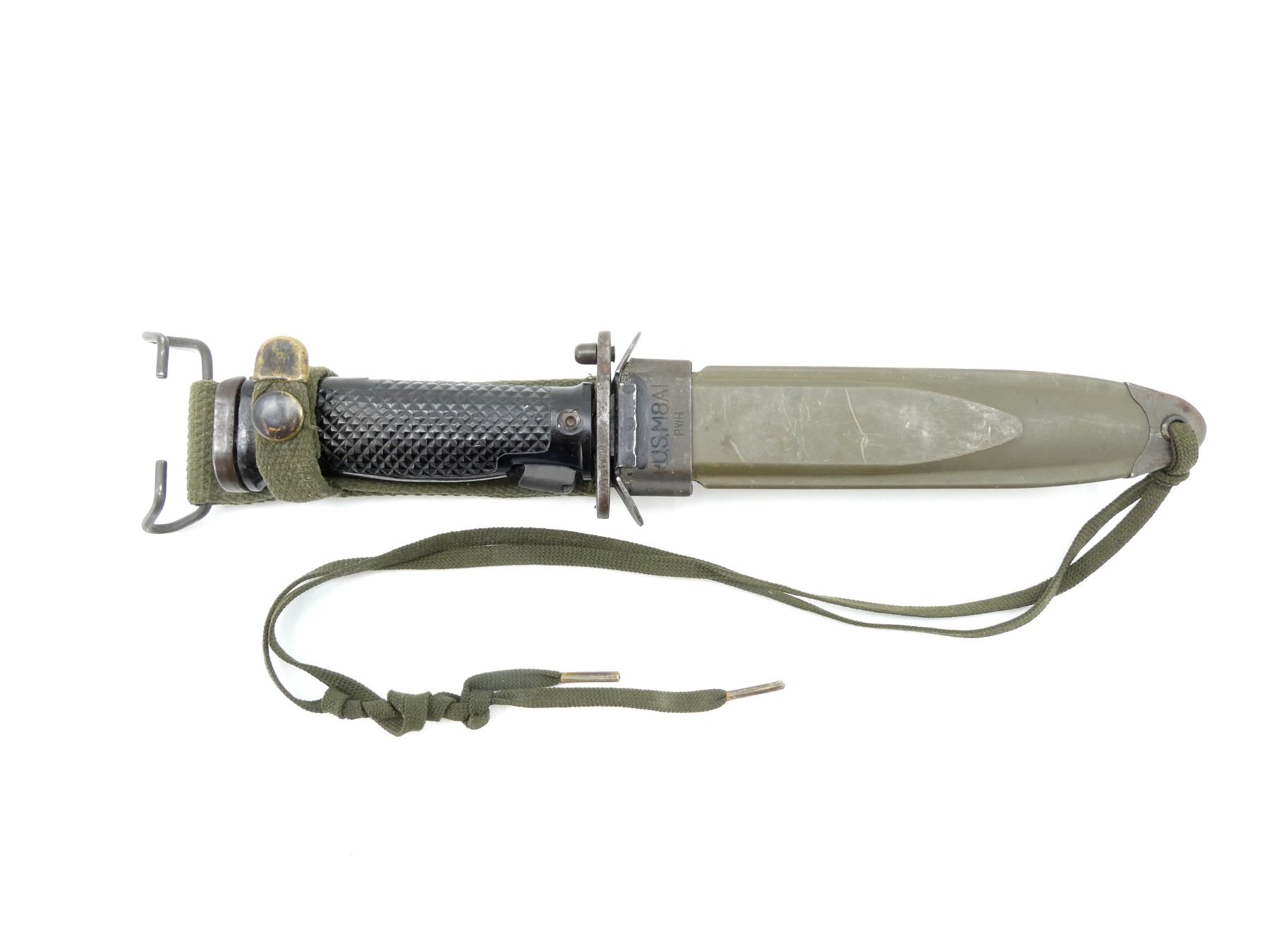 (1) FITS .30-06 M1 GARAND RIFLES, CROSS-PIECE MARKED: "U.S. M5A1, MILPAR COL", 2-PIECE BLACK CHECKERED GRIP, METAL POMMEL, NO VISIBLE MARKINGS, GREEN FIBERGLASS SCABBARD, MARKED: "U.S. M8A1, PWH", GREEN CANVAS FROG WITH METAL BELT HOOK, NO VISIBLE MARKINGS, BLADE APPROX. 6 5/8" & OVERALL LENGTH APPROX. 11.25". SEE PHOTOS.