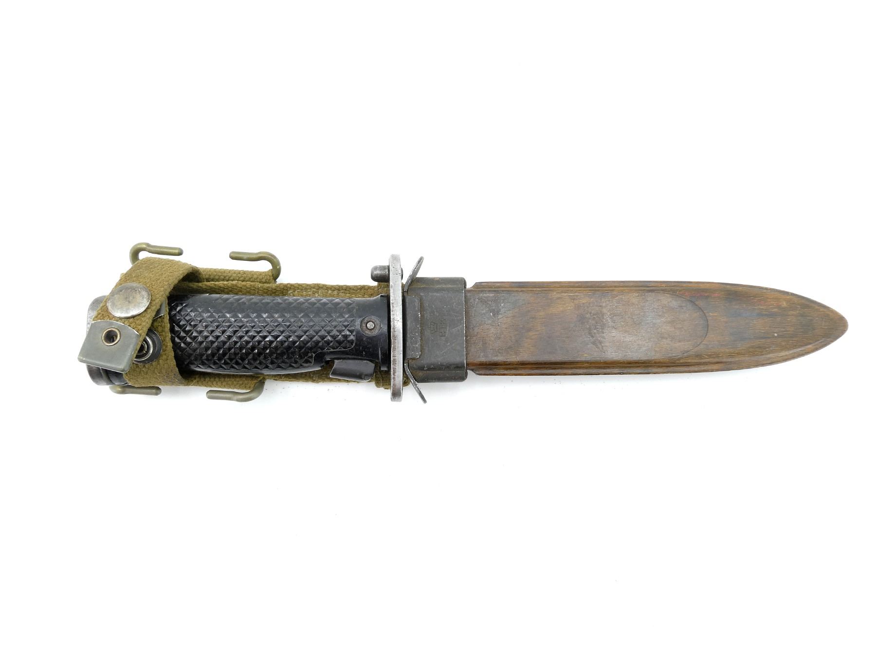 (1) FITS .30-06 M1 GARAND RIFLES, CROSS-PIECE MARKED: "U.S. M5A1, MILPAR COL", CROSS-PIECE IS LOOSE / MOVES, 2-PIECE BLACK CHECKERED GRIP, METAL POMMEL MARKED: "117", DUTCH MILITARY FIBERGLASS SCABBARD, MARKED: CROWN OVER "HTK", GREEN CANVAS FROG WITH PLASTIC BELT HOOKS, NO VISIBLE MARKINGS, BLADE APPROX. 6 5/8" & OVERALL LENGTH APPROX. 11.25". SEE PHOTOS.