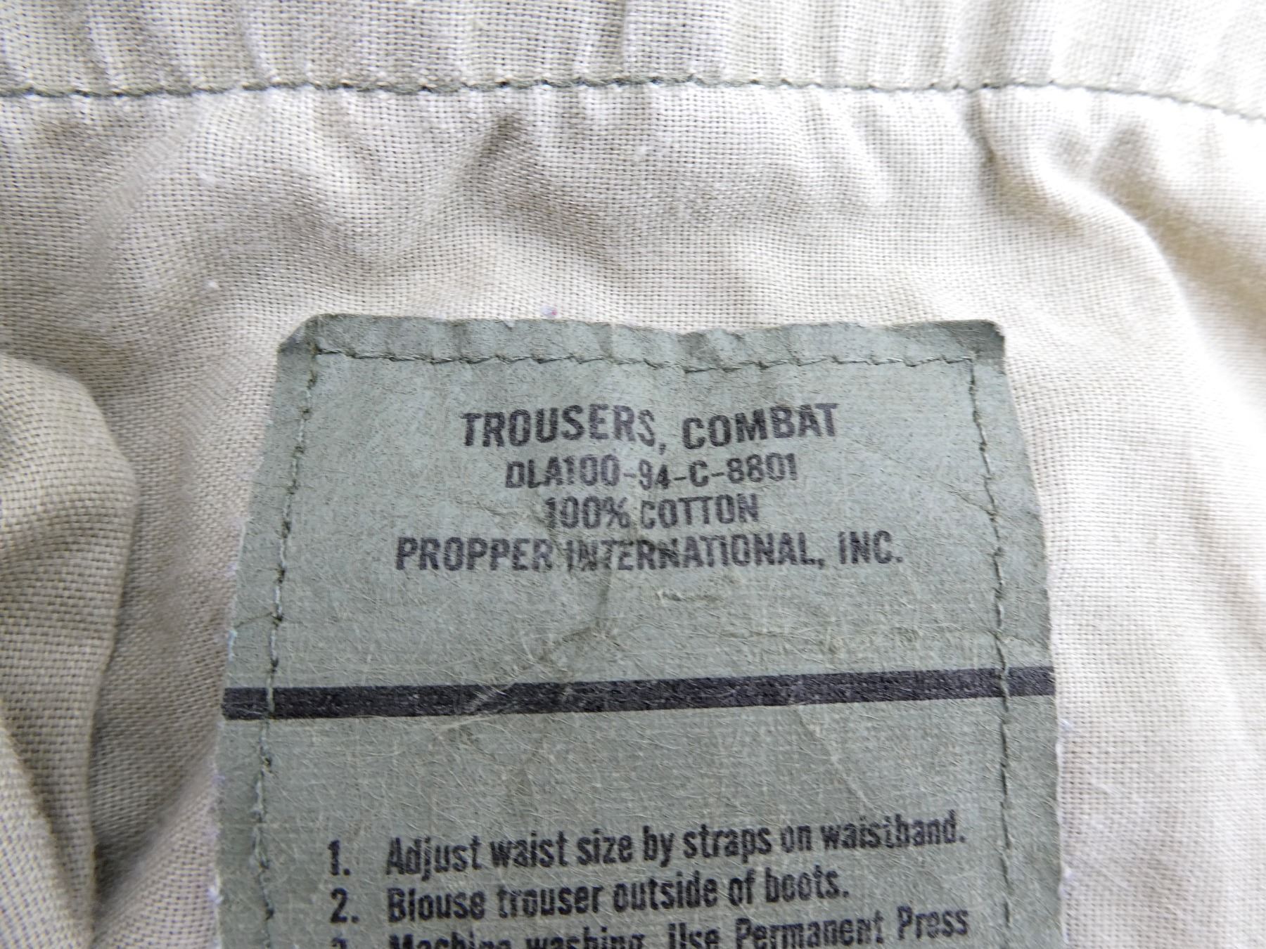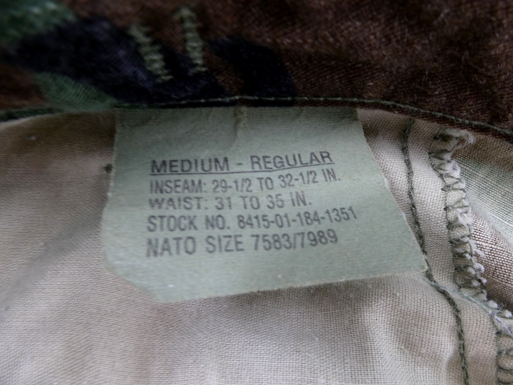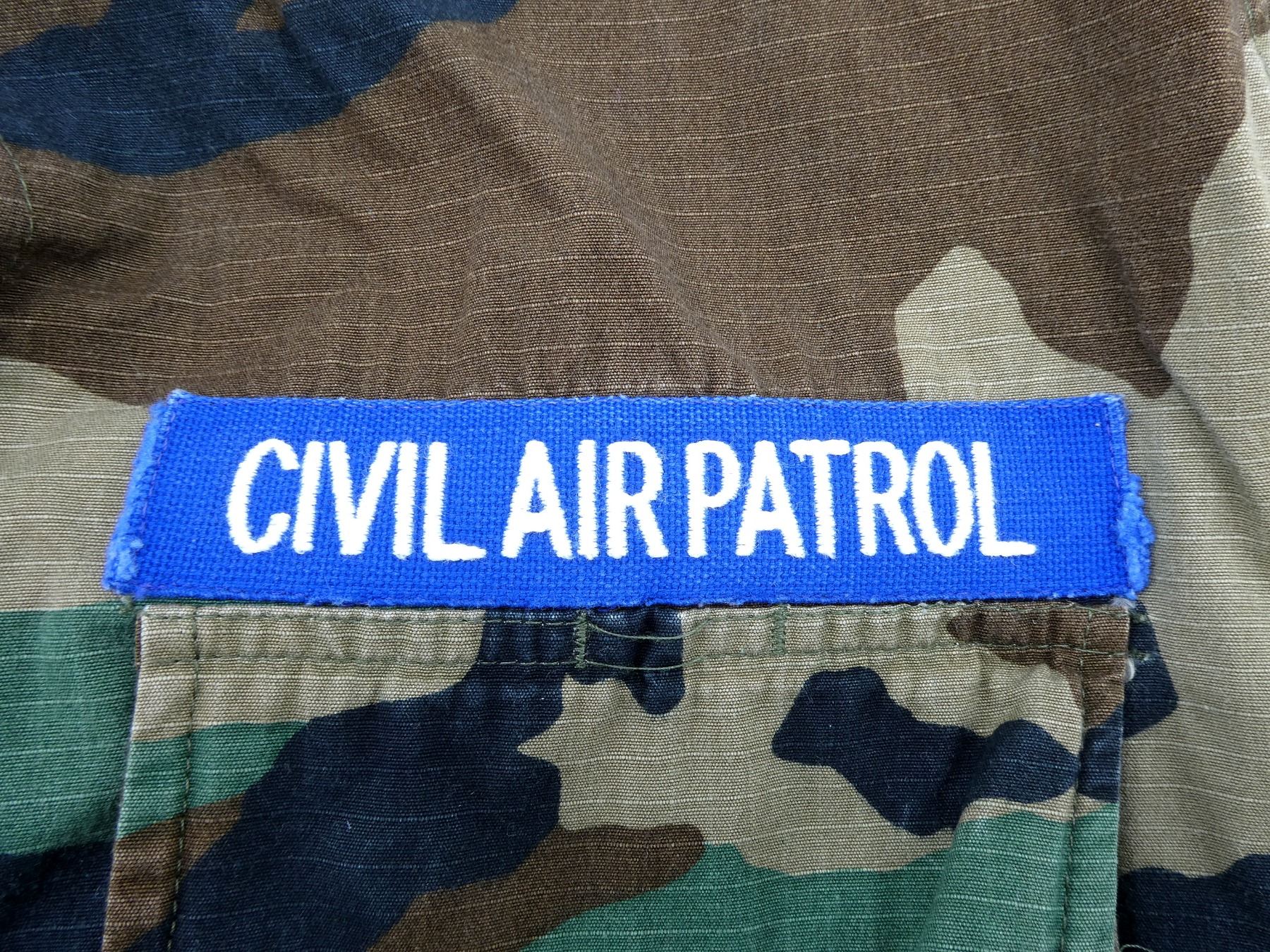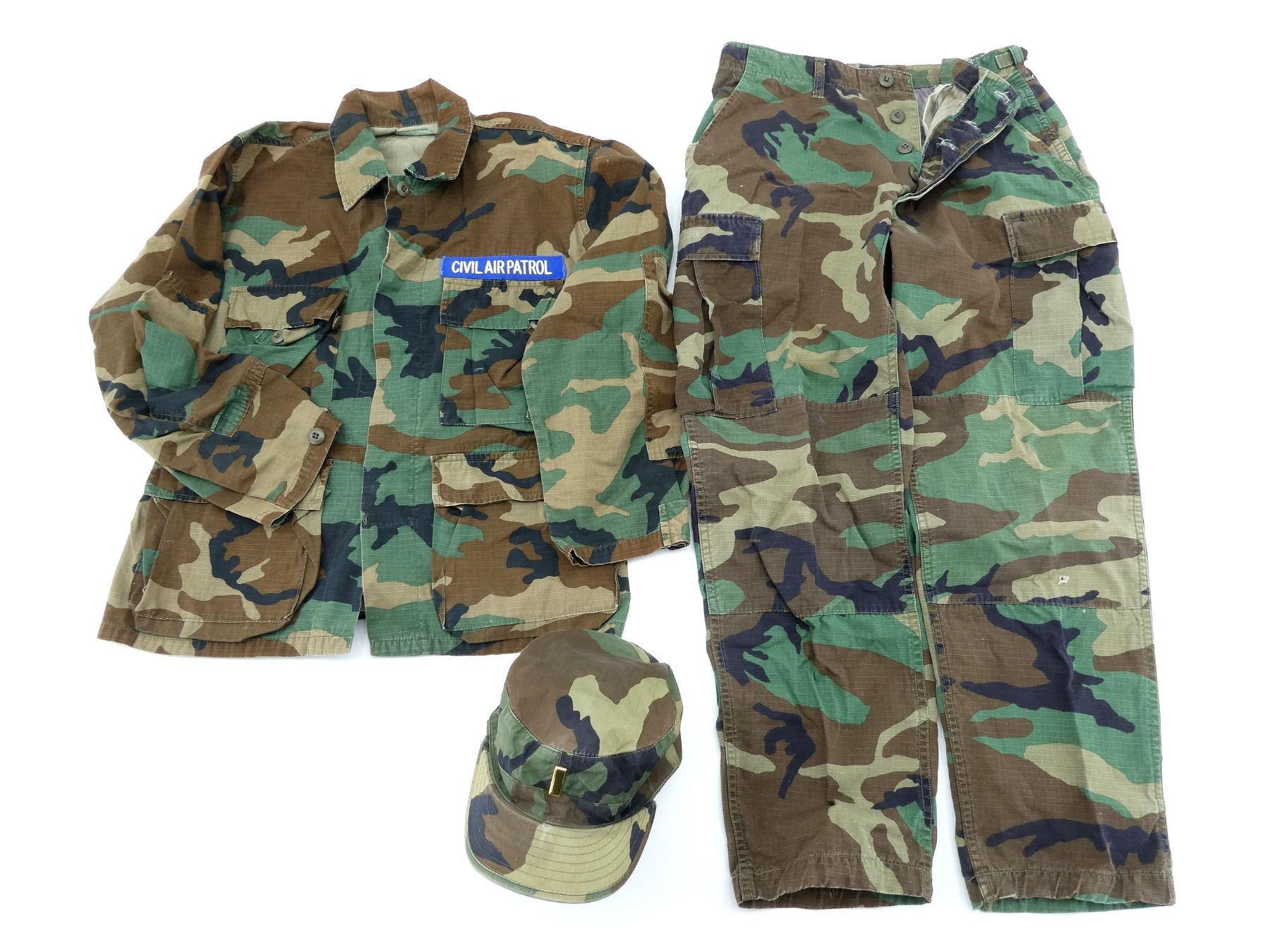 LOT INCLUDES; (1) WOODLAND PATTERN CAMO COMBAT SHIRT, MARKED: "COAT, HOT WEATHER, WOODLAND, CAMOUFLAGE PATTERN COMBAT" ETC., "MEDIUM-REGULAR, 8415-01-184-1330, NATO SIZE 7080/9404" ETC., CIVIL AIR PATROL BREAST BADGE, BUTTON-FRONT, (1) WOODLAND PATTERN CAMO COMBAT PANTS, MARKED: "TROUSERS, COMBAT, DLA100-94-C-8801" ETC., "MEDIUM-REGULAR, 8415-01-184-1351, NATO SIZE 7583/7989" ETC., BUTTON-FLY & (1) WOODLAND PATTERN CAMO FIELD CAP, MARKED: "CAP, CAMOUFLAGE PATTERN, CLASS 1, SPO100-96-F-CC48, 8415-01-084-1687, SIZE 7 1/2" ETC., WITH GOLD 2ND LIEUTENANT RANK BAR. SEE PHOTOS.