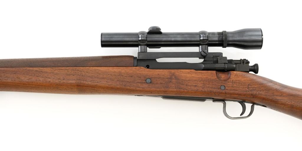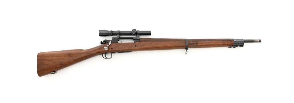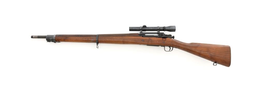 U.S. Remington Arms Model 1903-A3 Bolt Action Rifle, #3548462, .30-06 cal., 24" barrel, parkerized finish, bright bolt, walnut stock, no sights. Rifle was commercially made into a sniper rifle with some blued parts, and topped with a Redfield base and El Paso Weaver K2.5 scope with blued finish and fine crosshair reticle. Scope optics are clear, exterior shows moderate age and wear. Receiver marking is partially visible due to the scope mount. Barrel is marked "RA/(Flaming Bomb)/3-43" with a "P" underneath. Rifle is in fine overall condition, retaining approx. 85%+ reblued finish, with wear on the trigger housing and front of the barrel. Stock is a Smith-Corona with a boxed "FJA" (Lt. Col. Frank J. Atwood) cartouche and circled "P" behind the trigger guard. Stock is in very good condition, with wear mostly in front of the barrel band, and a channel was added for the bent bolt. Action works properly and has a replacement commercial safety. Four-groove bore is very good with clearly defined rifling. Est.: $1,000-$1,400. (C&R)