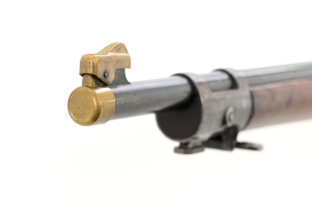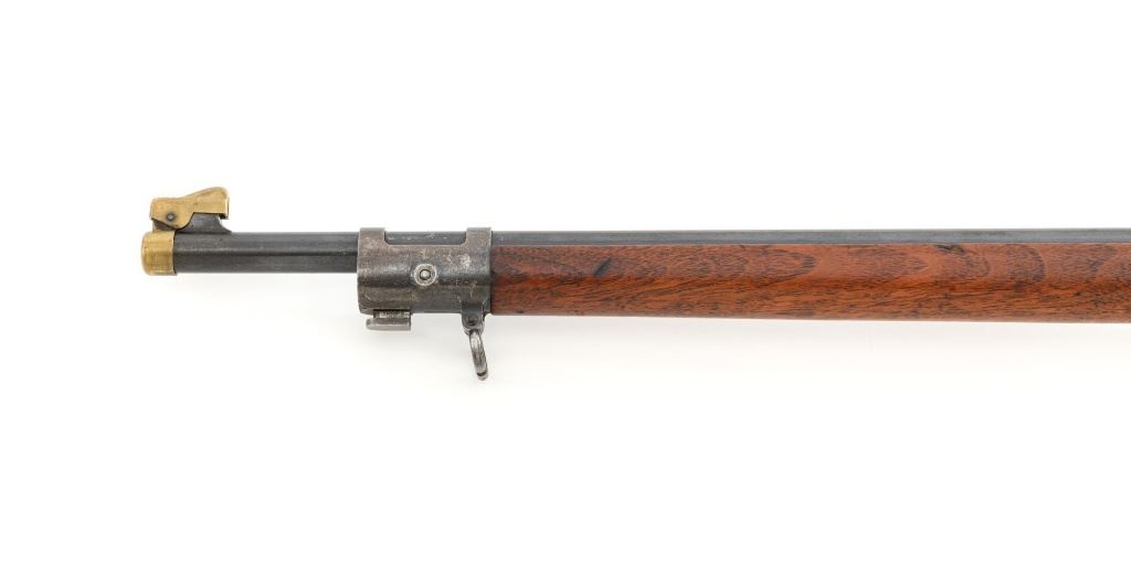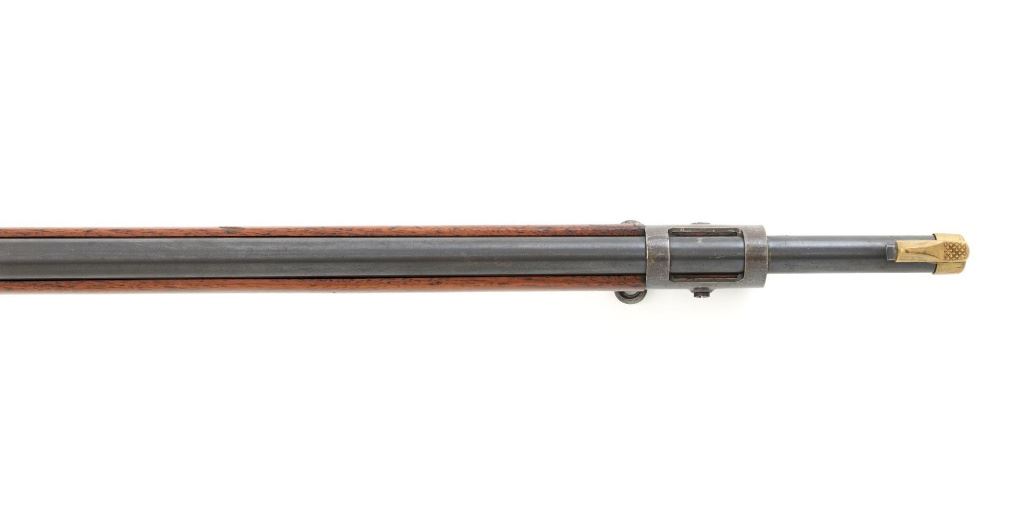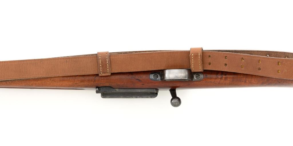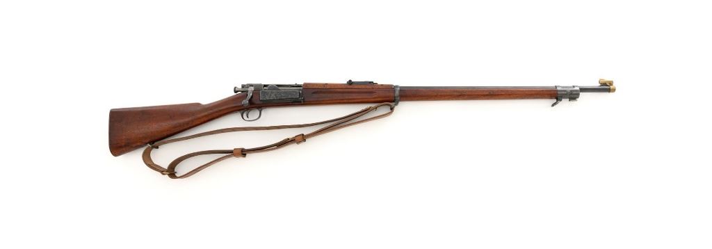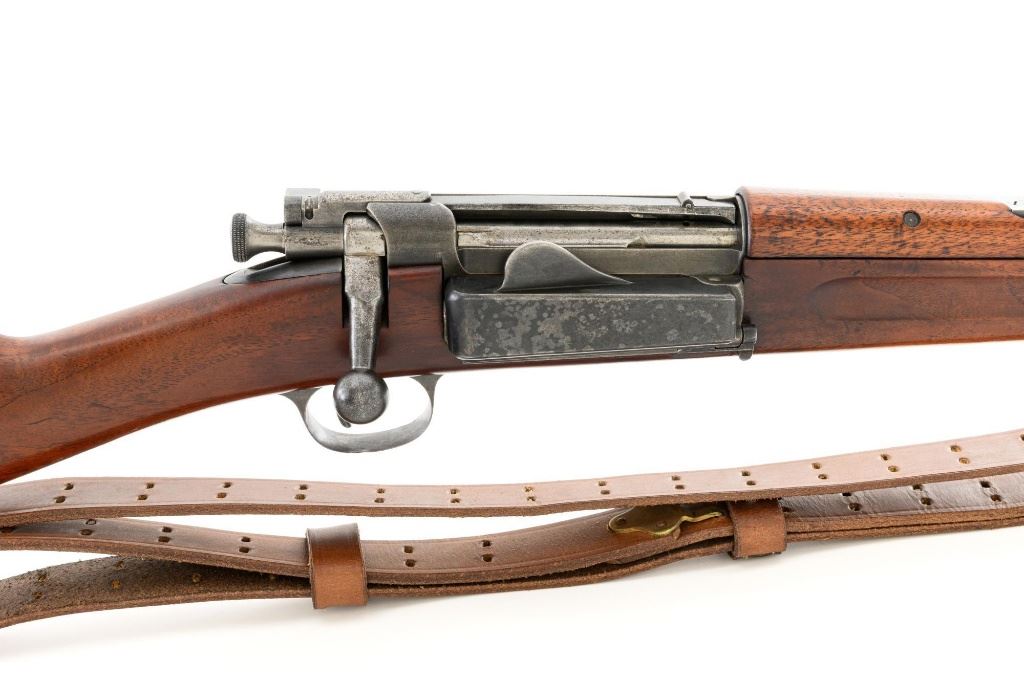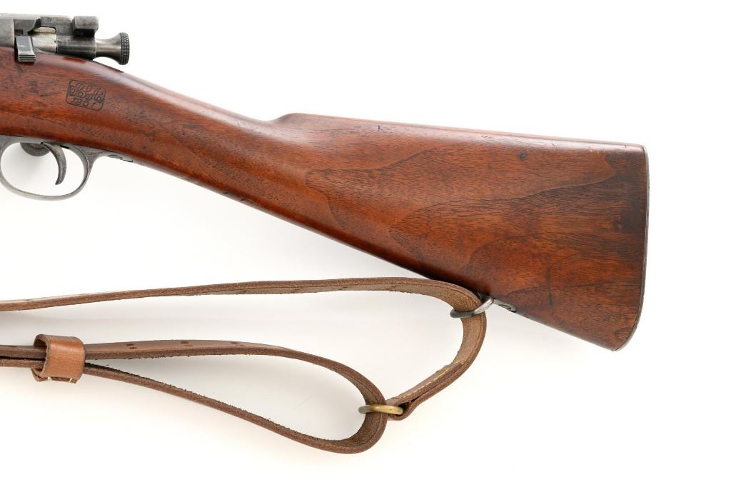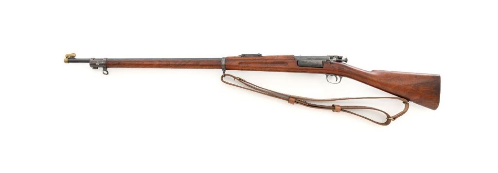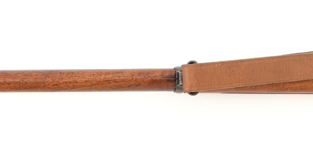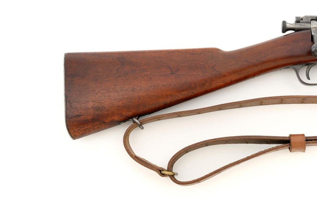 U.S. Springfield Armory Model 1898 Krag Bolt Action Rifle, #327042, .30-40 Krag cal., 30" barrel with brass muzzle cover, blued finish, walnut stock, blade front sight, and M1901 adjustable rear sight. A commercial leather sling is attached. Receiver is marked "U.S./MODEL 1898 SPRINGFIELD ARMORY 327042" on the left side. Rifle is in very good overall condition, retaining approx. 70% thinning and toning blue, mottled on the receiver, showing additional wear to the barrel band and buttplate. Stock has a boxed "JSA/1901" cartouche on the left side and a circled "P" behind the trigger guard. Stock is in very good condition, with scattered moderate dents and scratches. Three-piece cleaning rod is stored in the butttrap. Action works properly. Bore is very good with clearly defined rifling. A very collectible original rifle. Est.: $1,000-$1,500. (C&R)