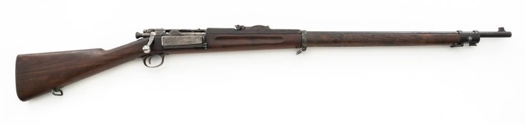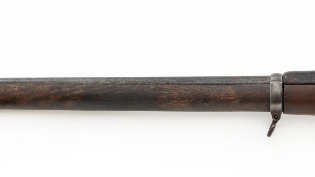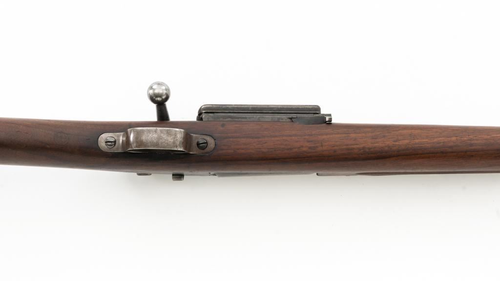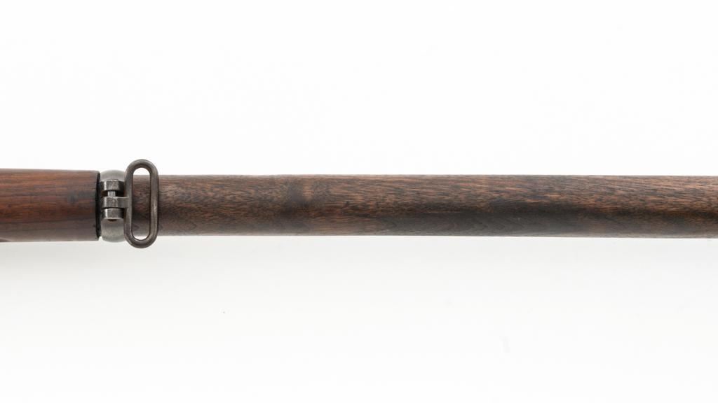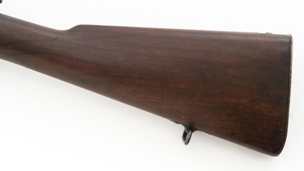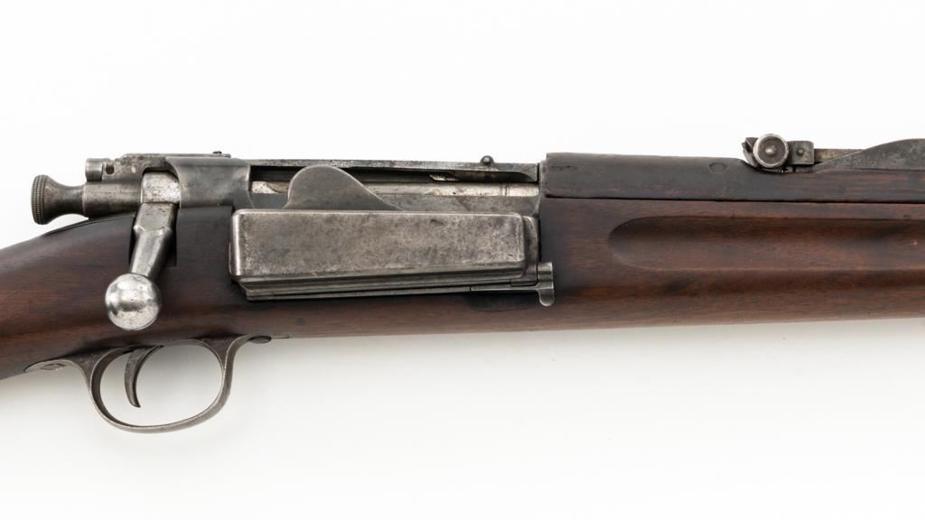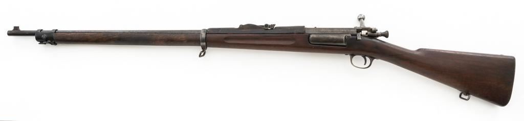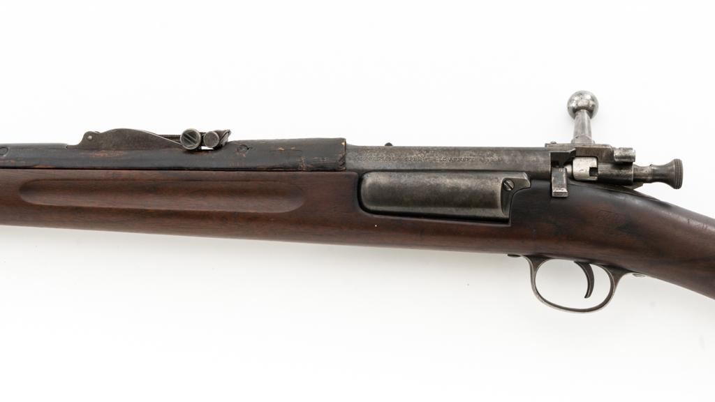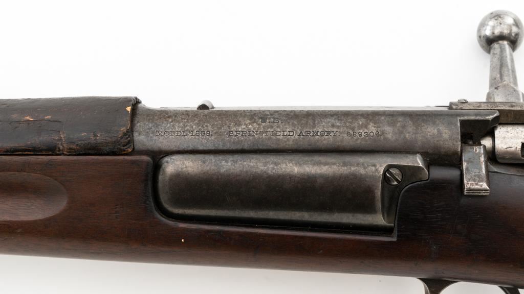 U.S. Springfield Armory Model 1898 Krag Bolt Action Rifle, #289306, .30-40 Krag cal., 30" barrel, blued finish, walnut stock, missing the front sight blade, with a M1902 adjustable "U"-notched rear sight. Receiver is marked "U.S./MODEL 1898 SPRINGFIELD ARMORY 289306" on the left side. Rifle is in good overall condition. Metal with a mottled appearance consisting of toning blue and moderate patina, with a few scattered spots of light rust. Stock is marked with a boxed "JSA/1900" on the left side, and a circled "P" behind the trigger guard. Forend of the stock is joined under the barrel band and is modified from another rifle, and shows more wear than the rear portion. Remainder of the stock is very good, with light handling marks and scratches. Rear of the handguard was repaired with plastic wood and has several dents and scratches. Action works properly. Bore is good bore with light pitting and clear rifling. Est.: $500-$800. (C&R)
