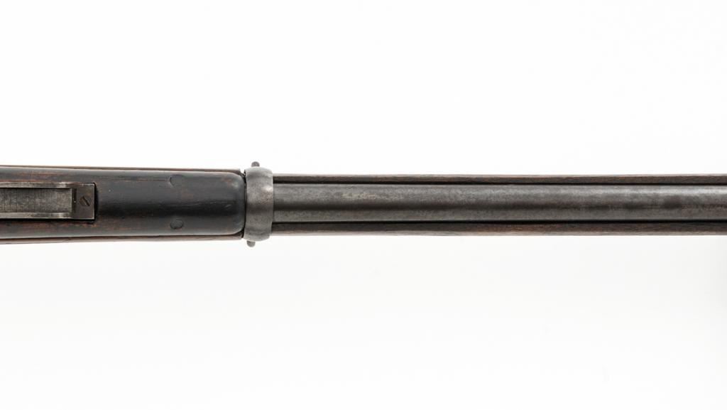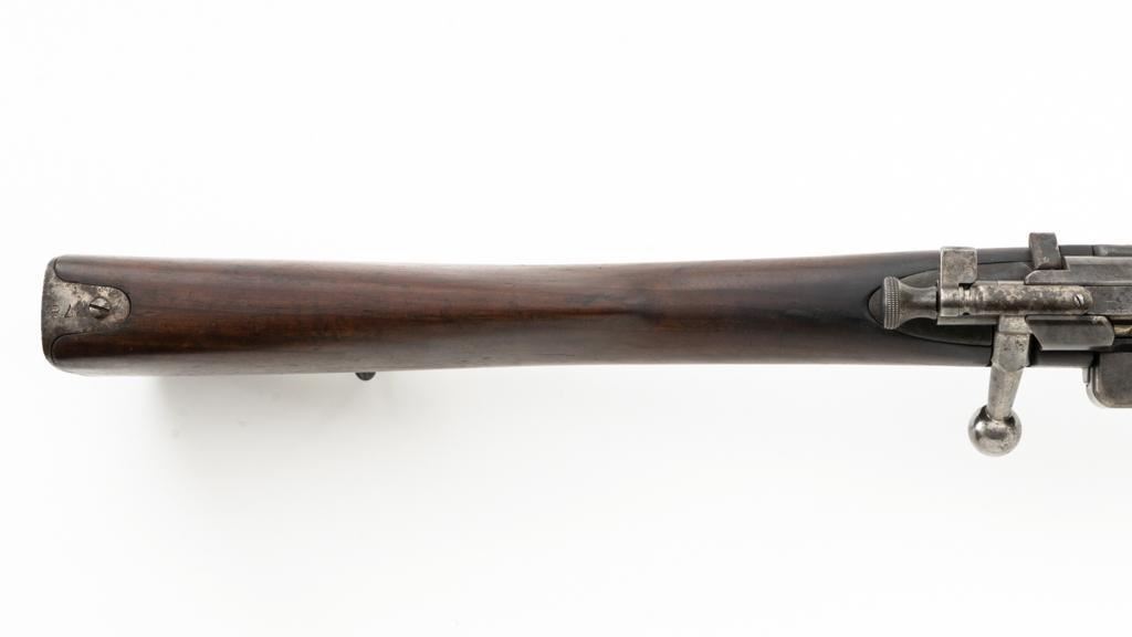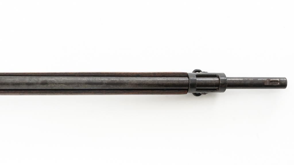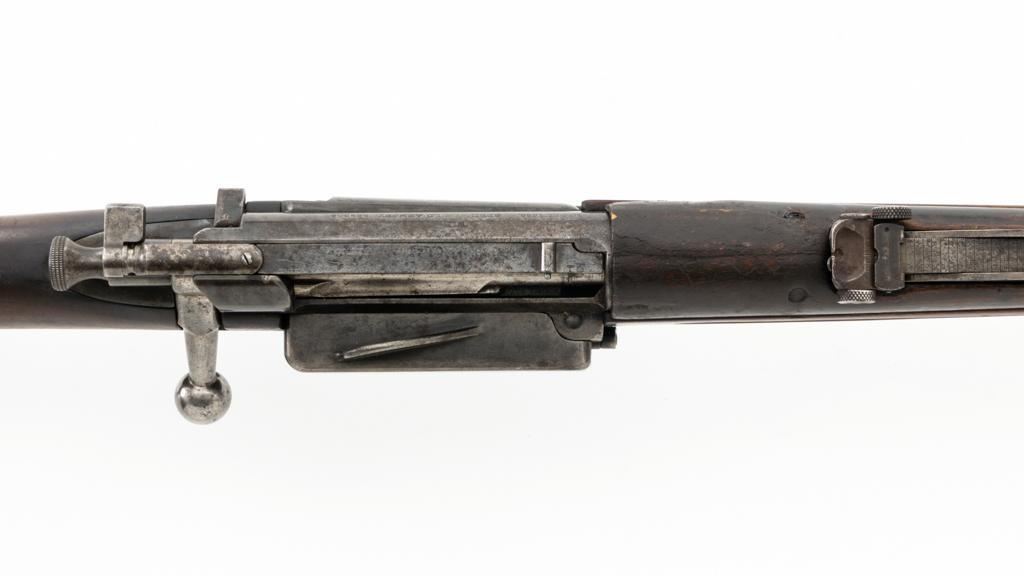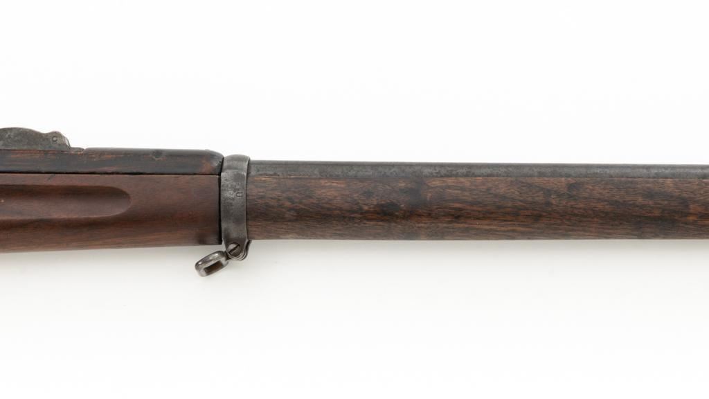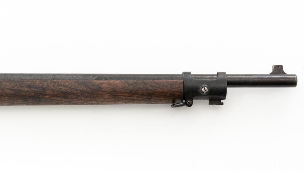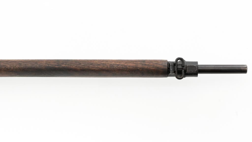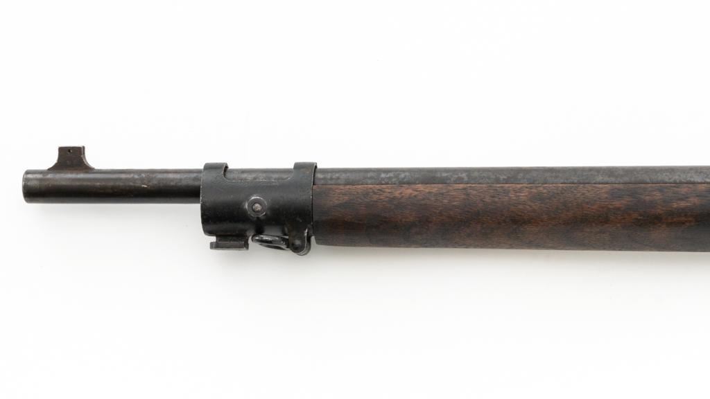 U.S. Springfield Armory Model 1898 Krag Bolt Action Rifle, #289306, .30-40 Krag cal., 30" barrel, blued finish, walnut stock, missing the front sight blade, with a M1902 adjustable "U"-notched rear sight. Receiver is marked "U.S./MODEL 1898 SPRINGFIELD ARMORY 289306" on the left side. Rifle is in good overall condition. Metal with a mottled appearance consisting of toning blue and moderate patina, with a few scattered spots of light rust. Stock is marked with a boxed "JSA/1900" on the left side, and a circled "P" behind the trigger guard. Forend of the stock is joined under the barrel band and is modified from another rifle, and shows more wear than the rear portion. Remainder of the stock is very good, with light handling marks and scratches. Rear of the handguard was repaired with plastic wood and has several dents and scratches. Action works properly. Bore is good bore with light pitting and clear rifling. Est.: $500-$800. (C&R)