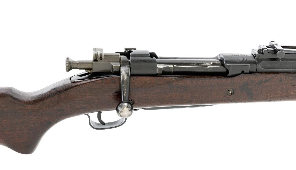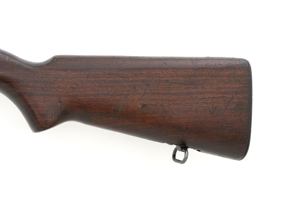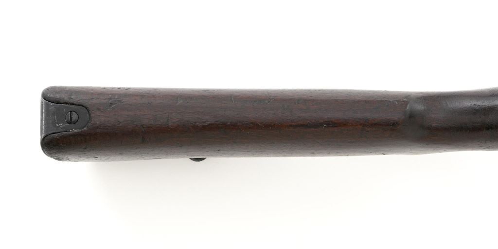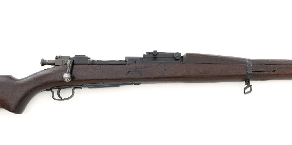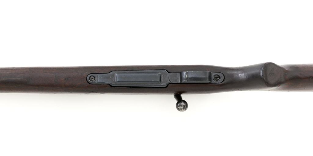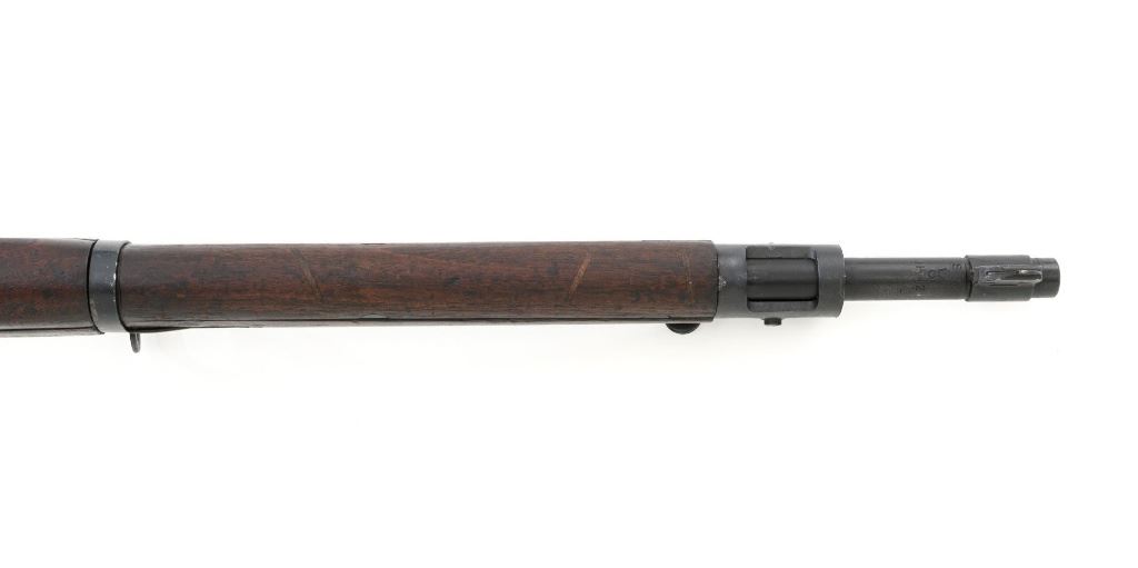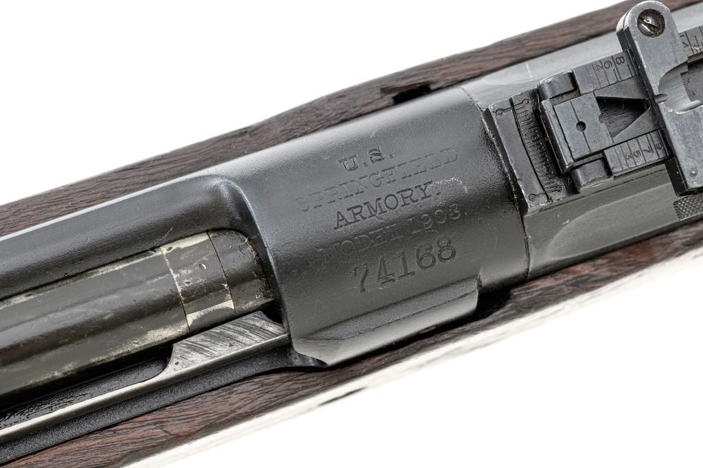 U.S. Springfield Armory Model 1903 Bolt Action Rifle, #74168, .30-06 cal., 24" barrel, black oxide finish, walnut stock, blade front sight, and M1905 adjustable rear sight. Rifle was originally made in 1905 and arsenal rebuilt with mixed parts. Receiver is marked "U.S./SPRINGFIELD/ARMORY/MODEL 1903/74168". Replacement barrel is marked "SA/(Flaming Bomb)/11-42" with a "P" underneath. No visible import marks. Rifle is in very good overall condition, retaining approx. 85%+ arsenal refinish, with wear on the bolt, some scattered high point wear and mild frosting. Pistol grip stock is cut for a 03-A3 and marked "RA-P" (Raritan Arsenal) on the left side, "1468" on the right side, with an "S" and "U" on the pistol grip. Stock is good, with scattered dents and scratches, heavier in front of the barrel band and on the right side below the receiver. Action works properly. Bore is very good showing normal light wear. Est.: $800-$1,200. (C&R)