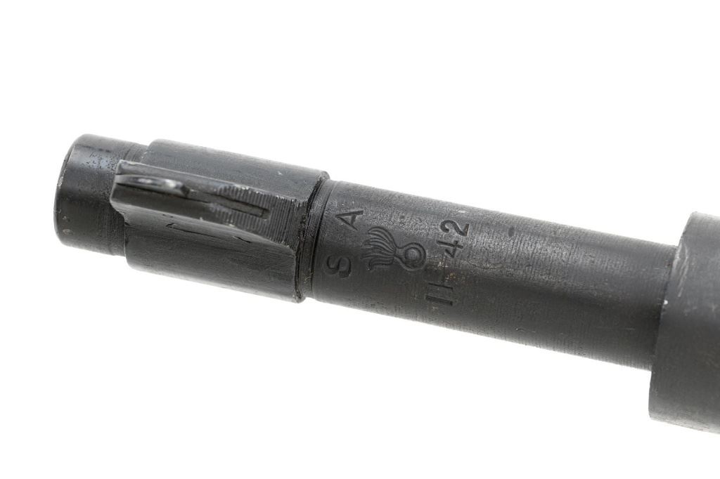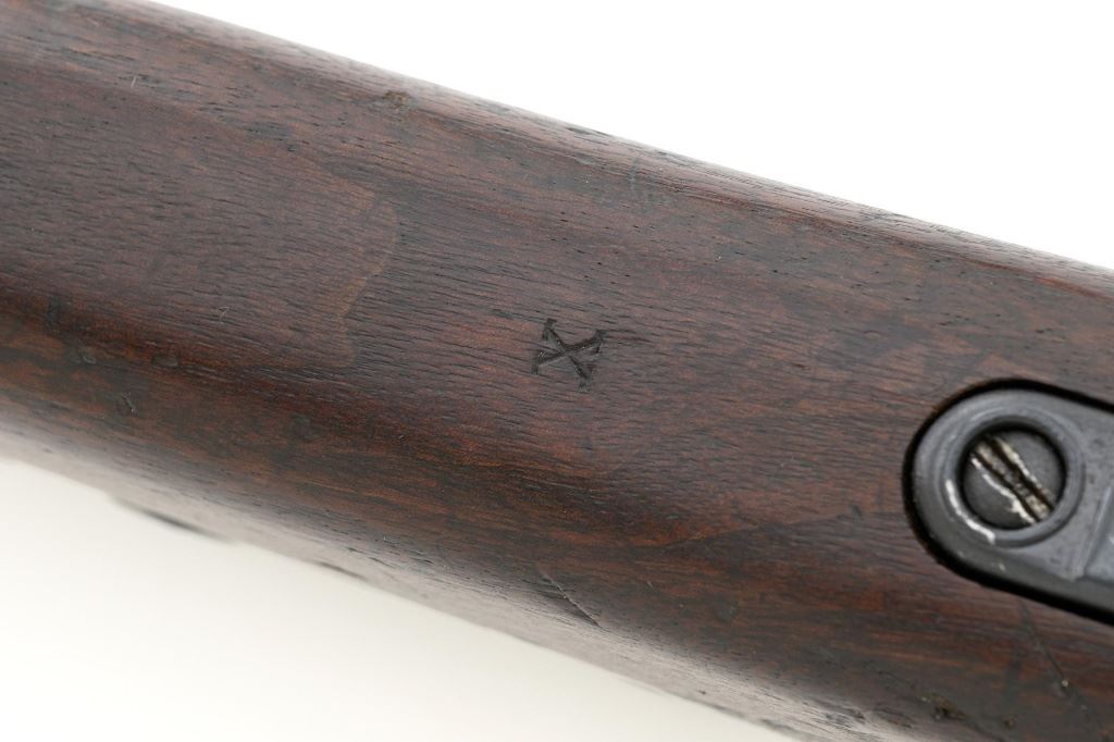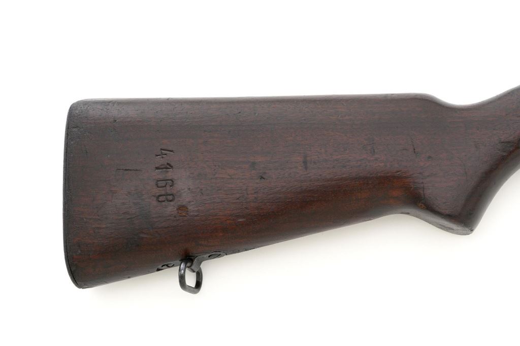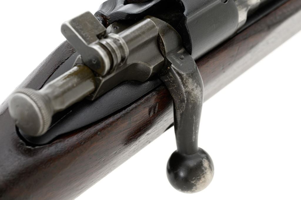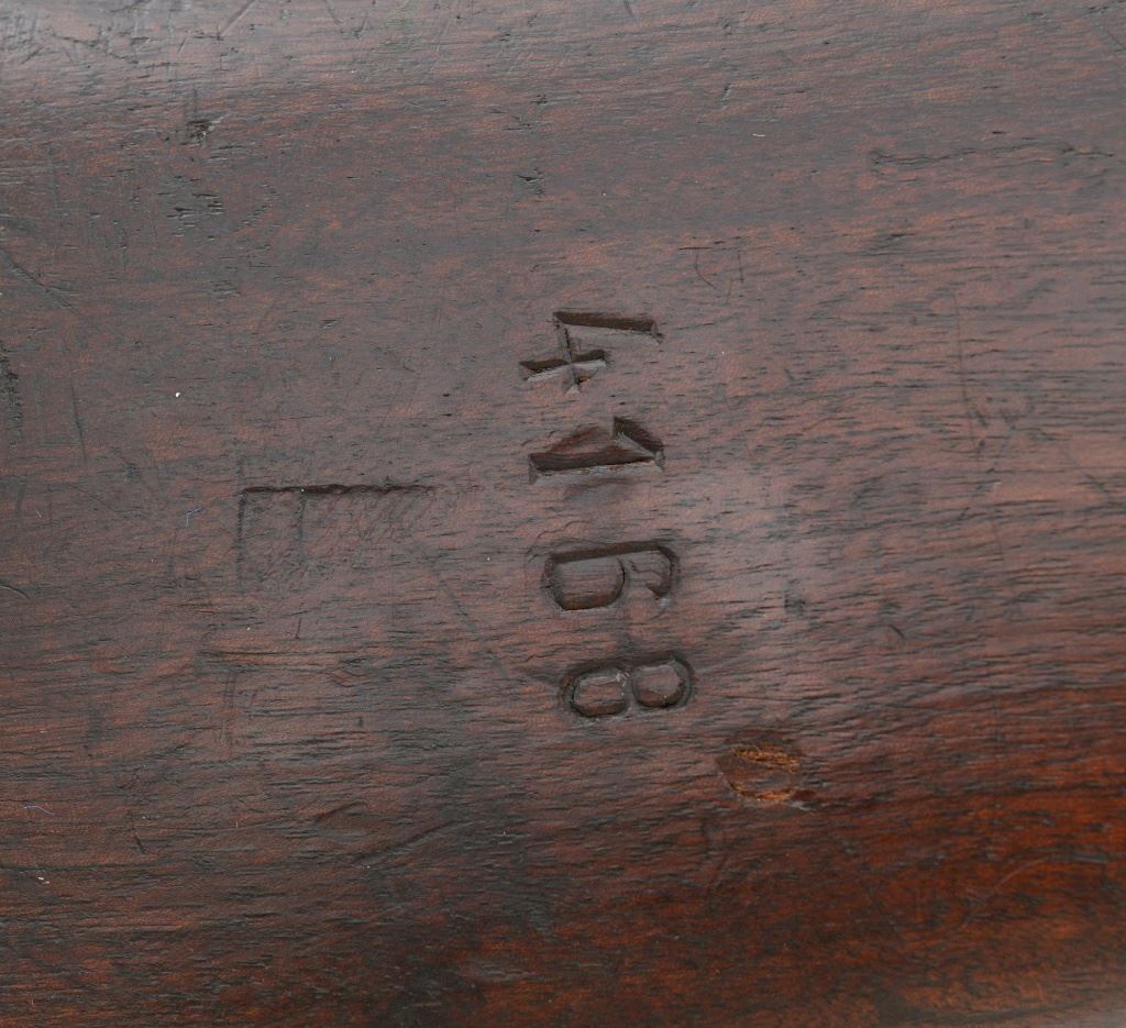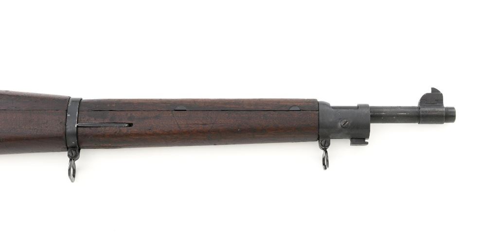 U.S. Springfield Armory Model 1903 Bolt Action Rifle, #74168, .30-06 cal., 24" barrel, black oxide finish, walnut stock, blade front sight, and M1905 adjustable rear sight. Rifle was originally made in 1905 and arsenal rebuilt with mixed parts. Receiver is marked "U.S./SPRINGFIELD/ARMORY/MODEL 1903/74168". Replacement barrel is marked "SA/(Flaming Bomb)/11-42" with a "P" underneath. No visible import marks. Rifle is in very good overall condition, retaining approx. 85%+ arsenal refinish, with wear on the bolt, some scattered high point wear and mild frosting. Pistol grip stock is cut for a 03-A3 and marked "RA-P" (Raritan Arsenal) on the left side, "1468" on the right side, with an "S" and "U" on the pistol grip. Stock is good, with scattered dents and scratches, heavier in front of the barrel band and on the right side below the receiver. Action works properly. Bore is very good showing normal light wear. Est.: $800-$1,200. (C&R)