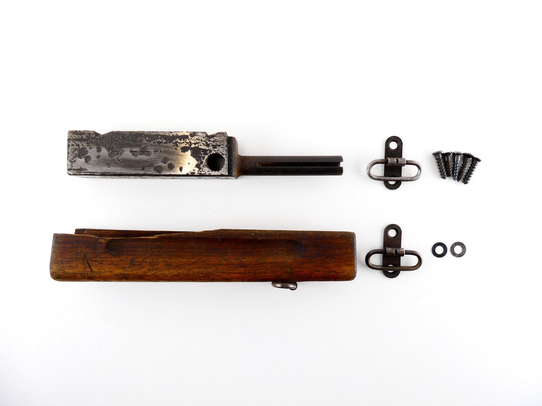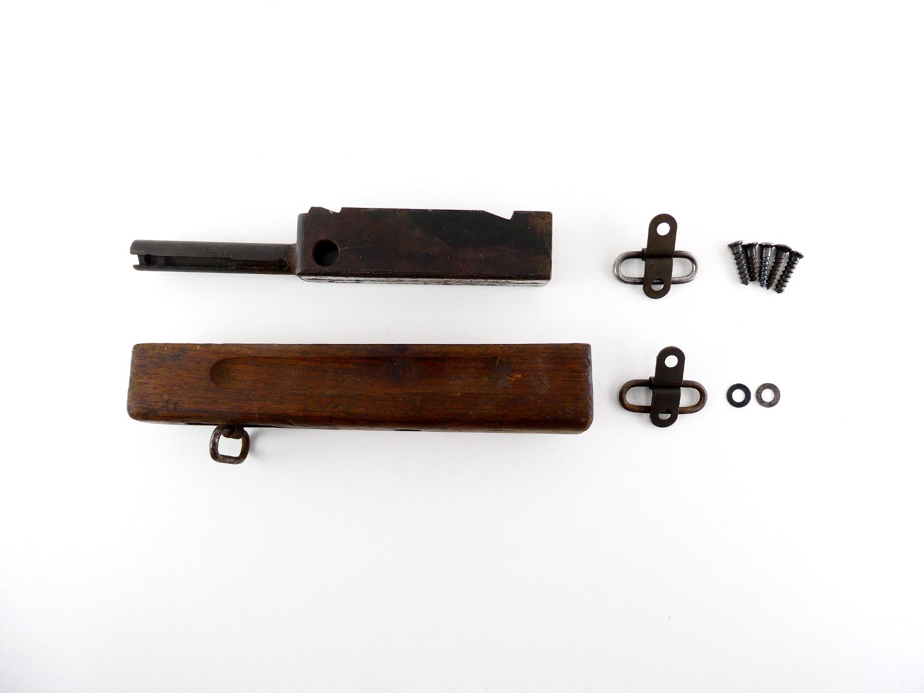 FITS M1A1 / 1928A1 MODELS, INCLUDES; (1) FOREND WITH SWIVEL, WOOD DAMAGED, (1) STRIPPED BOLT, BLUED STEEL CONSTRUCTION, (2) SWIVELS WITH SCREWS, ETC. MAY REQUIRE FITTING. SEE PHOTOS.