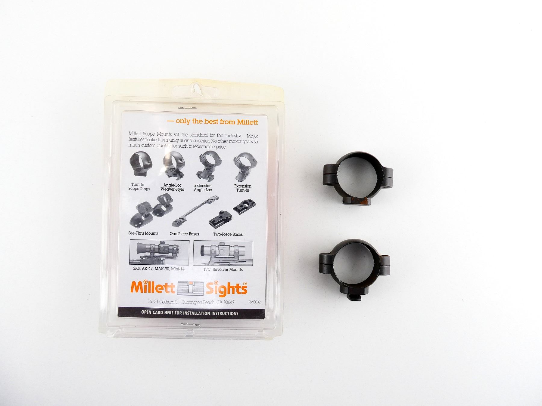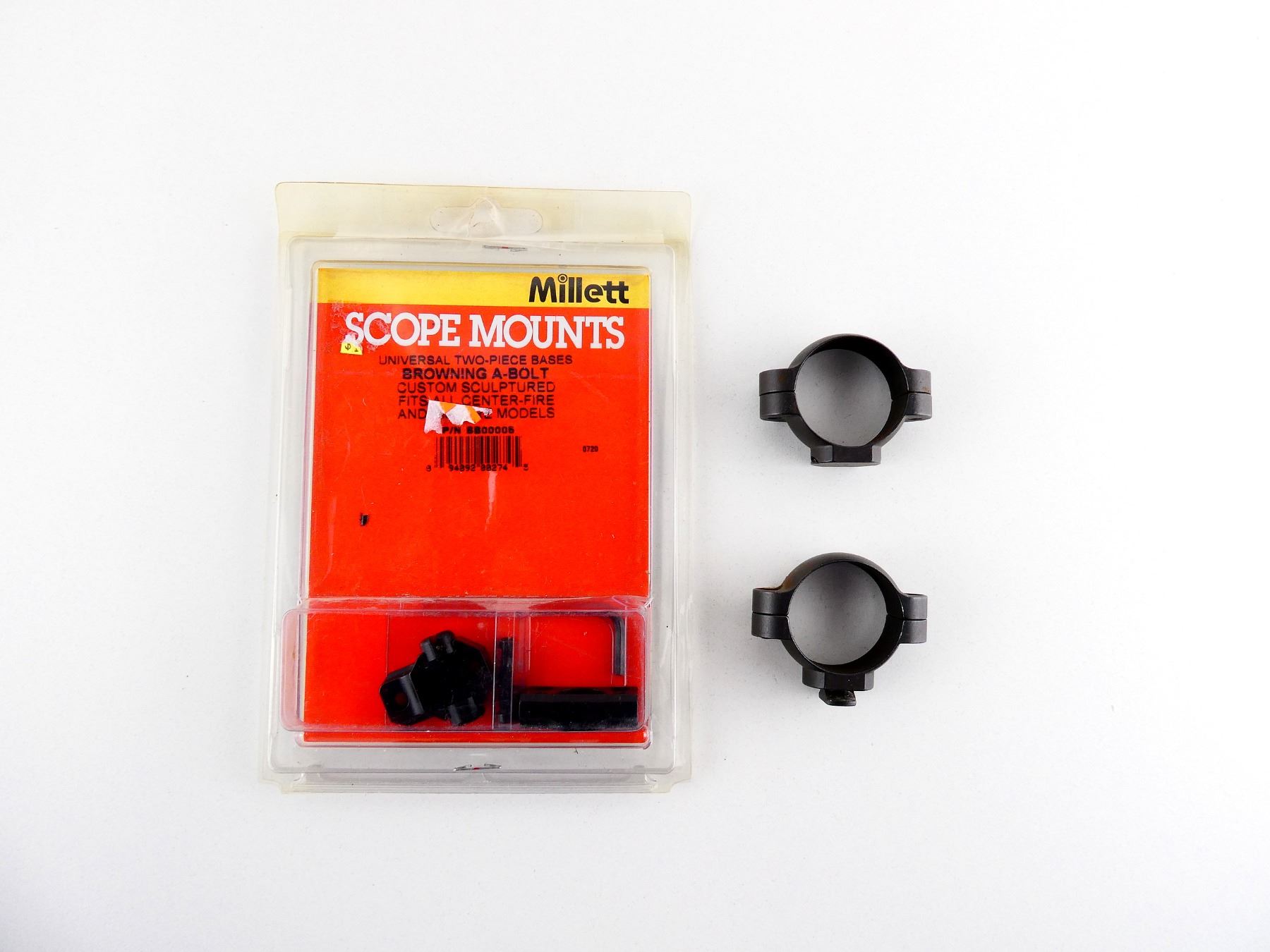LOT INCLUDES; (1) SET OF UNKNOWN 30MM SCOPE RINGS, BLUED STEEL CONSTRUCTION, MAY NOT BE COMPLETE & (1) MILLETT BROWNING A-BOLT SCOPE RING BASES, BLACK STEEL CONSTRUCTION, PART #: BB00005, APPEARS NEW OLD STOCK IN ORIGINAL PACKAGING, MAY NOT BE COMPLETE. MAY REQUIRE FITTING. SEE PHOTOS.