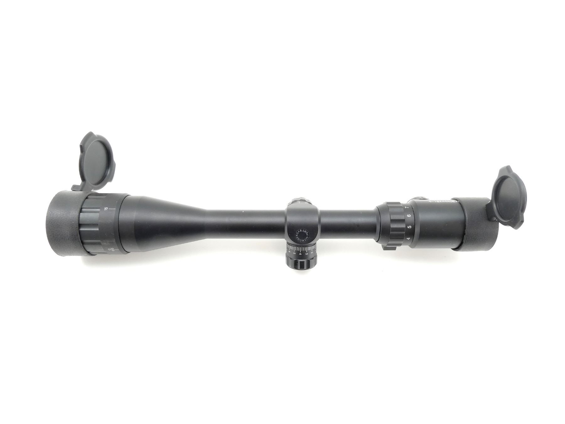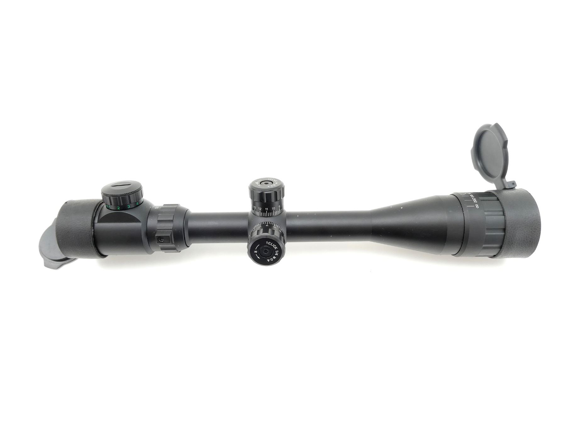(1) CLEAR OPTICS, UNTESTED RED / GREEN DOT MULTI-FUNCTION RETICLE, WITH VARIOUS BRIGHTNESS SETTINGS, 1" TUBE DIAMETER, WORKING MAGNIFICATION RING, WINDAGE & ELEVATION KNOBS TURN, MARKED: "4-16X44MMAOEYS", ETC., SHOWS SOME WEAR & TEAR / USE MARKS, WITH FLIP-UP LENS COVERS. MAY REQUIRE FITTING. SEE PHOTOS.
