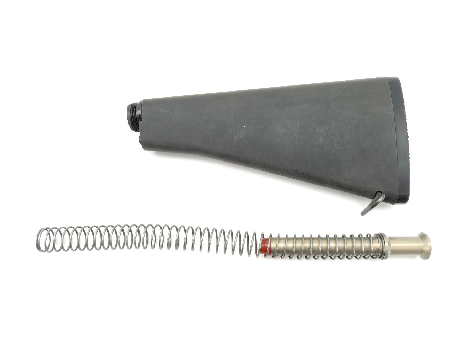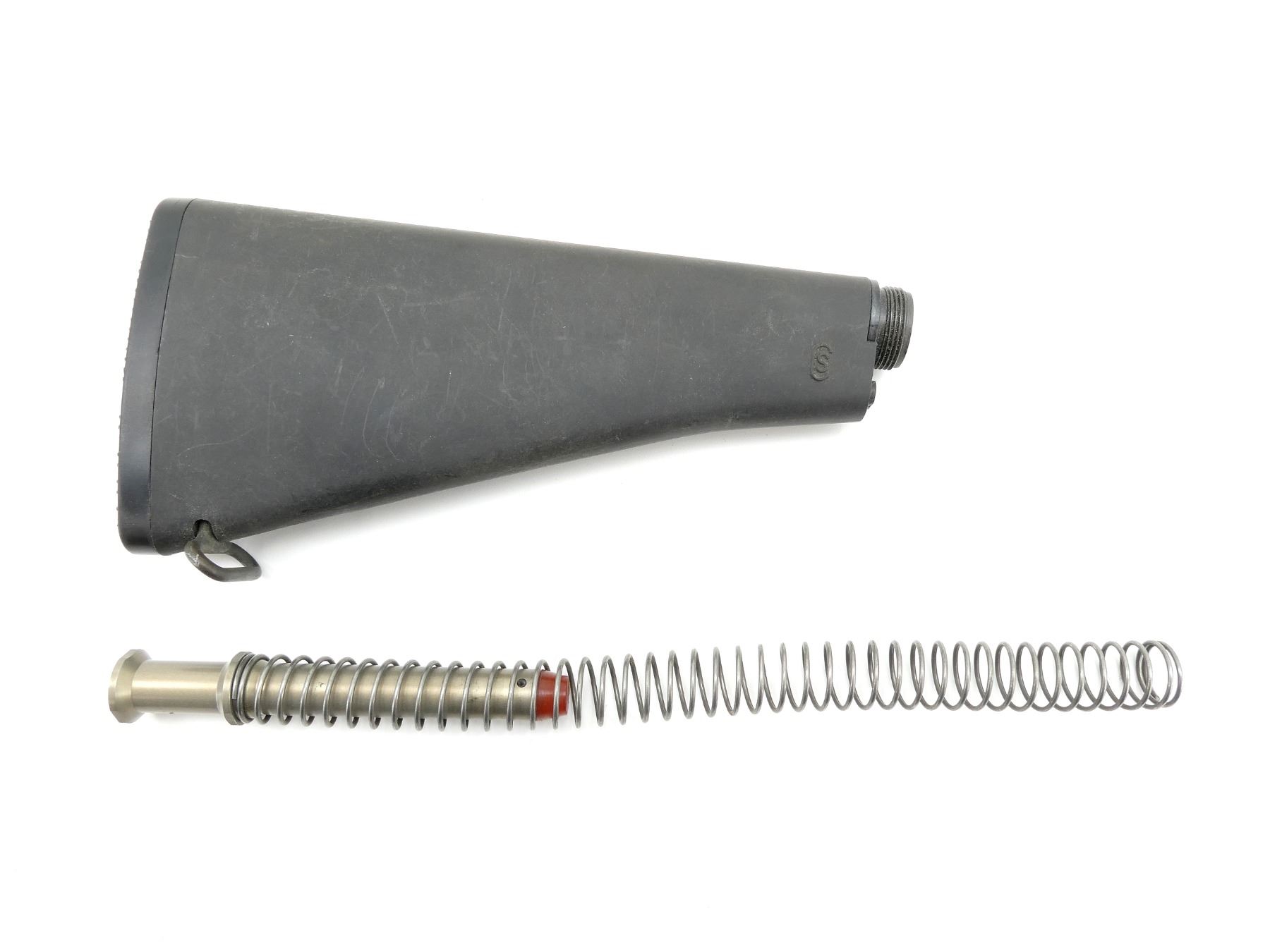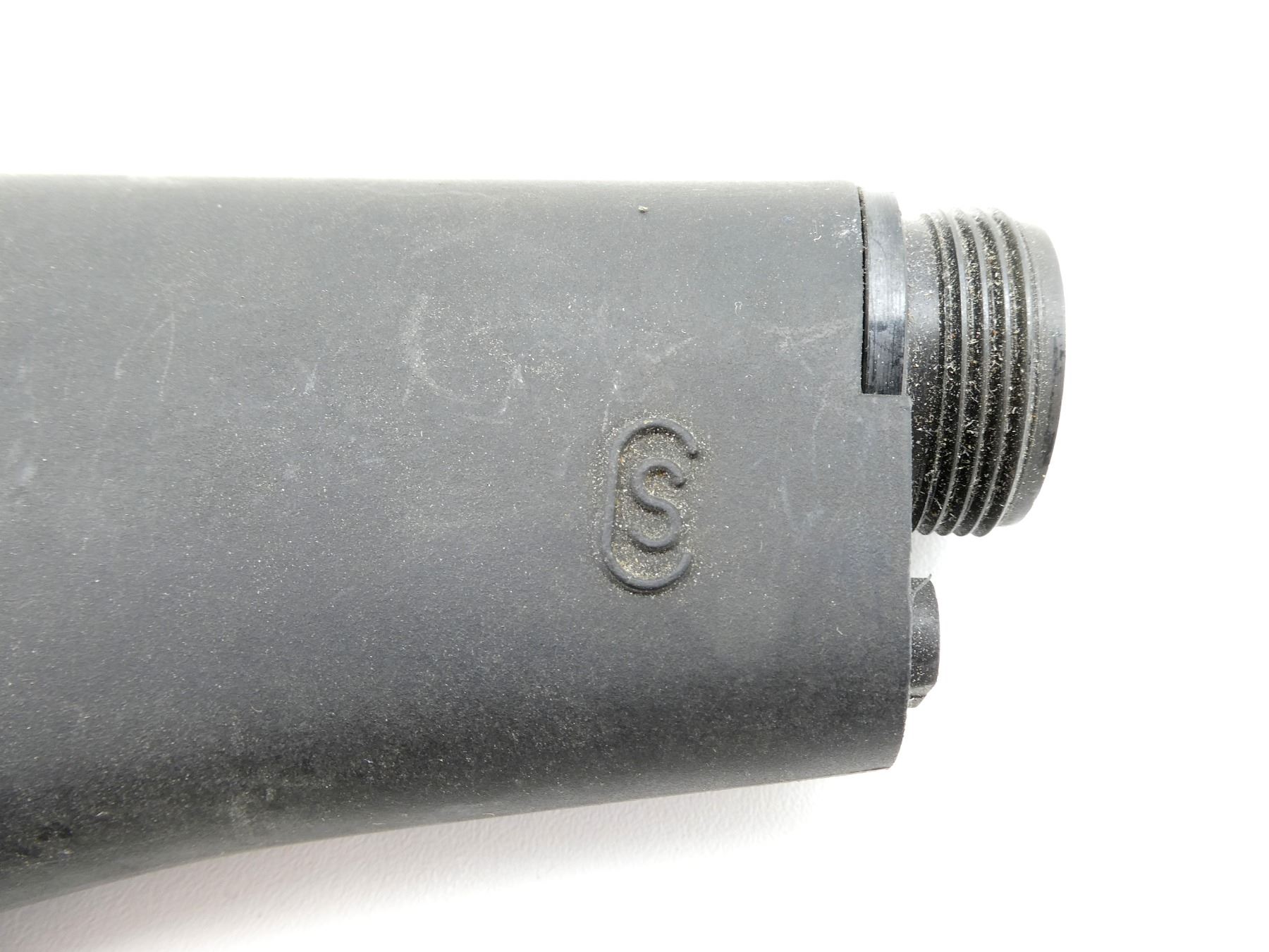 (1) BUTT STOCK ASSEMBLY APPEARS COMPLETE, INCLUDES; BUTT PLATE, BUFFER TUBE, BUFFER & SPRING, SHORT LENGTH, BLACK POLYMER CONSTRUCTION, MARKED "S", OVERALL LENGTH APPROX. 10.5". MAY REQUIRE FITTING. SEE PHOTOS.
