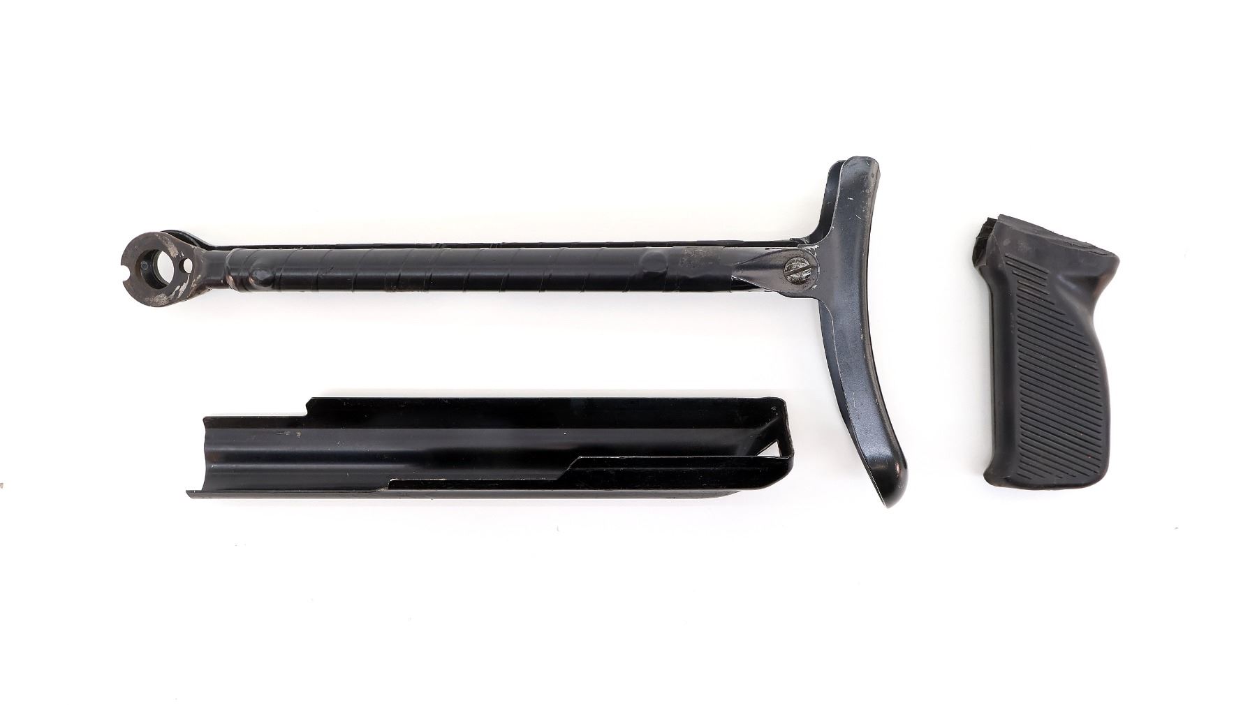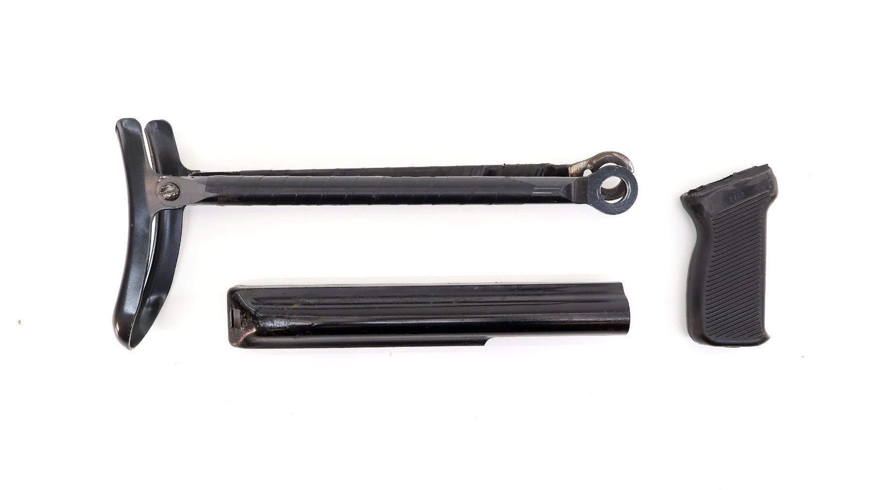 LOT INCLUDES; (1) FOLDING BUTT STOCK, BLUED STEEL CONSTRUCTION (WRAPPED IN TAPE), (1) SMOOTH TOP COVER, BLACK PAINTED STEEL CONSTRUCTION & (1) GROOVED BLACK POLYMER PISTOL GRIP. MAY REQUIRE FITTING. SEE PHOTOS.