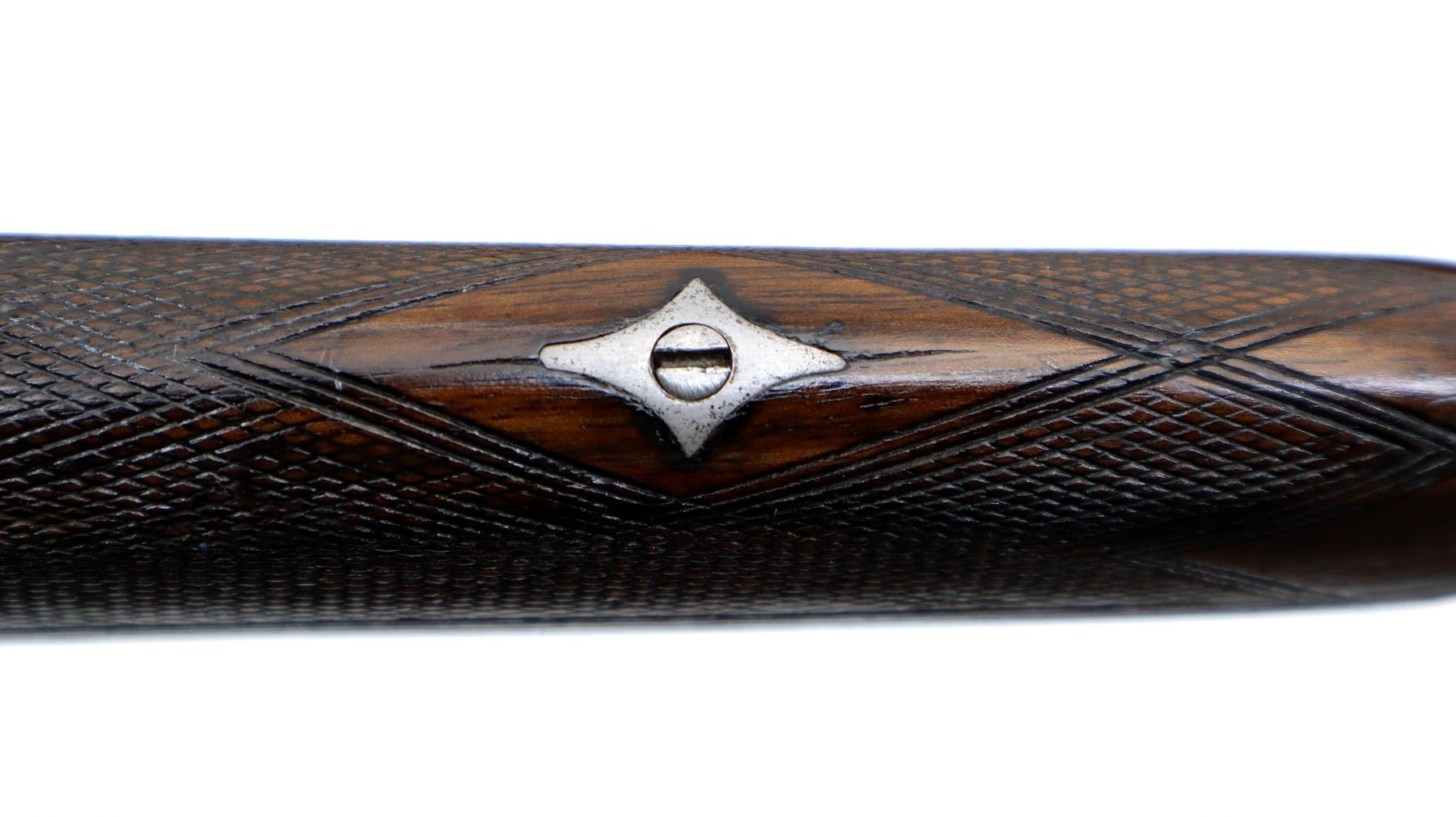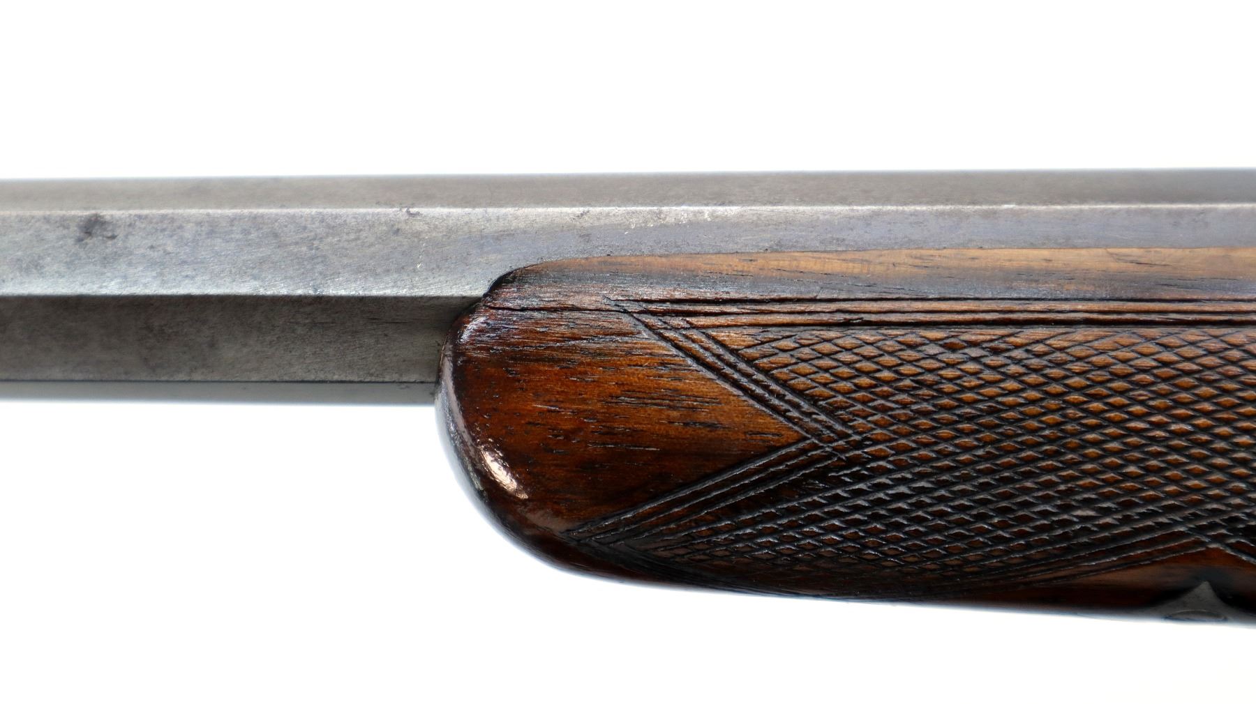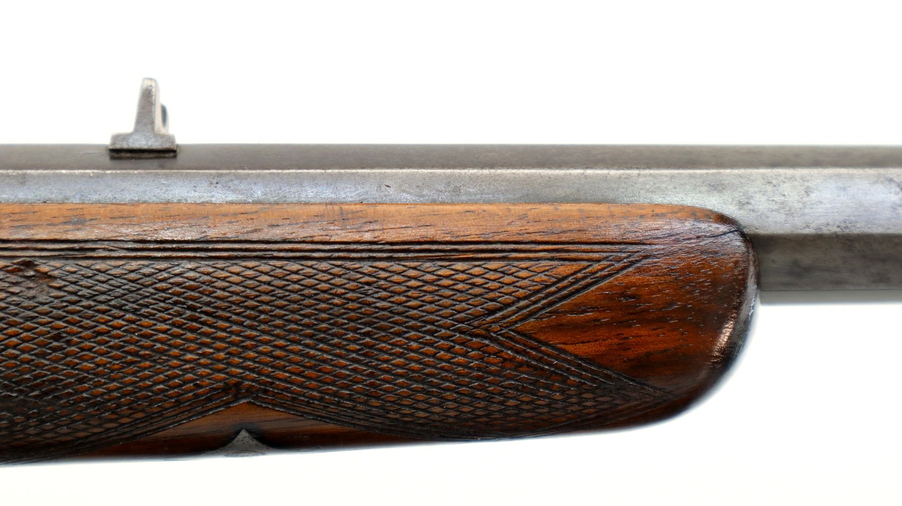 Main Description: Blade front sight, u notched rear sight, octagon barrel, short lever. Two piece wood stocks, checkered forearm cracked at tip on both sides, checkered straight grip, smooth curved steel butt plate