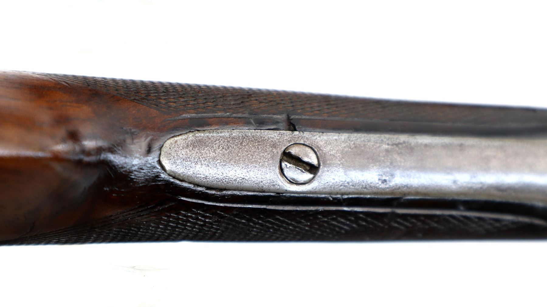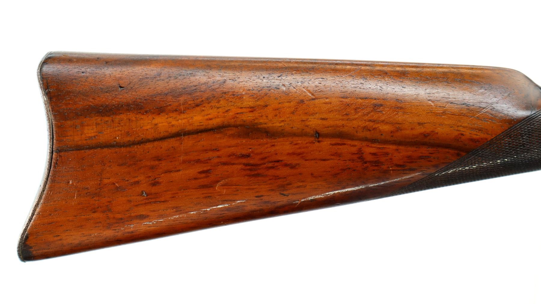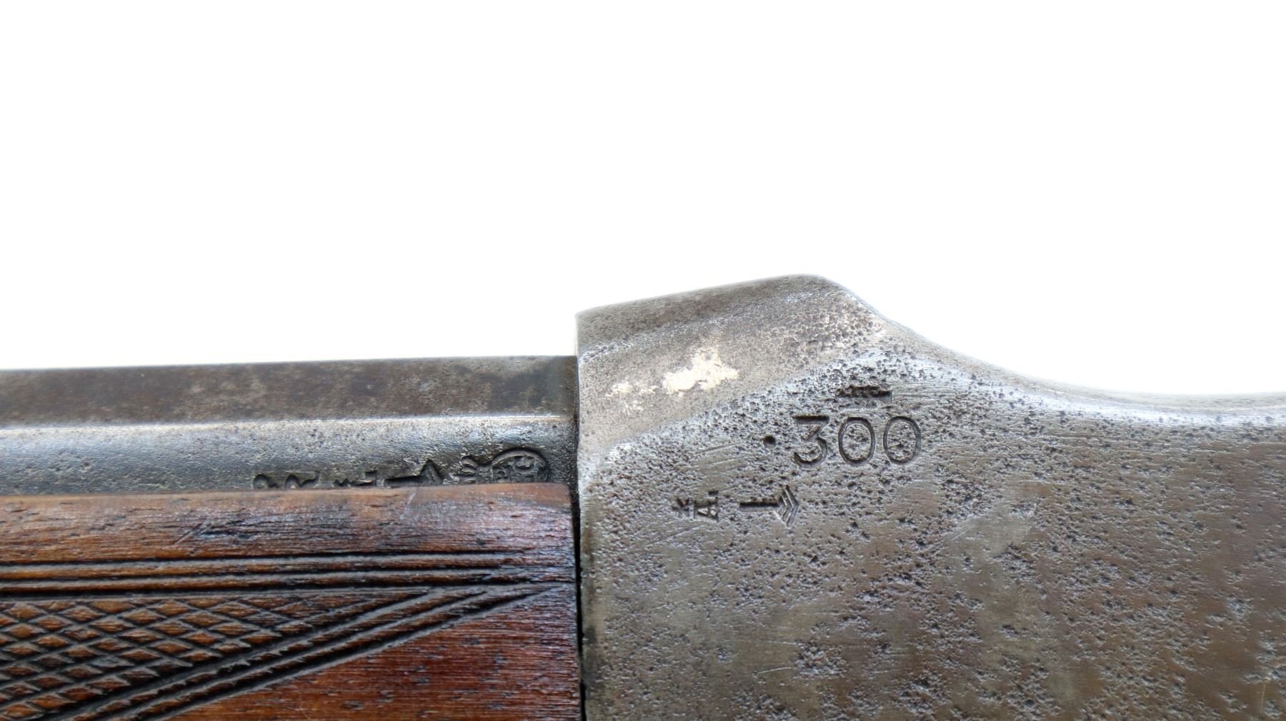 Main Description: Blade front sight, u notched rear sight, octagon barrel, short lever. Two piece wood stocks, checkered forearm cracked at tip on both sides, checkered straight grip, smooth curved steel butt plate