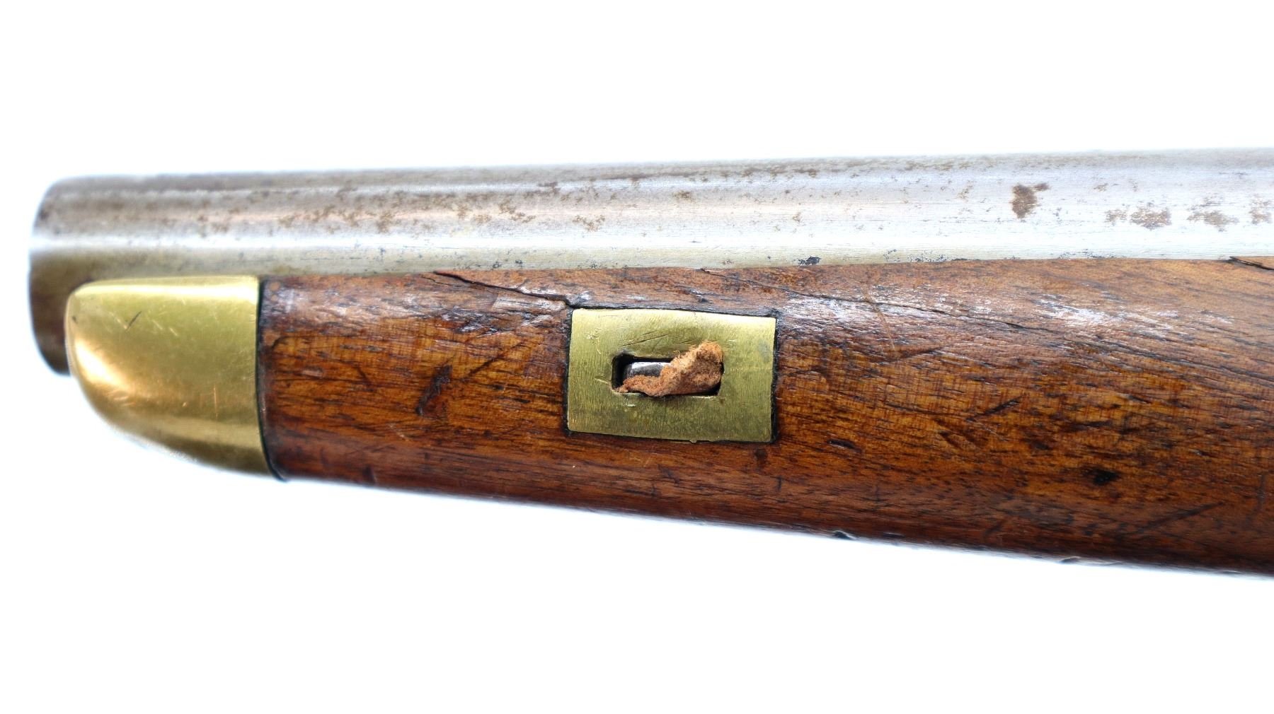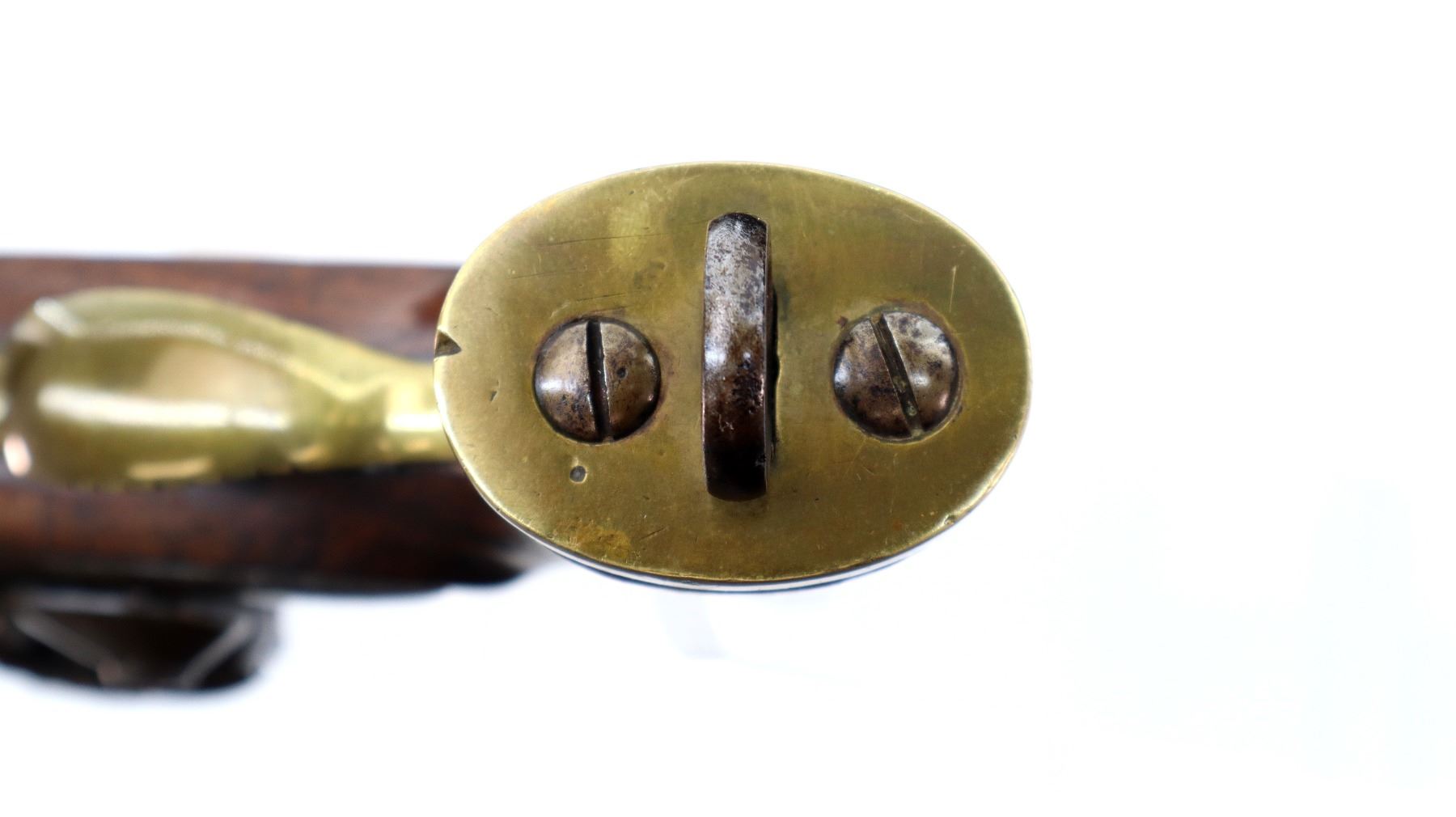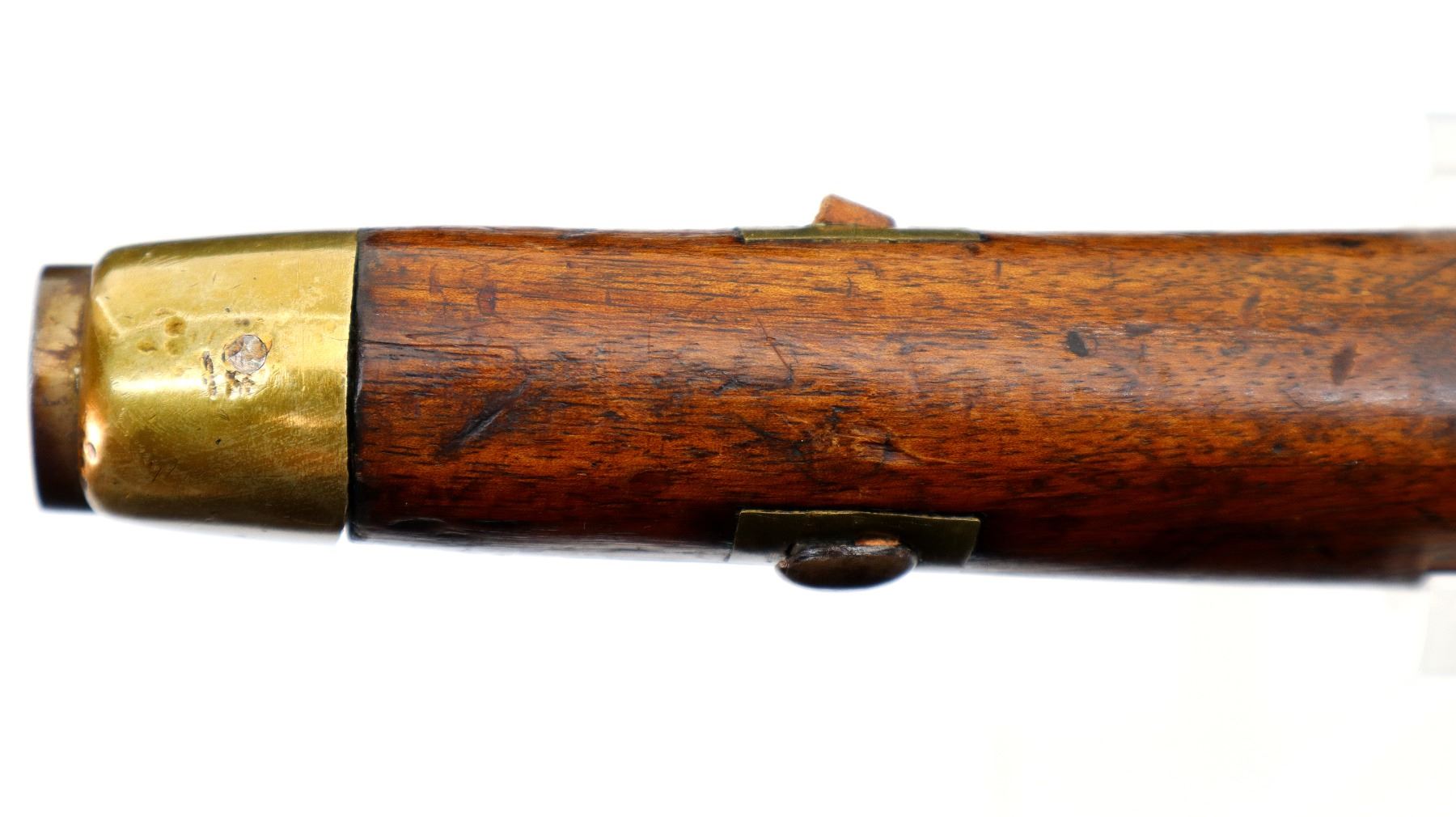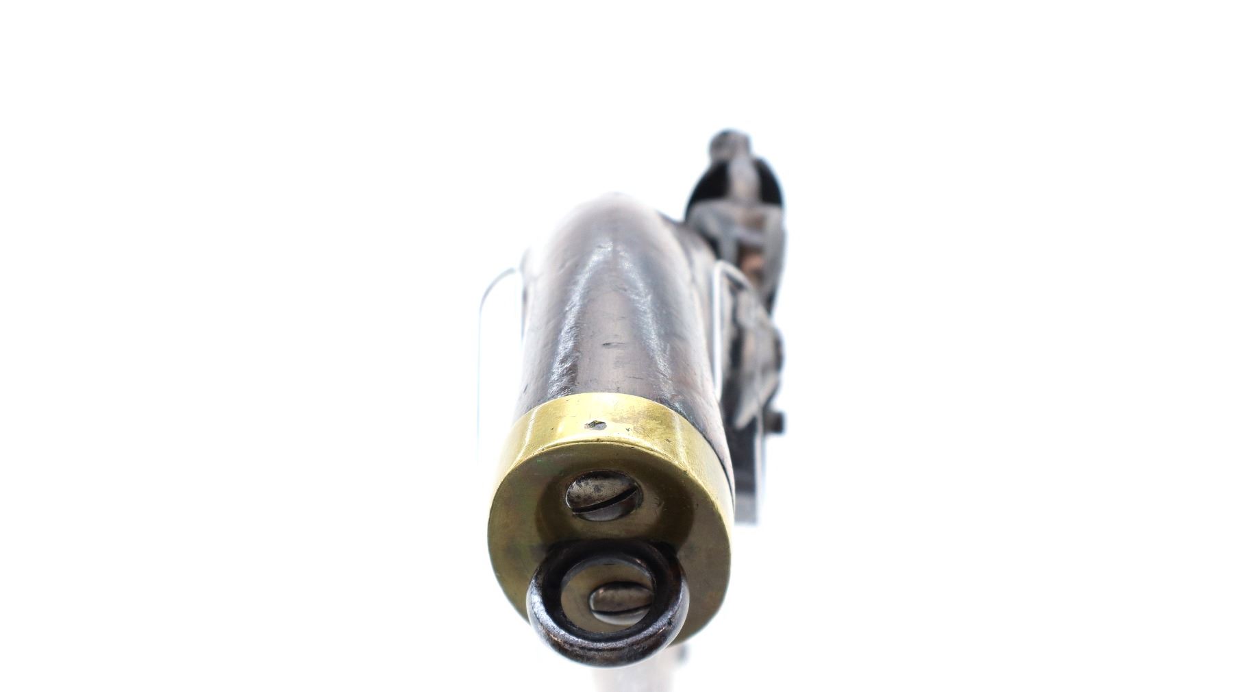 Main Description: No sights, tapered round barrel, smooth lock with initials CL logo, hammer and frizzen that function. One piece wood grip, forearm is cracked with single wedge, pistol grip, brass pommel cap with steel ring, stock cracked on left side, brass trigger guard and nose cap.
