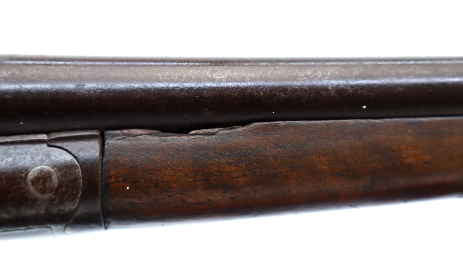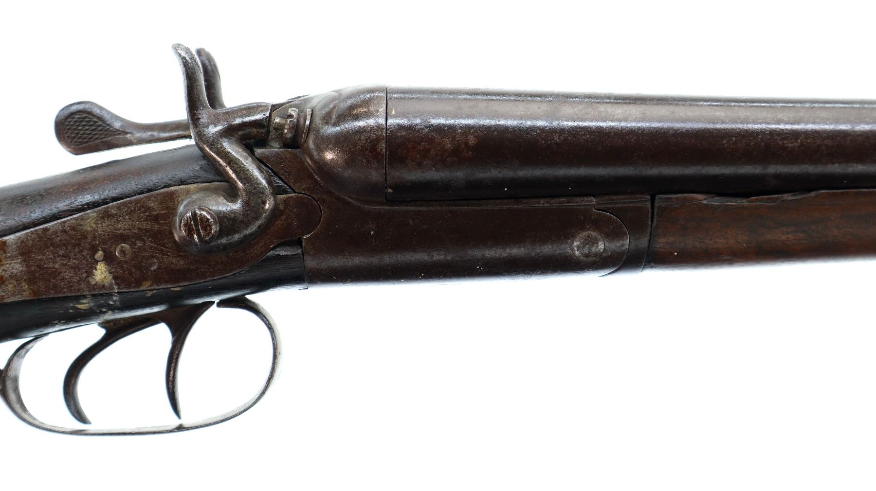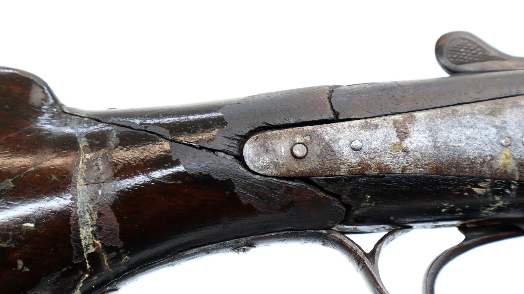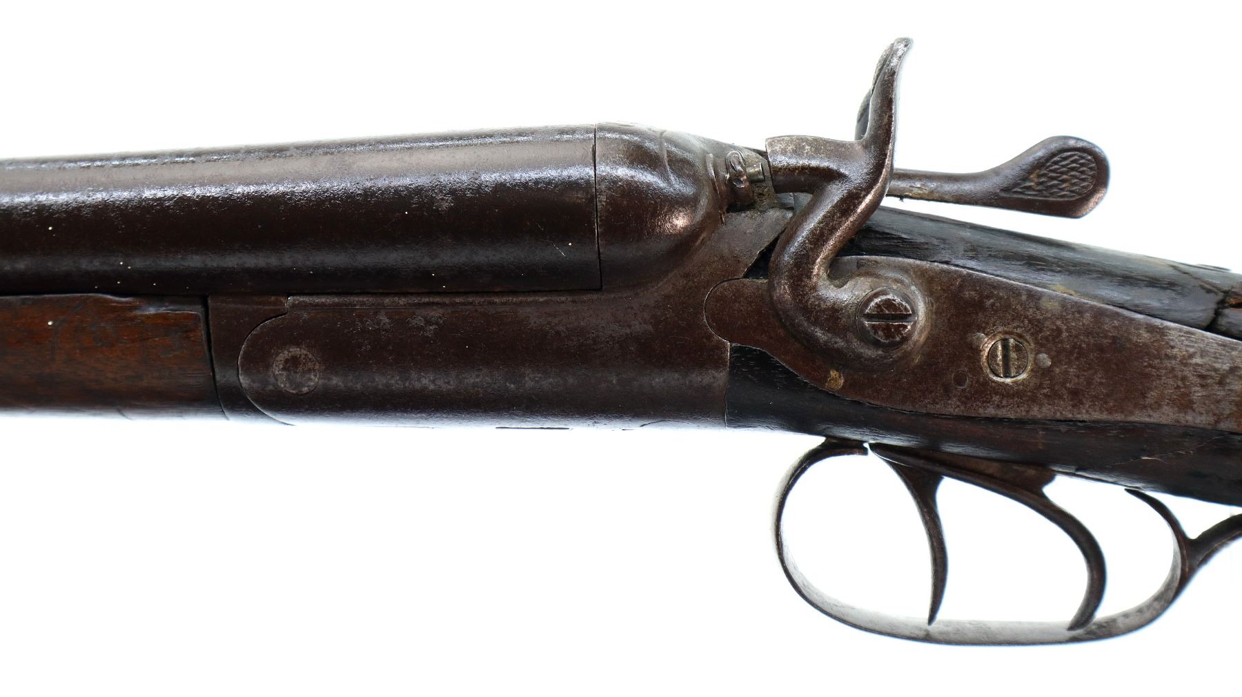 Main Description: Brass bead, smooth rib, barrels are loose on face, back action locks with checkered spur hammers that function, extractor, double triggers. Two piece wood stocks, forearm is chipped, pistol grip chipped cracked and broken behind receiver, locks and tangs, cheek rest, grooved steel butt plate, sling swivels.