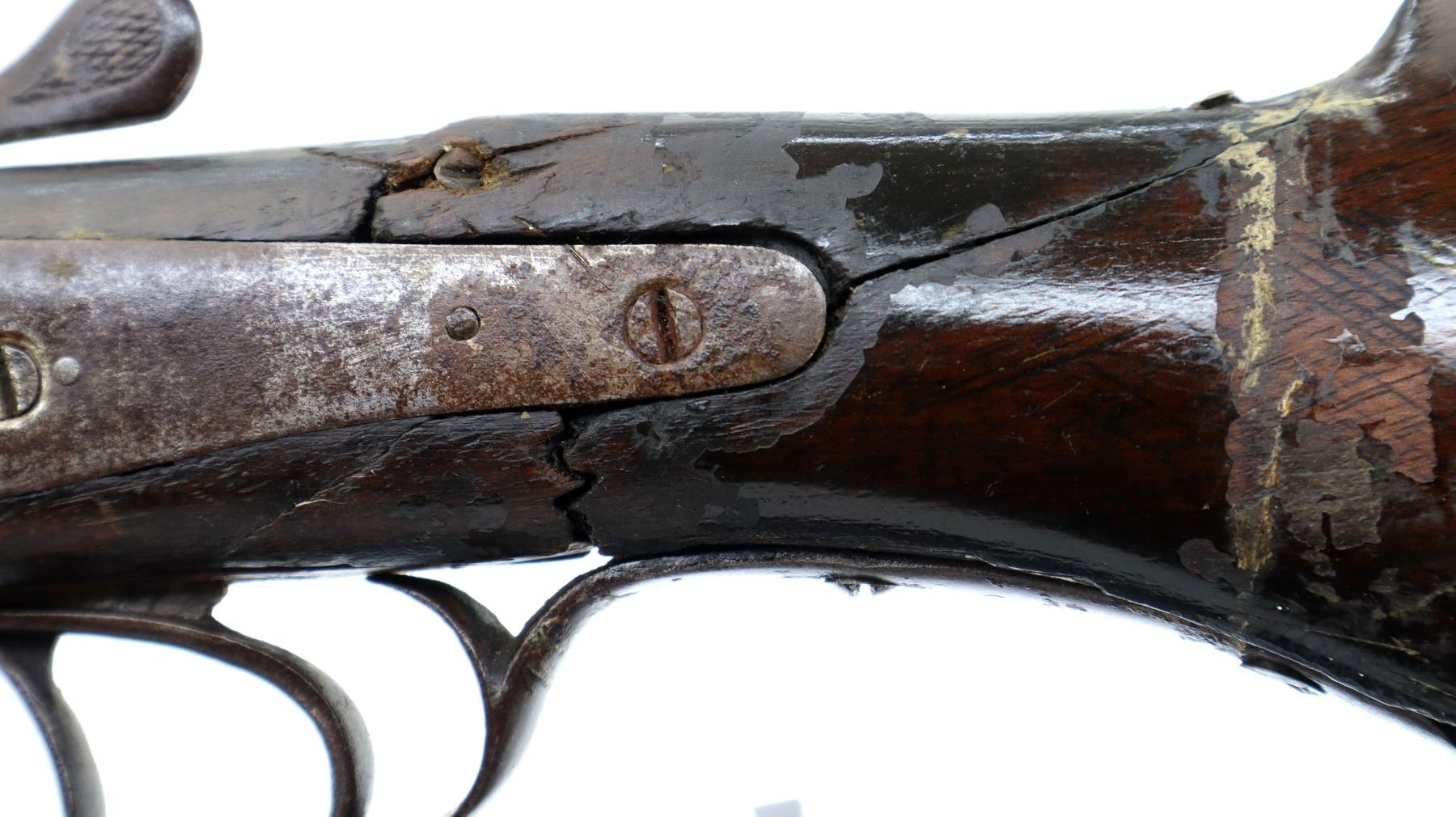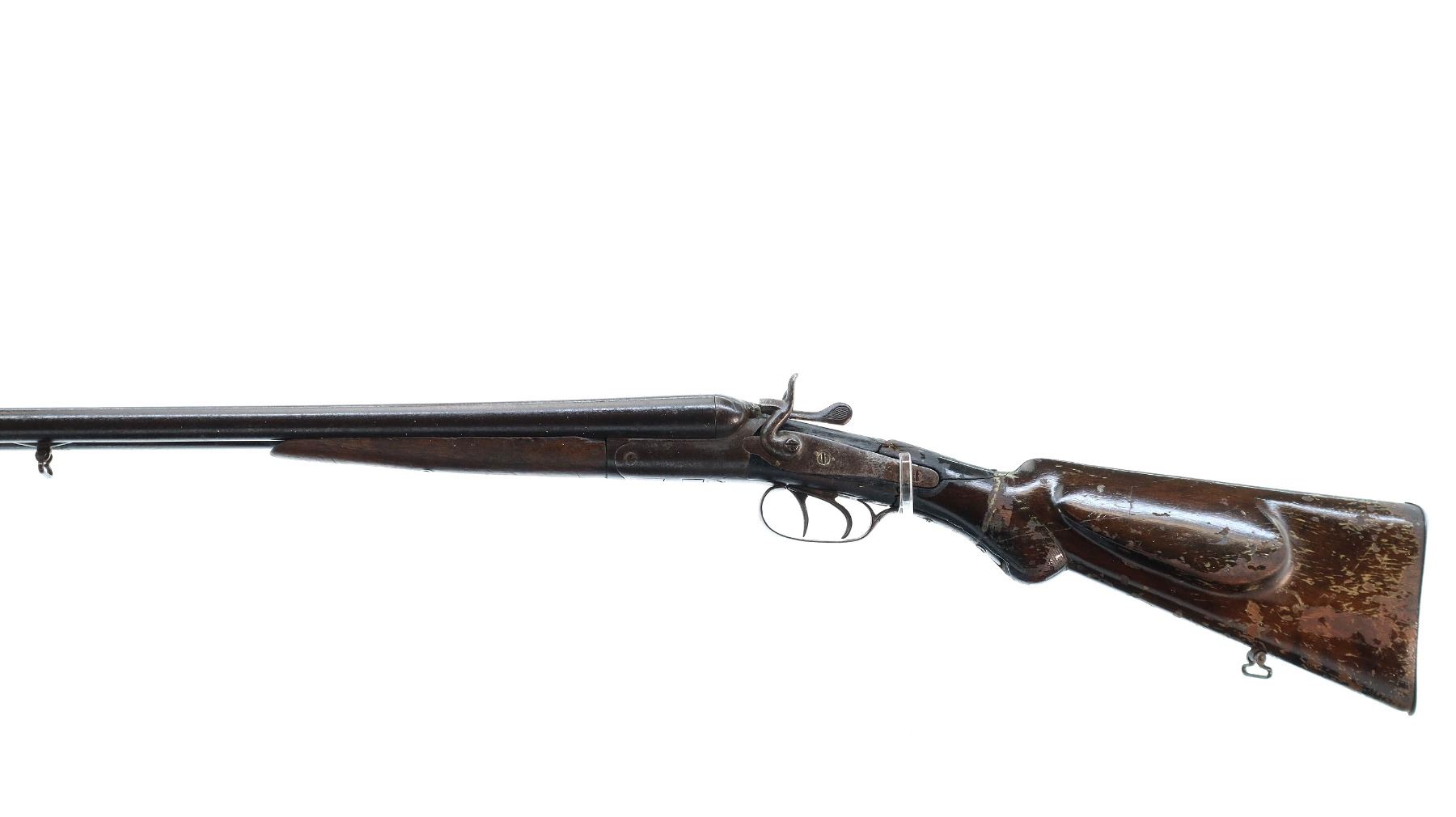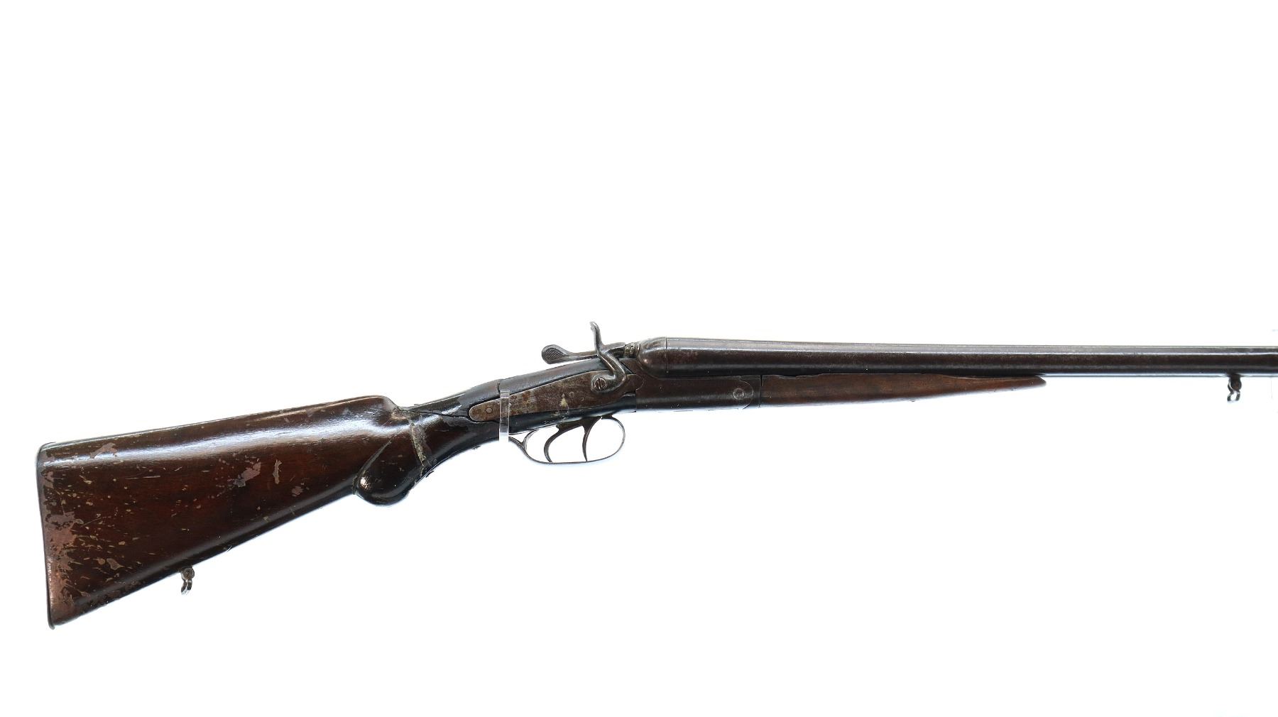 Main Description: Brass bead, smooth rib, barrels are loose on face, back action locks with checkered spur hammers that function, extractor, double triggers. Two piece wood stocks, forearm is chipped, pistol grip chipped cracked and broken behind receiver, locks and tangs, cheek rest, grooved steel butt plate, sling swivels.