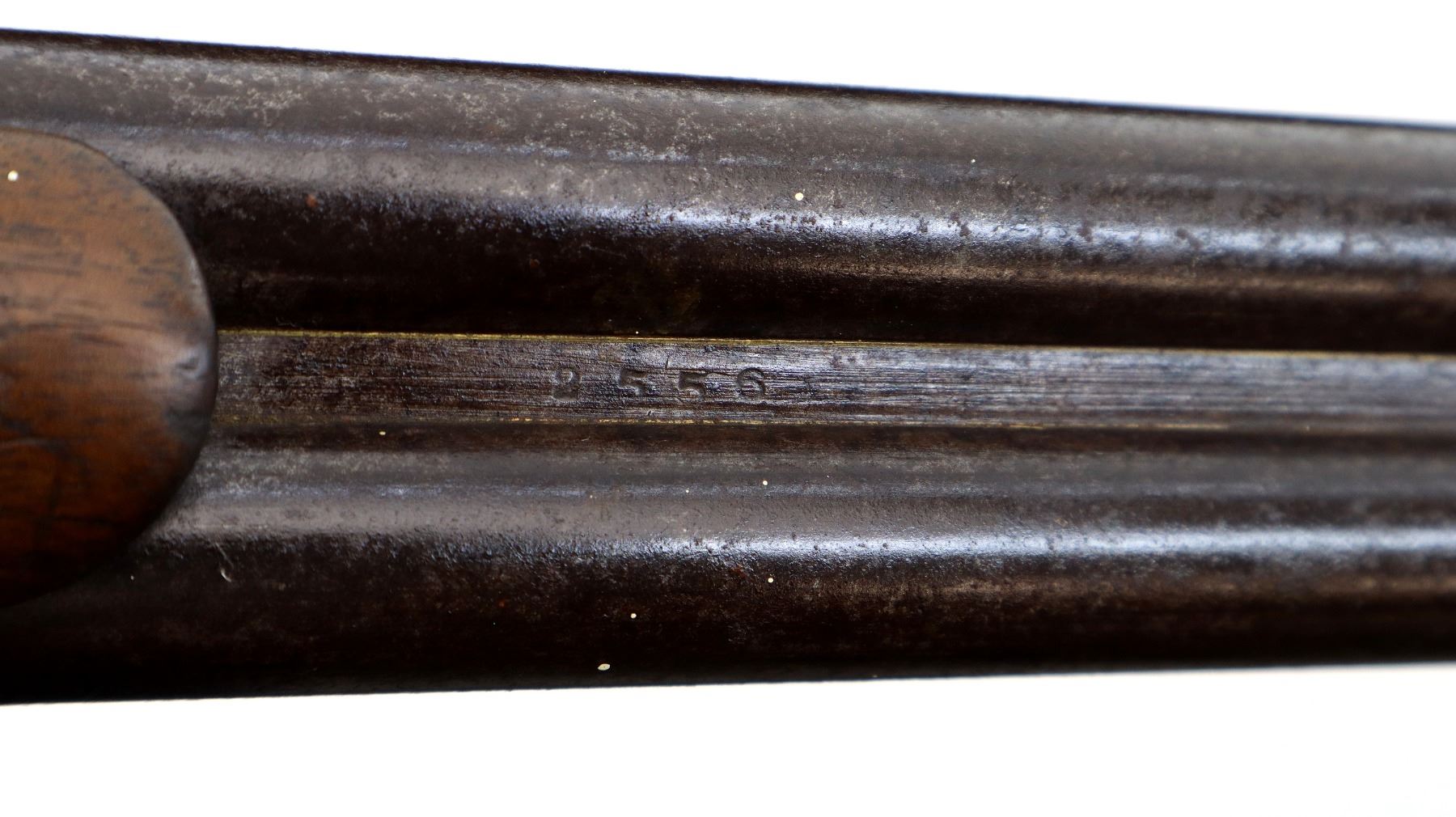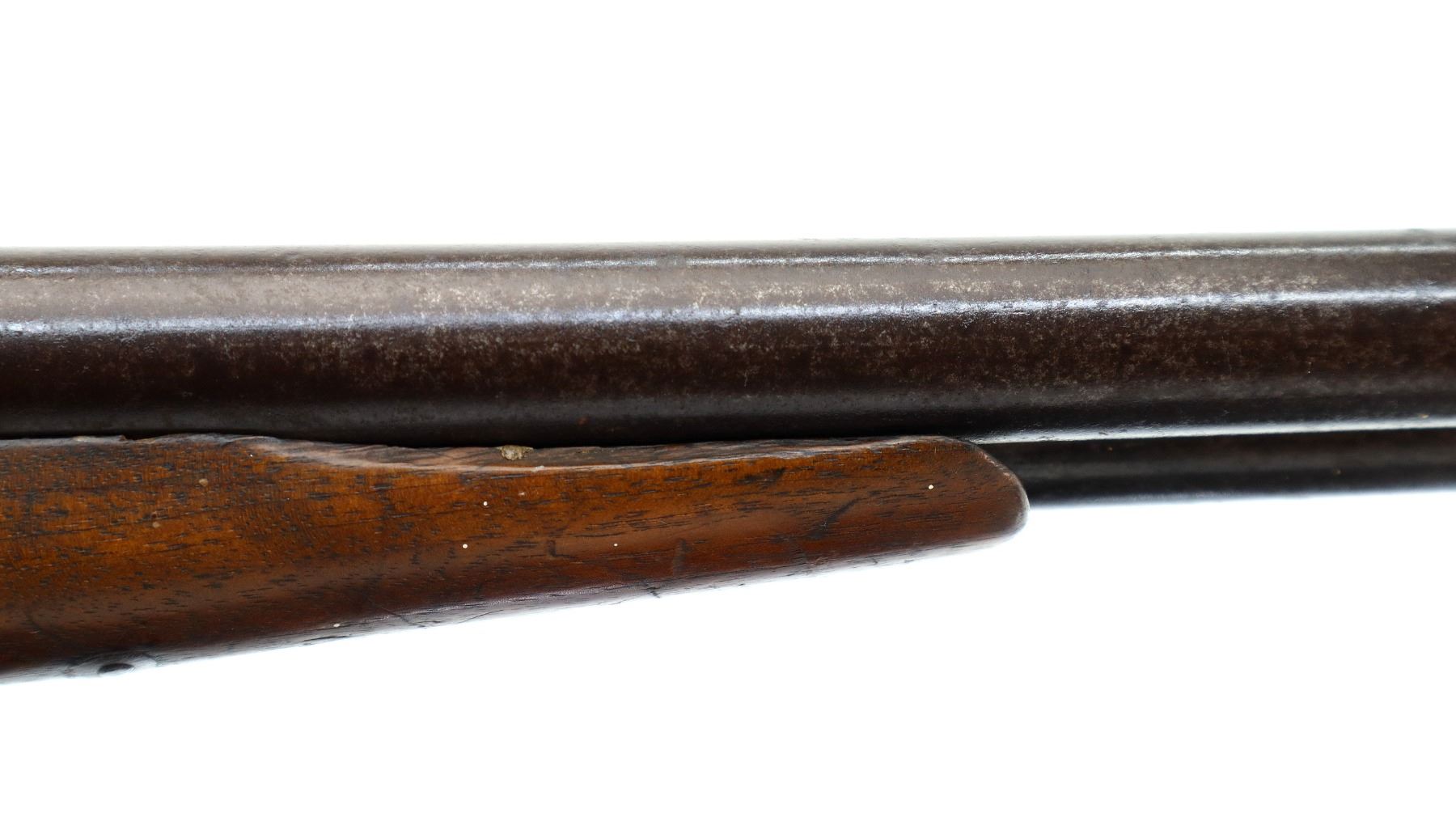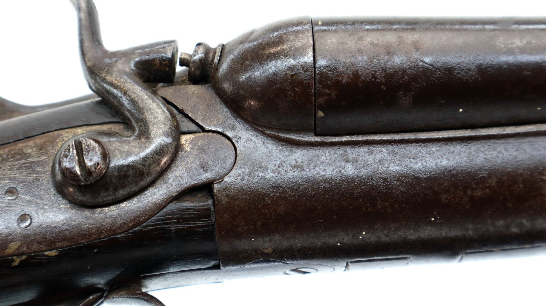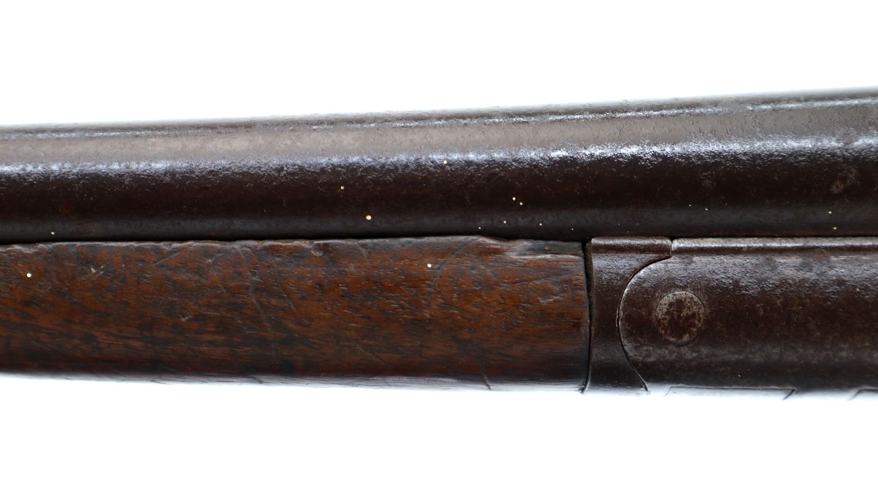 Main Description: Brass bead, smooth rib, barrels are loose on face, back action locks with checkered spur hammers that function, extractor, double triggers. Two piece wood stocks, forearm is chipped, pistol grip chipped cracked and broken behind receiver, locks and tangs, cheek rest, grooved steel butt plate, sling swivels.