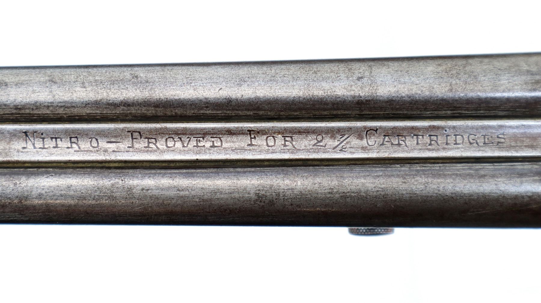 Main Description: Brass bead, smooth rib marked Nitro Proof for 2 1/2 Cartridges, checkered spur hammers that function , missing left firing pin, opening lever on right side, extractor, double triggers. Two piece wood stocks, straight grip, smooth steel butt plate