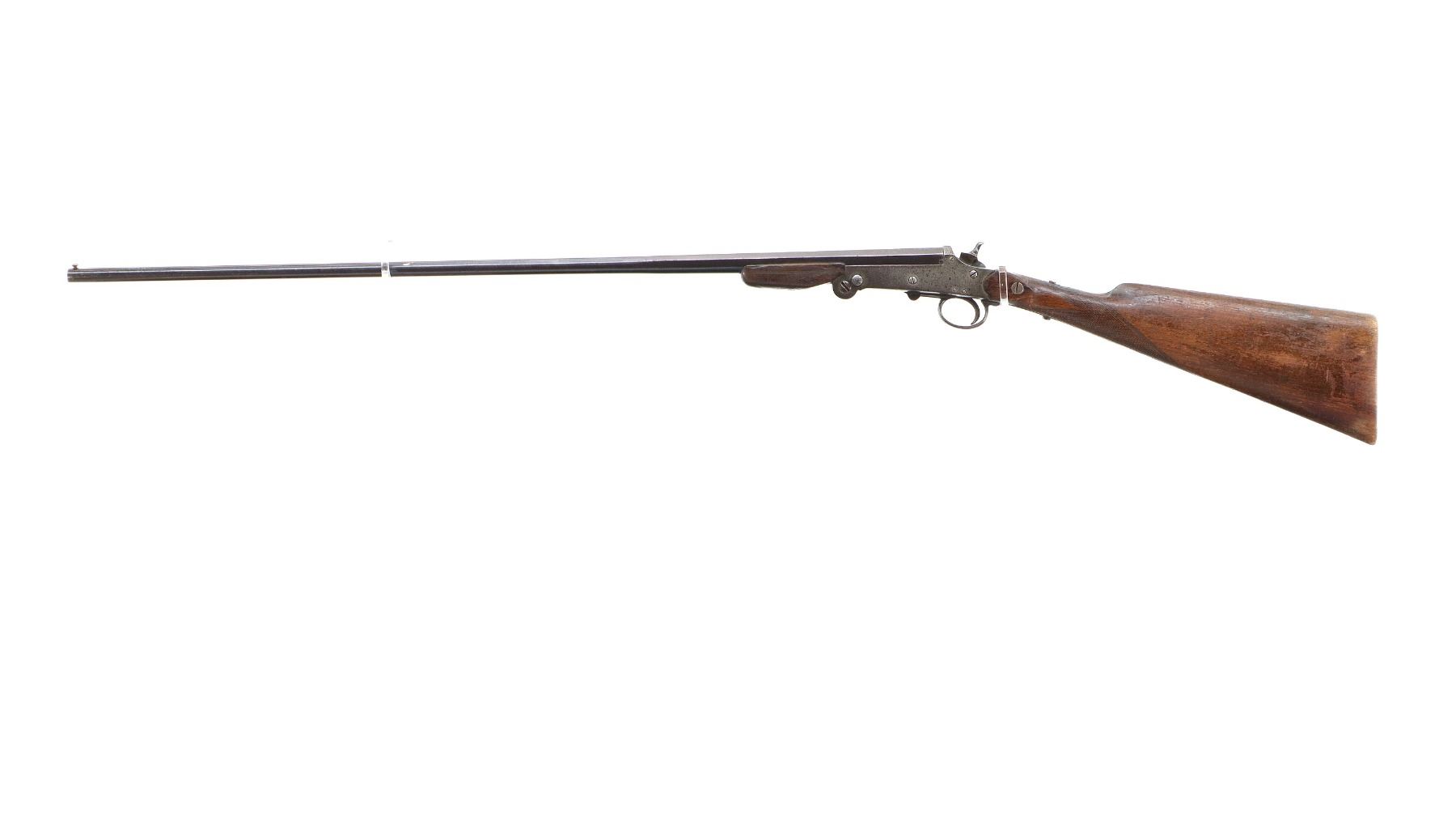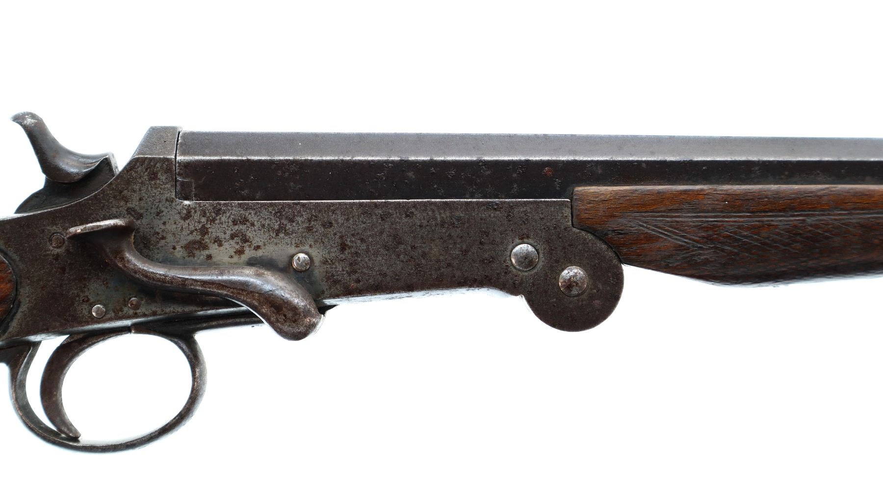 Main Description: Replaced bead, blued finish, checkered spur hammer and opening lever, extractor. Two piece wood stocks, checkered forearm (chipped) and straight grip, cracked behind receiver, tang screw replaced, grooved butt small chip at toe.